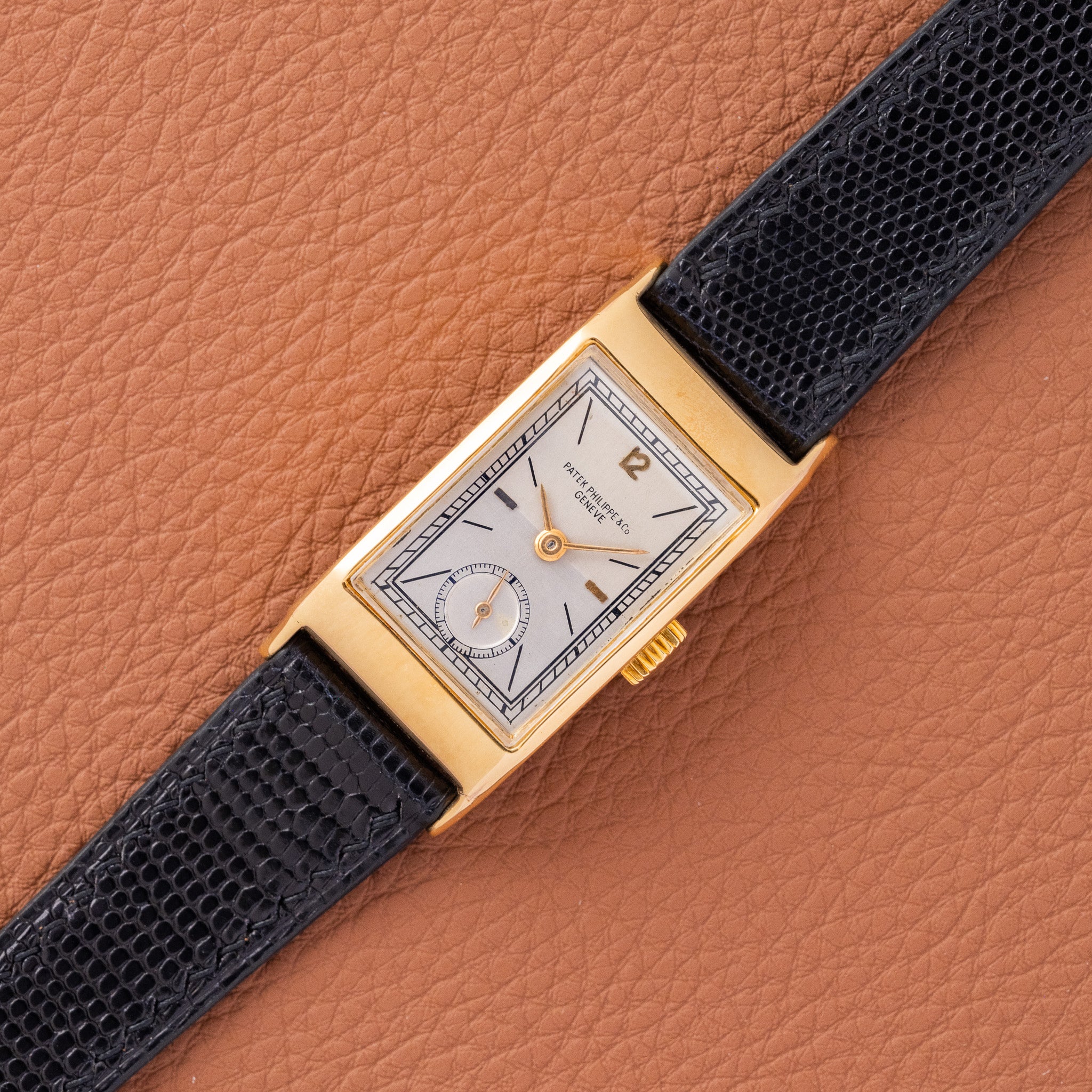 The dials of this reference were produced by Stern Frères, and in the finest tradition of early Patek Philippe, feature hand-applied raised enamel signatures. This finishing technique gave the lettering and minute tracks a unique texture, distinguishable even today as a marker of originality. Inside, the manually wound caliber 9-90 provided precise timekeeping in a compact, elegant form, making it one of Patek’s most admired early rectangular calibers.