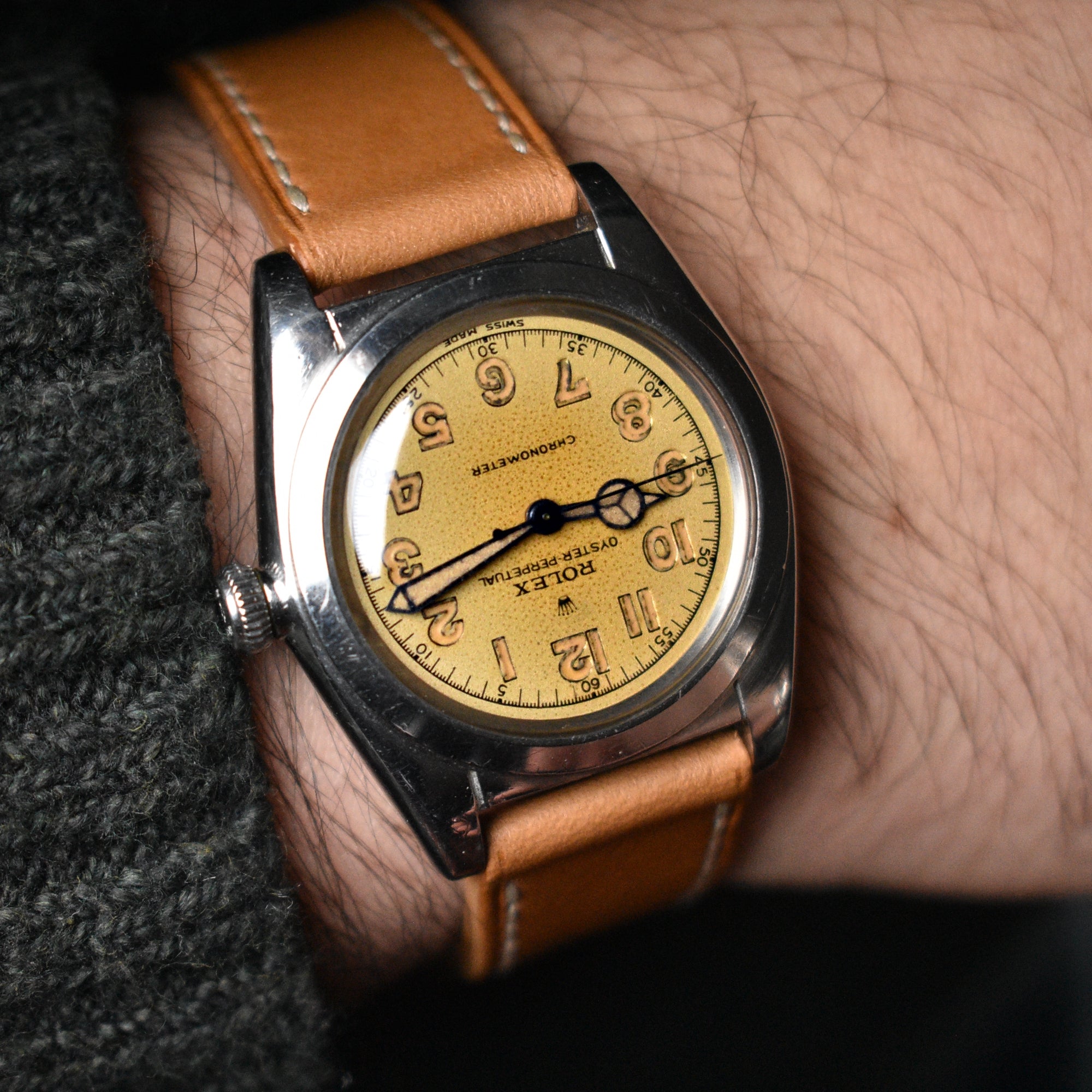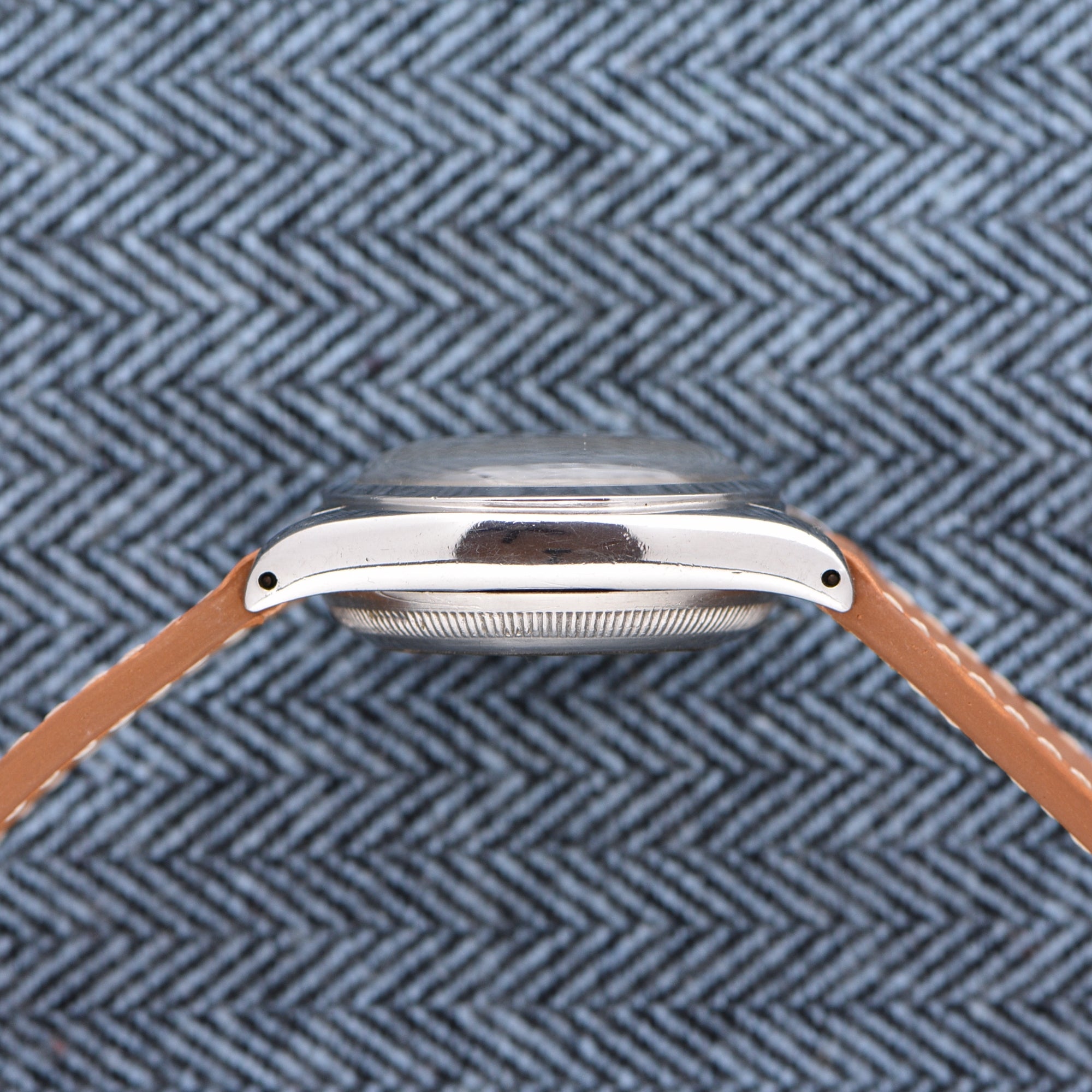 The reference 2940 was introduced in the 40s and featured a handful of different dial and hand configurations. The one we have here comes from the WW2 Era with large blued hands and a very unique dial. The dial, which has gained a very cool speckled patina, features hour markers that are actually engraved into the dial and then filled with lume.