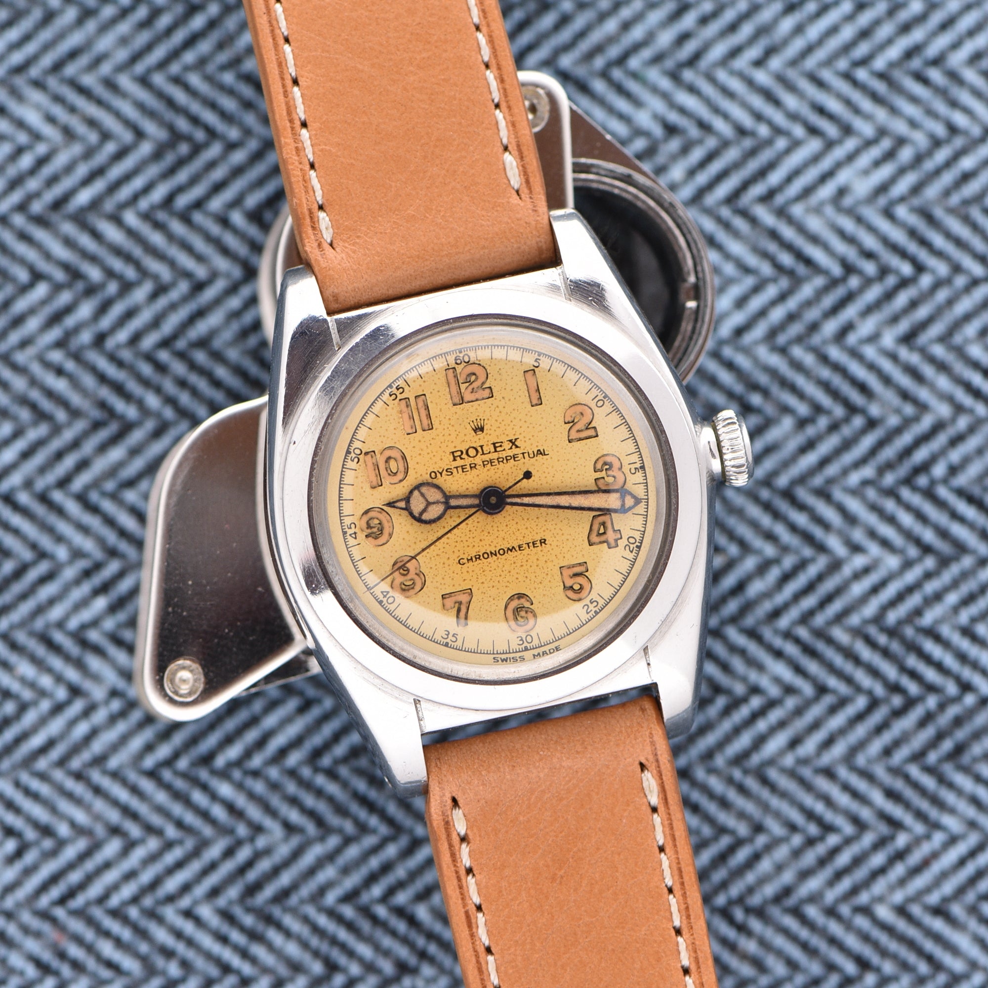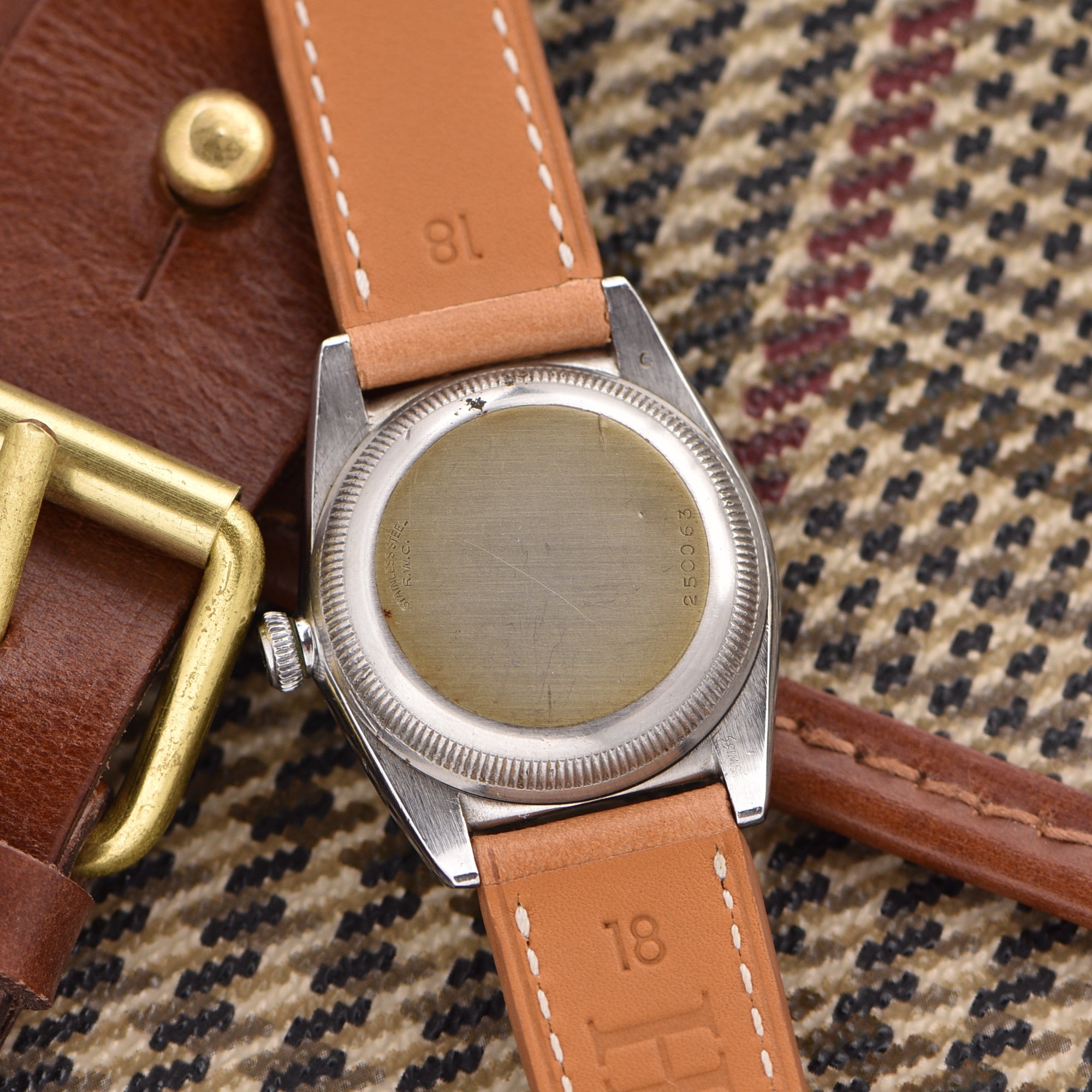 The Bubble Back category, manufactured between 1933 and 1955, is a vintage Rolex watch known for its rounded, protruding case-backs. The design was born out of necessity to house Rolex's thicker, self-winding movements. In the 1930s, Rolex began fitting their watches with automatic movements, which increased the overall thickness of the movement and required additional clearance for the rotor to move freely inside the case. Instead of making the entire case larger, Rolex allowed the case back to protrude in a curved, bubble-shaped fashion.