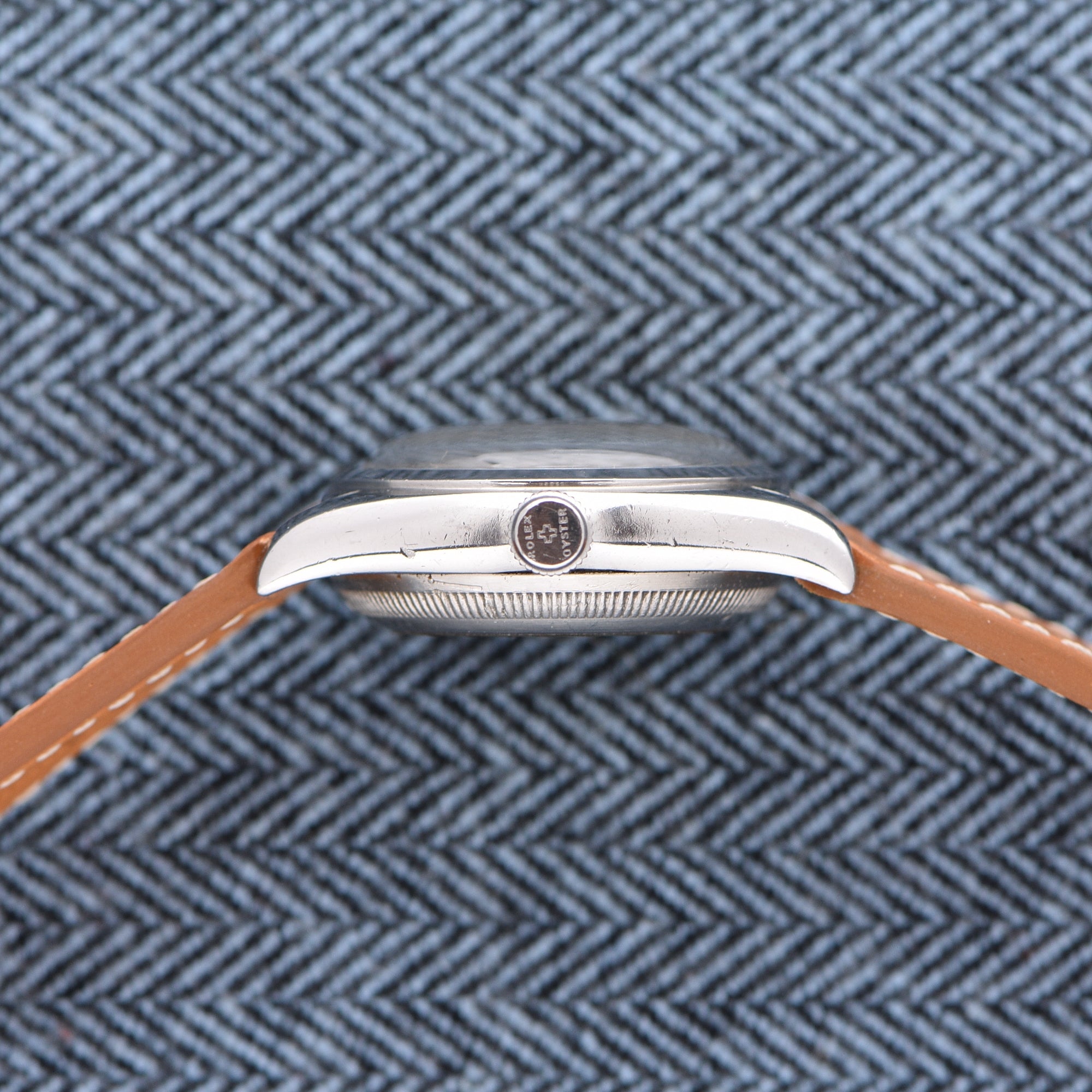 The case is in fantastic condition, with the original case back still intact, we suspect that this watch is unpolished. The dial has turned into a crisp golden color with beautiful speckling. The blued hands have all their lume intact and look great. The watch is paired with our Italian watch strap and steel buckle.