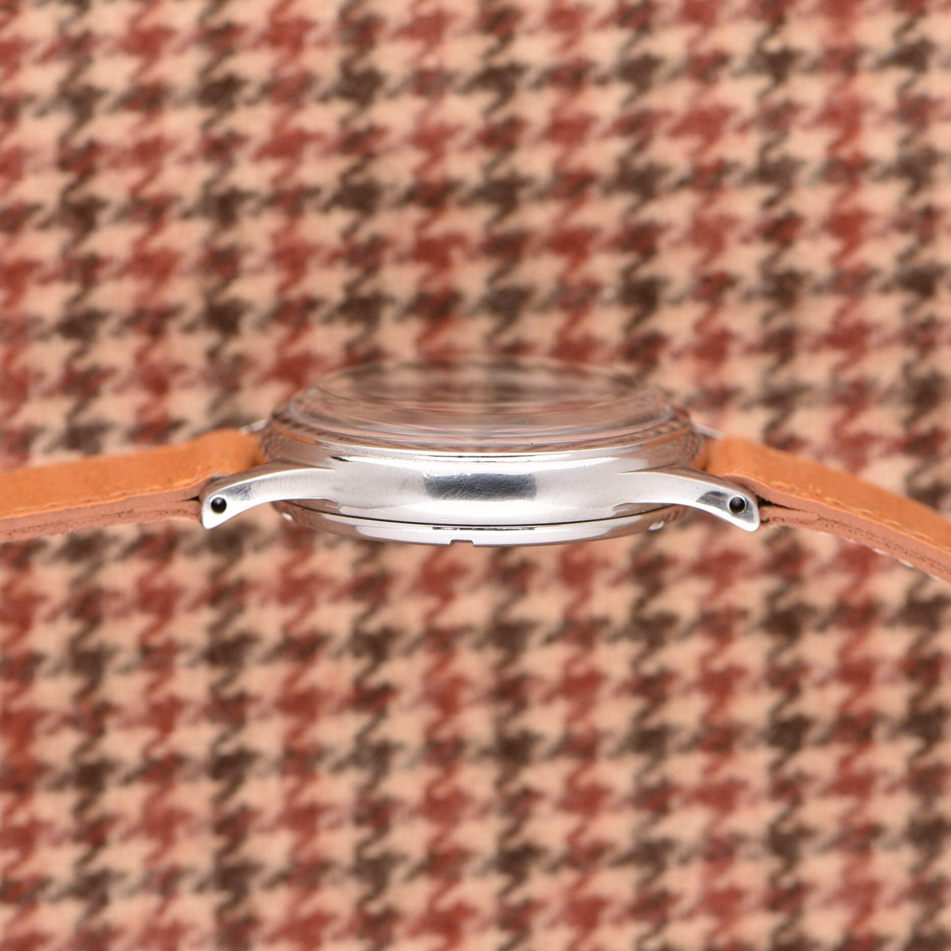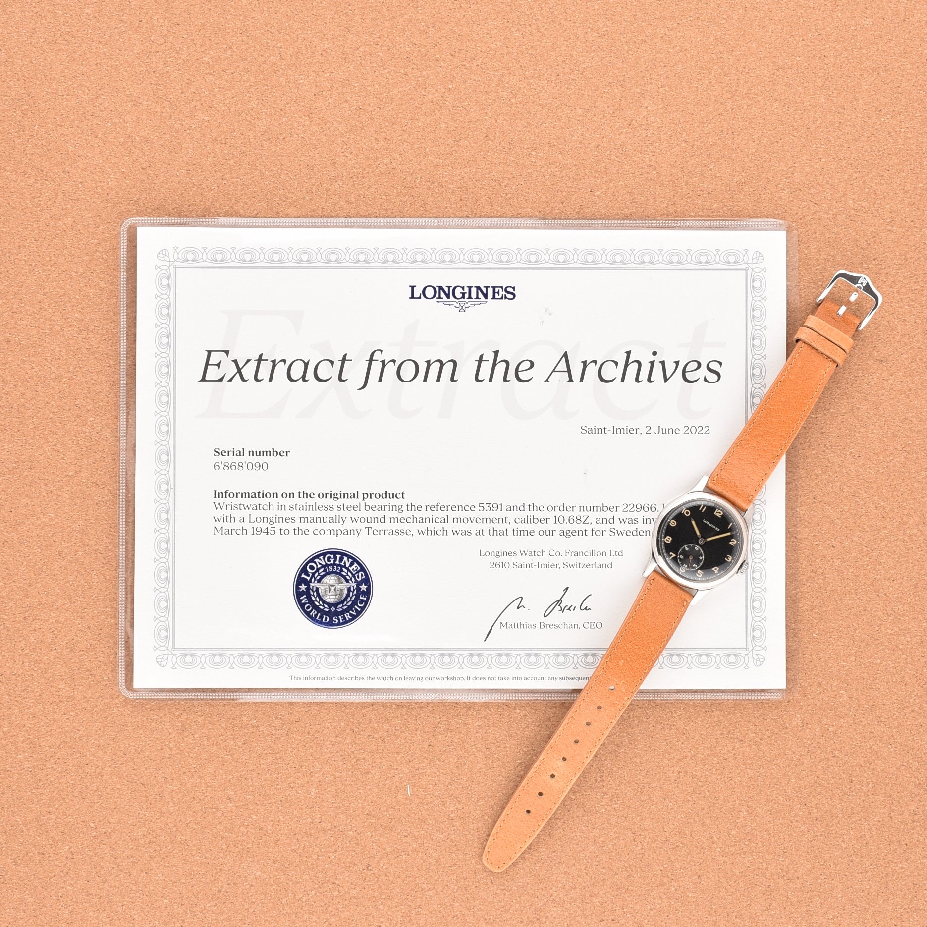 With that being said, the reference 5391 is a Sei Tacche. This example comes with a very nice gloss black dial with very nice lume. The watch comes with the Archives from Longines dating and referencing the watch.