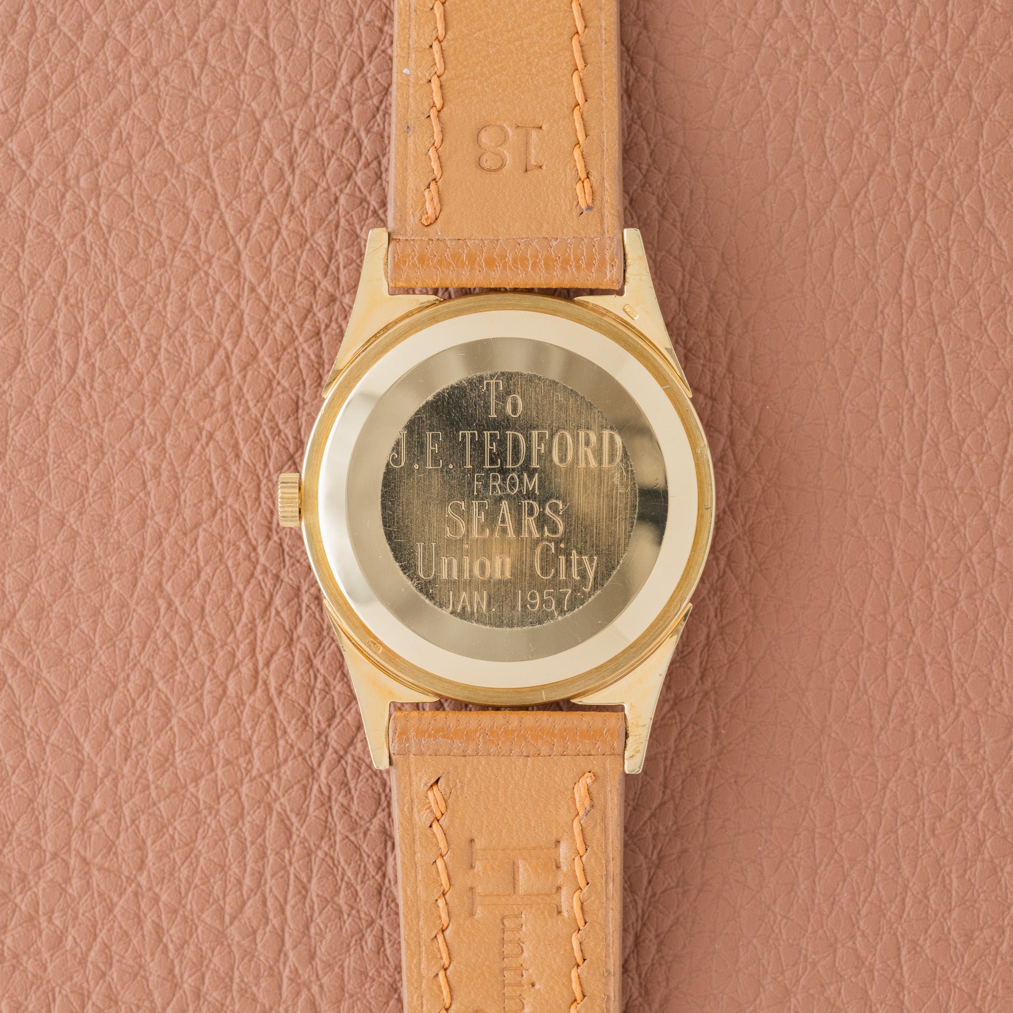 This particular example also carries an interesting engraving on the caseback reading “To J.E. Tedford from Sears Union City Jan. 1957,” giving the watch a clear historical moment tied to its original presentation. Watches with period engravings like this often tell a small story about where the piece came from and when it was originally given.