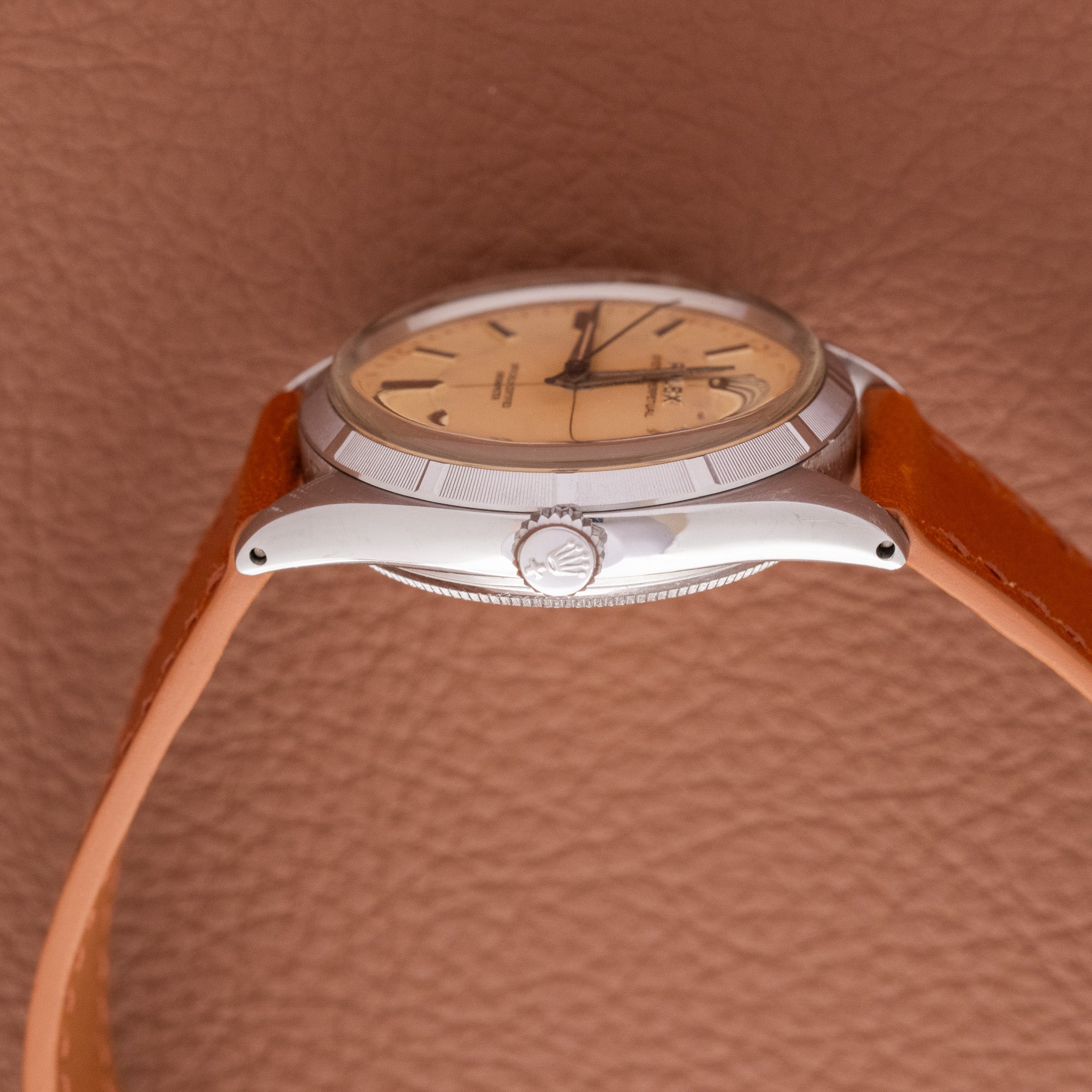 This Ref. 6565 is a perfect example of Rolex’s 1950s craftsmanship: refined, wearable, and built to last. With its sector dial, dauphine hands, and engine-turned bezel, it showcases the brand’s aesthetic evolution from pure functionality toward elegant versatility. Collectors value these early Oyster Perpetuals for their honest proportions, timeless design, and understated presence — traits that continue to define Rolex today.