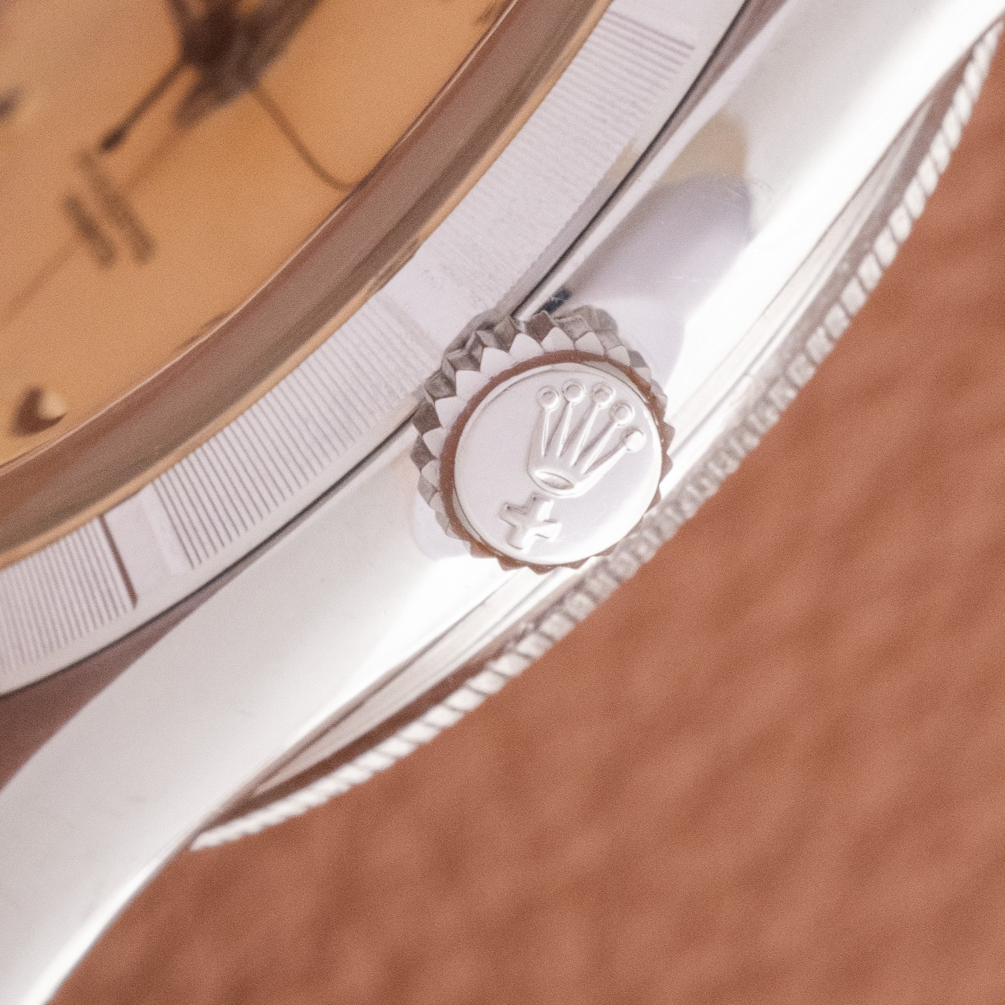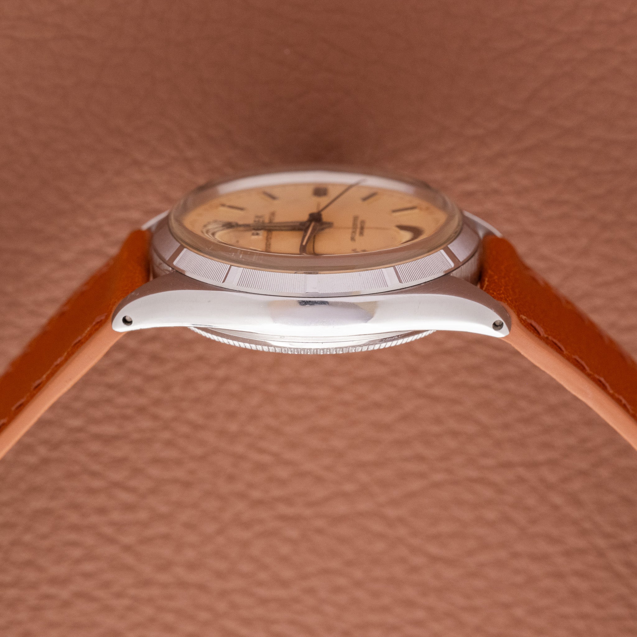 The proportions are spot on, the design language pure, and the patina just right. The cream-toned tropical dial gives this piece a warmth that can only come with time. It’s the kind of watch that feels equally at home under a cuff or worn casually. The unique design elements on the dial make this stand out from the hundreds of other Rolex Oyster Perpetuals in an excellent way.