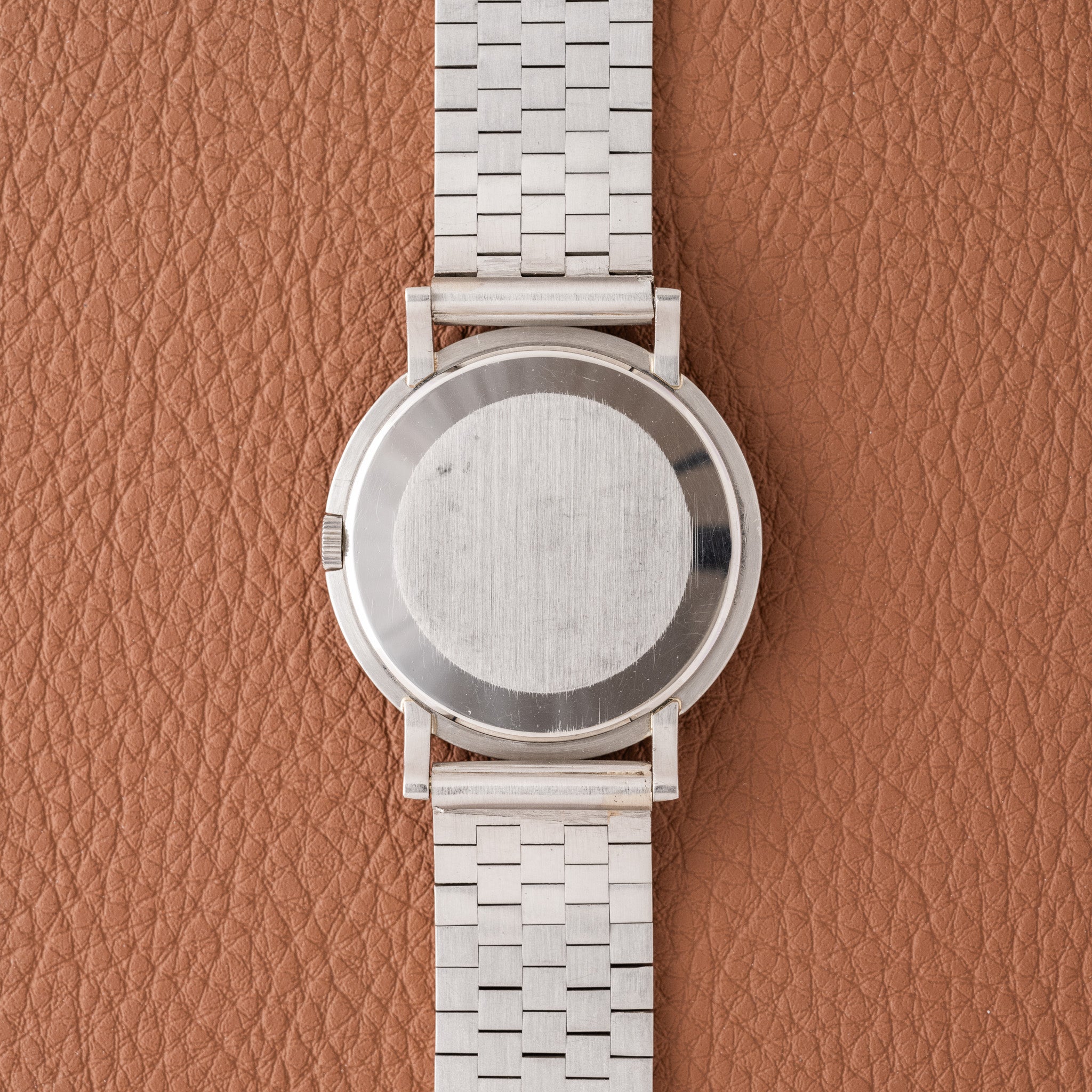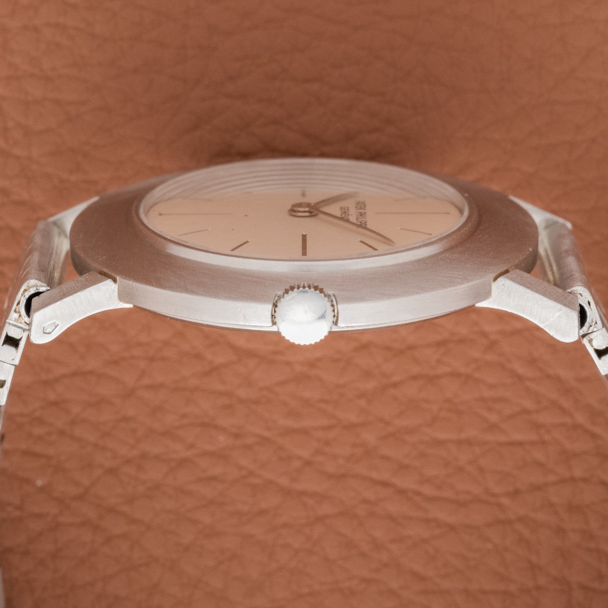 Most 2594 examples were produced in yellow or rose gold. Platinum was reserved for only a handful of watches, making this example among the rarest configurations ever produced. The fact that it retains its original platinum brick bracelet, confirmed by the Patek Philippe Archives, makes it nearly one-of-one in the market.
