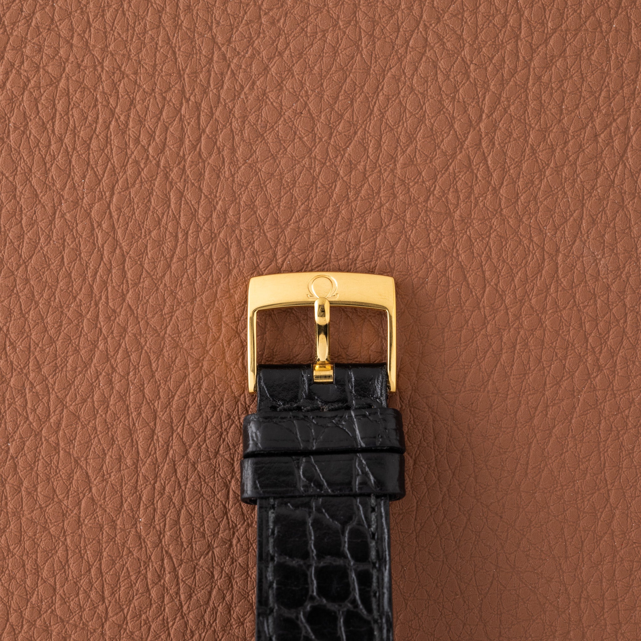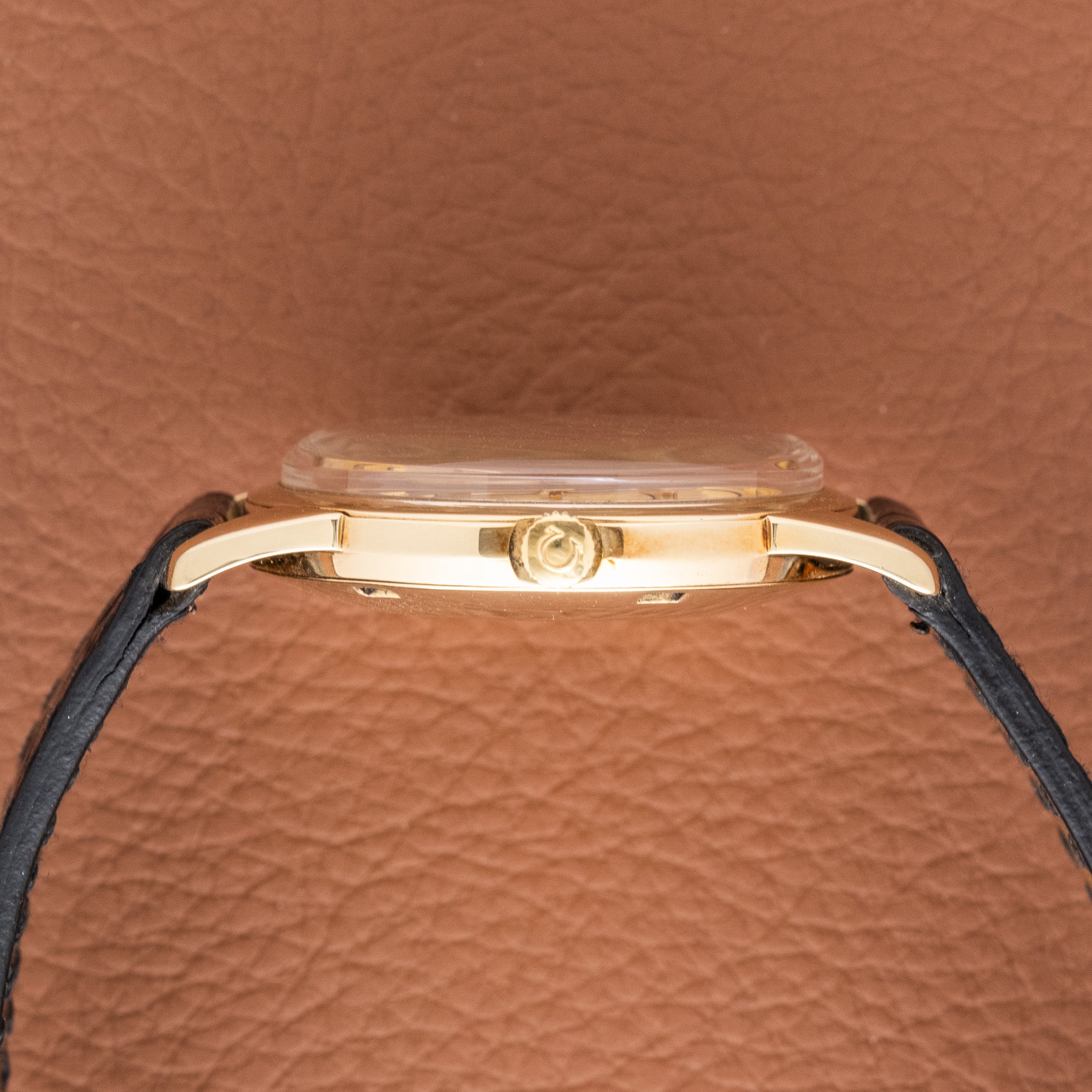 The Omega Seamaster Ref. 14704-61 SC is a refined example of early 1960s dress watch design, when Omega was producing some of its most elegant and understated models. Crafted entirely from 14k solid gold, this reference stands apart from the more commonly seen gold-cap or stainless-steel Seamasters of the same era. Its brushed non-luminous dial, paired with distinctive “coffin” markers, lends a slightly more formal tone compared to the sportier luminous versions.