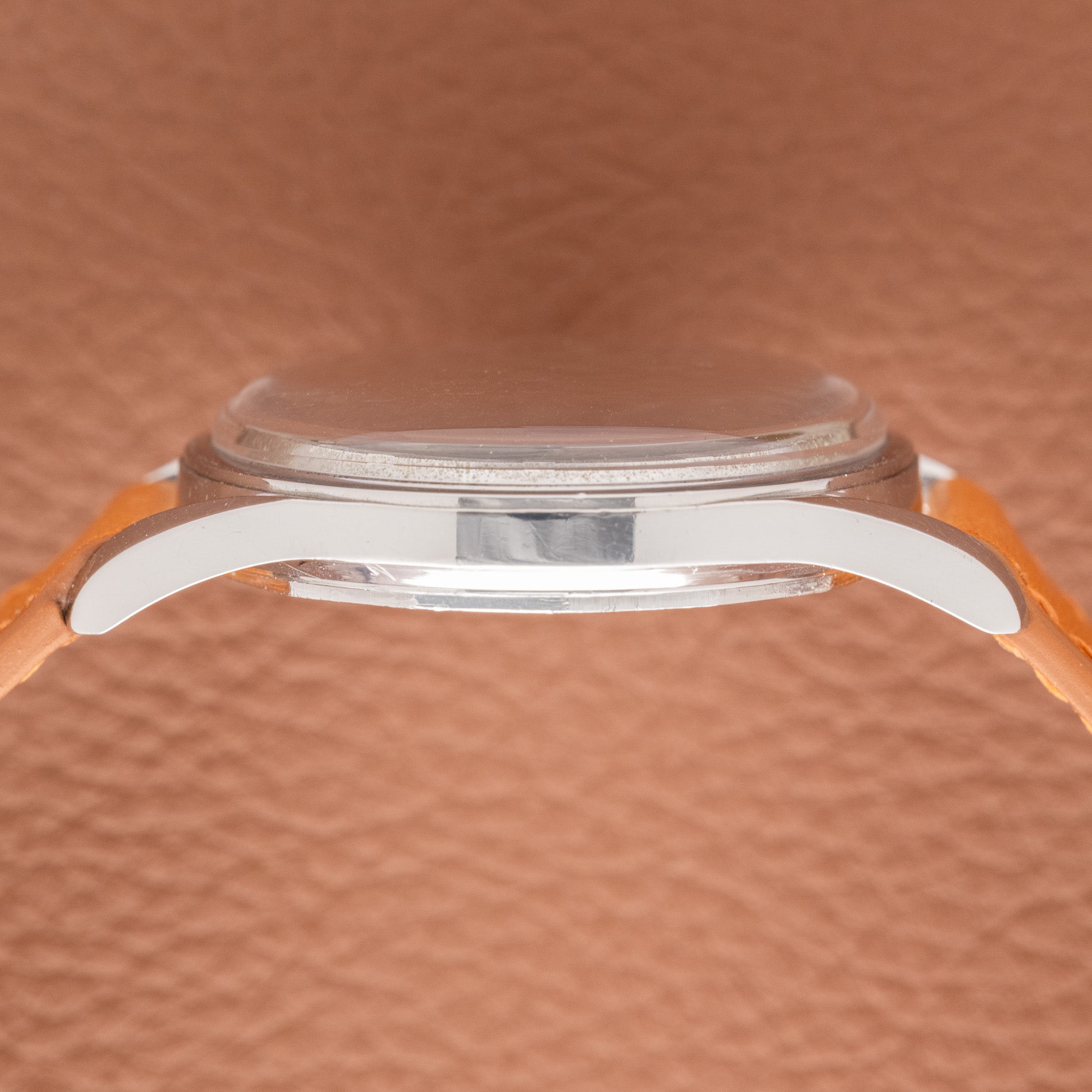 This ref. 204610-2 stands out not only for its sharp, unpolished case but for its highly unusual dial aging. The original glossy black lacquer has transformed into a textured, stone-like tropical surface that is rarely seen in the Polerouter family. The crosshair and printed text have shifted to a deep gold tone, creating a striking contrast that highlights the patina. The reference and serial on the caseback remain exceptionally crisp, which is uncommon for this era.