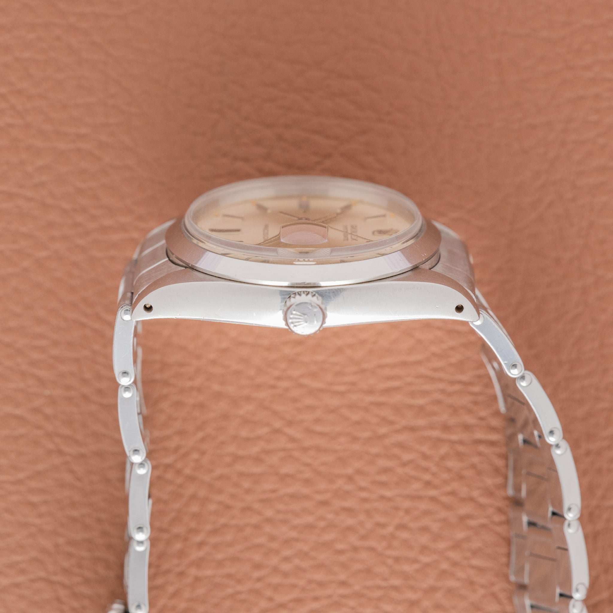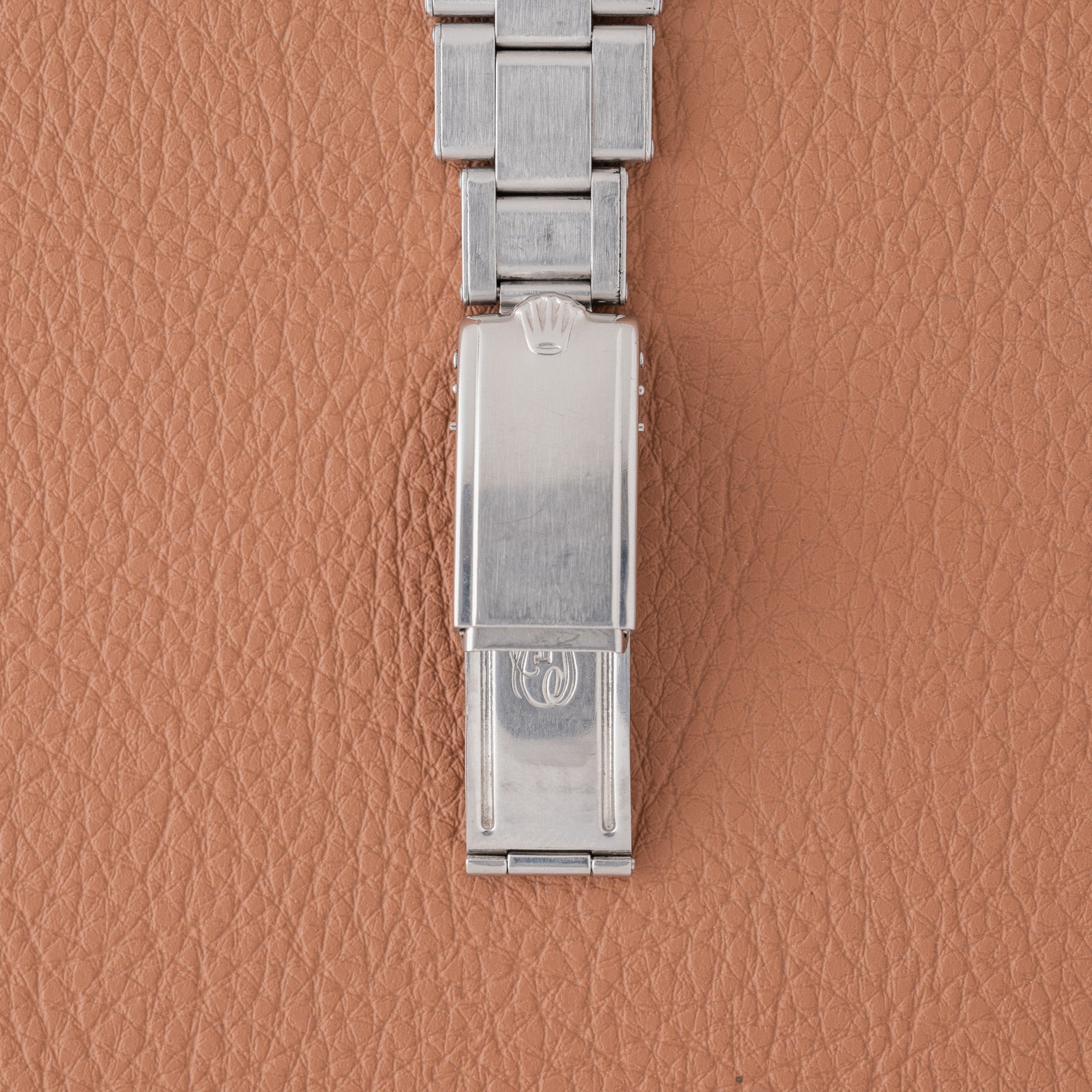 The case proportions remain classic at 34mm, with a smooth bezel and acrylic crystal. The Oyster bracelet appears tight, and the clasp includes its extension, a detail often missing on watches of this age.
