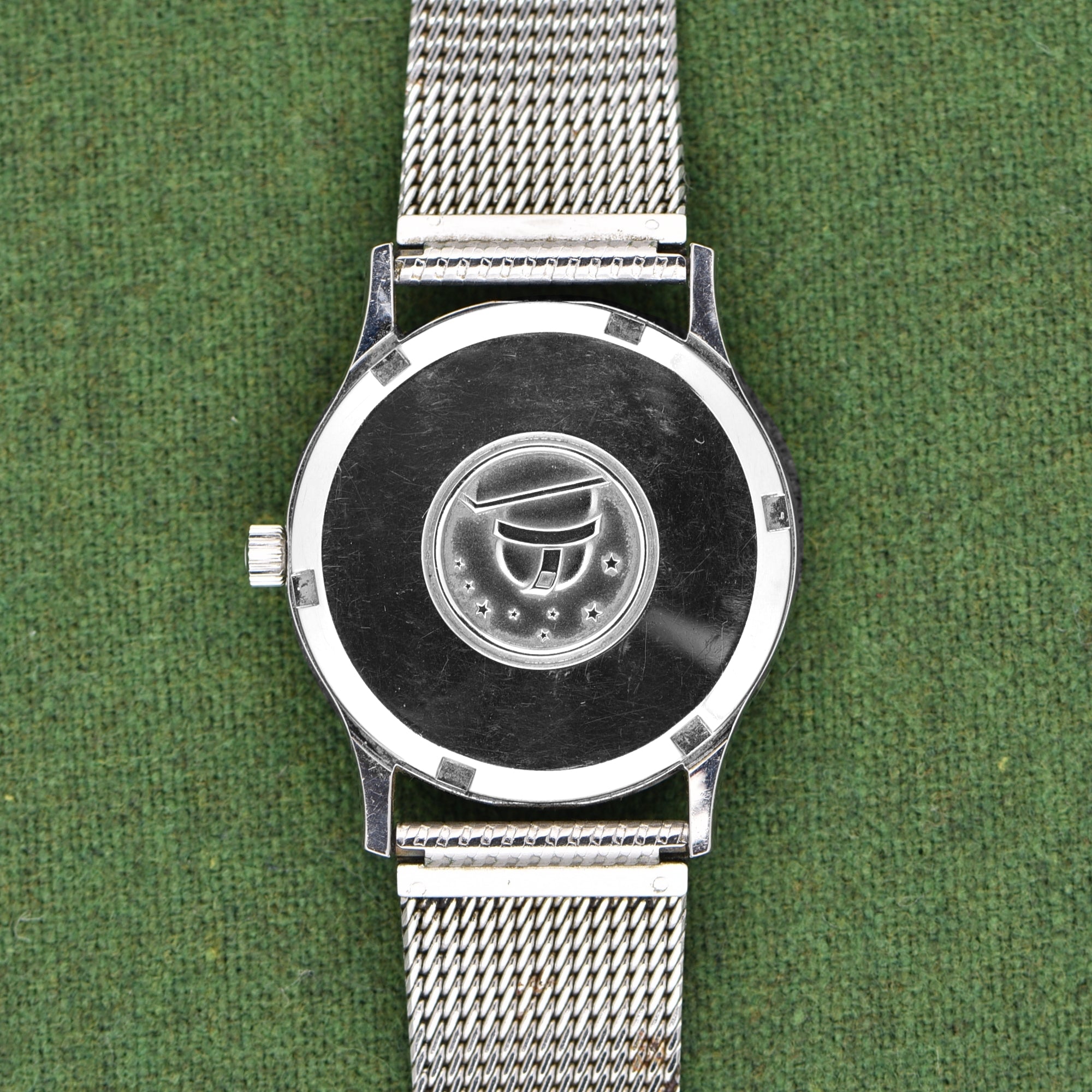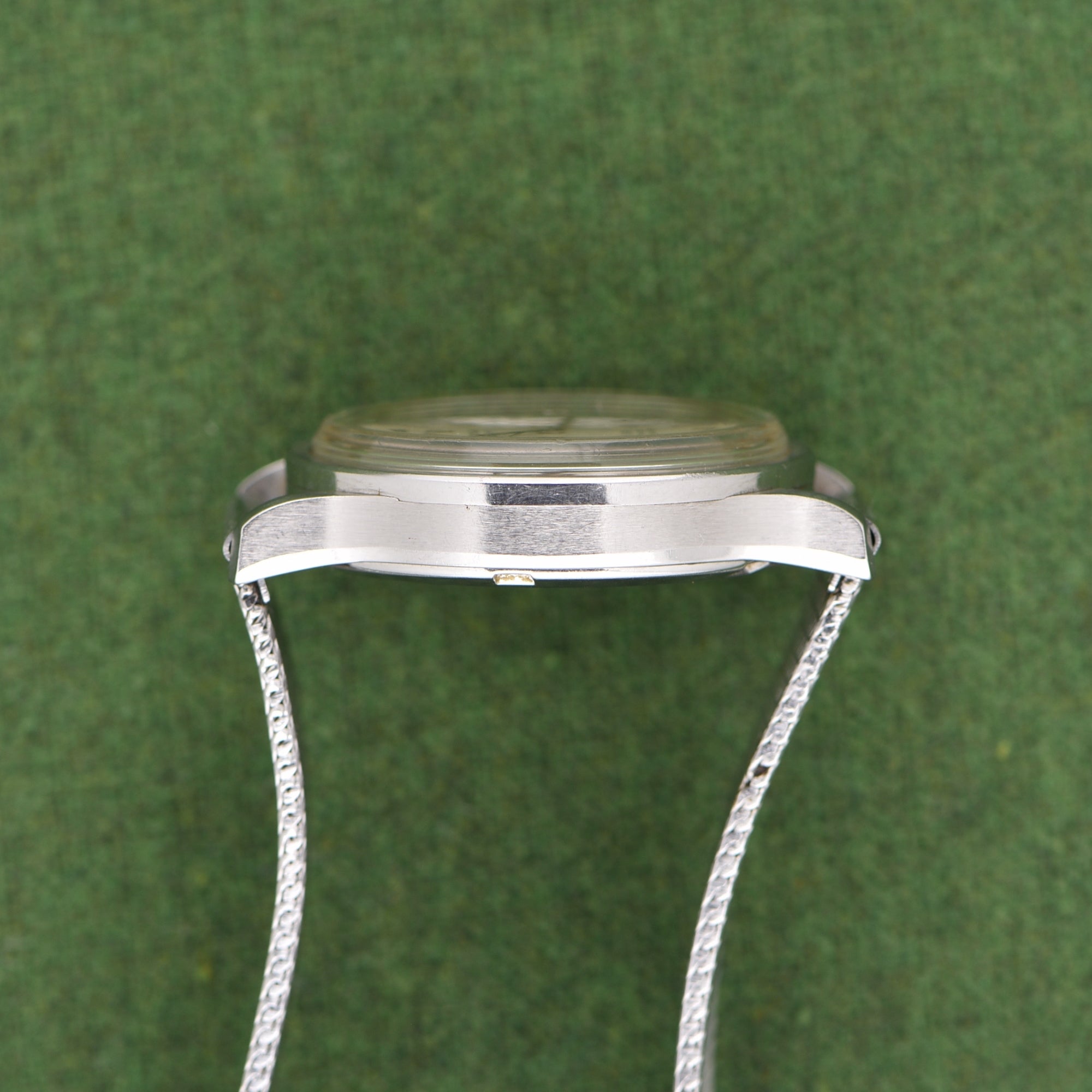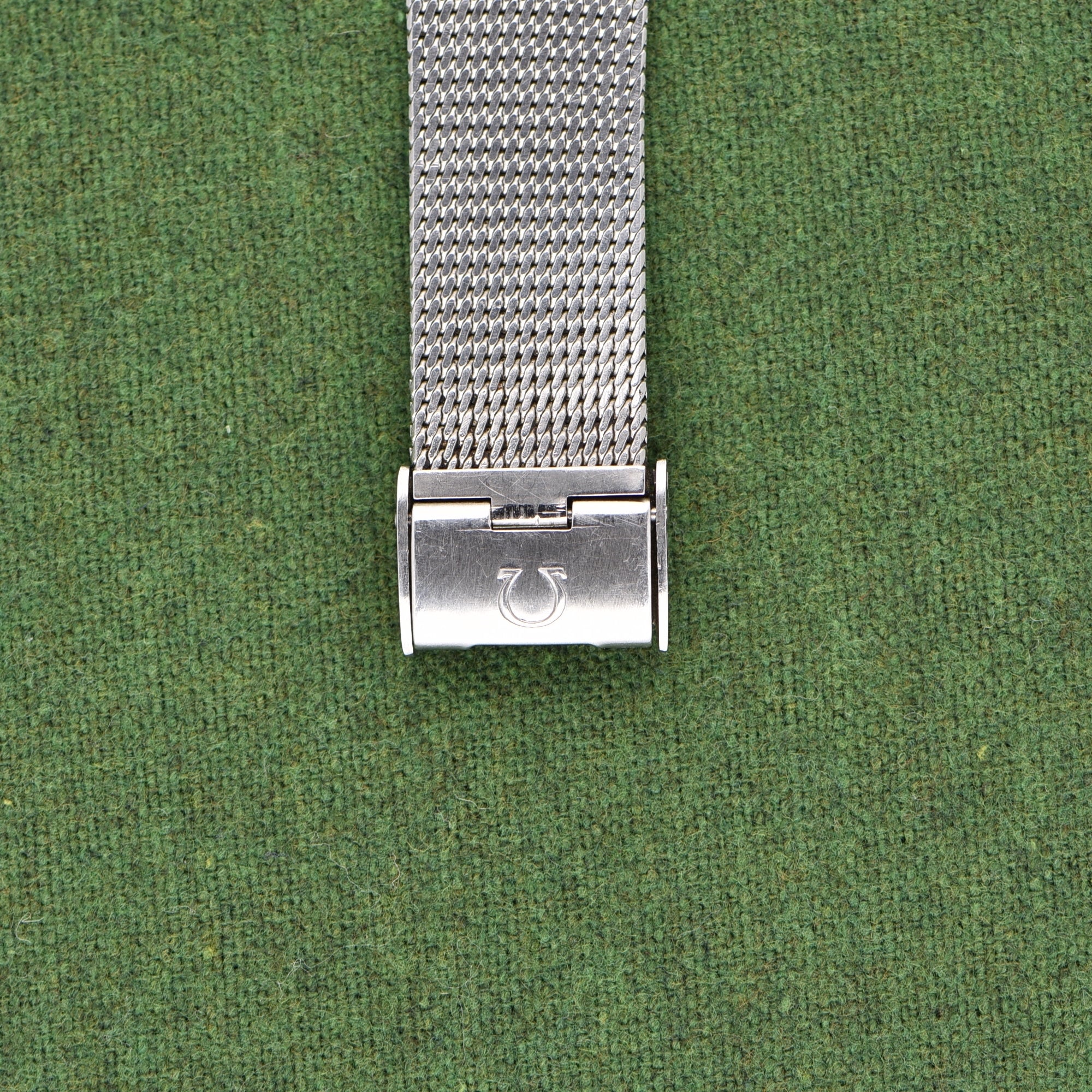 The brushed dial on this example is very nice with a slightly darker spot near the bottom of 2 o'clock. The case is unpolished and clean, paired with the original Omega mesh bracelet.