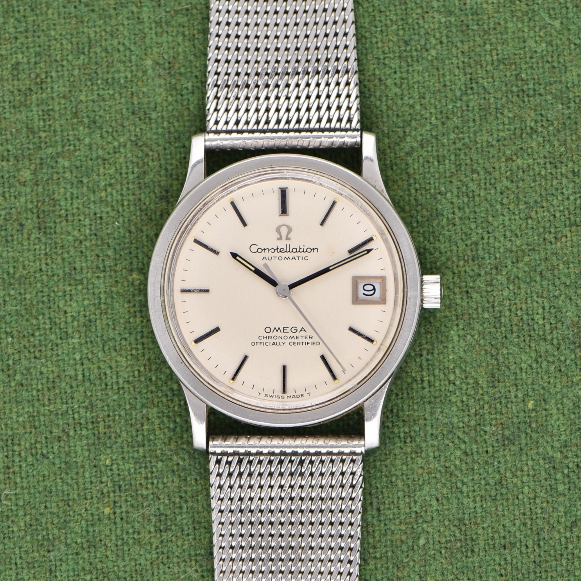 The reference 166.052 is on the sportier end of the Constellation line. What you have is a very clean and simple watch with an original mesh bracelet. The dial is beautiful with the logo applied on top and the Omega name on the bottom.