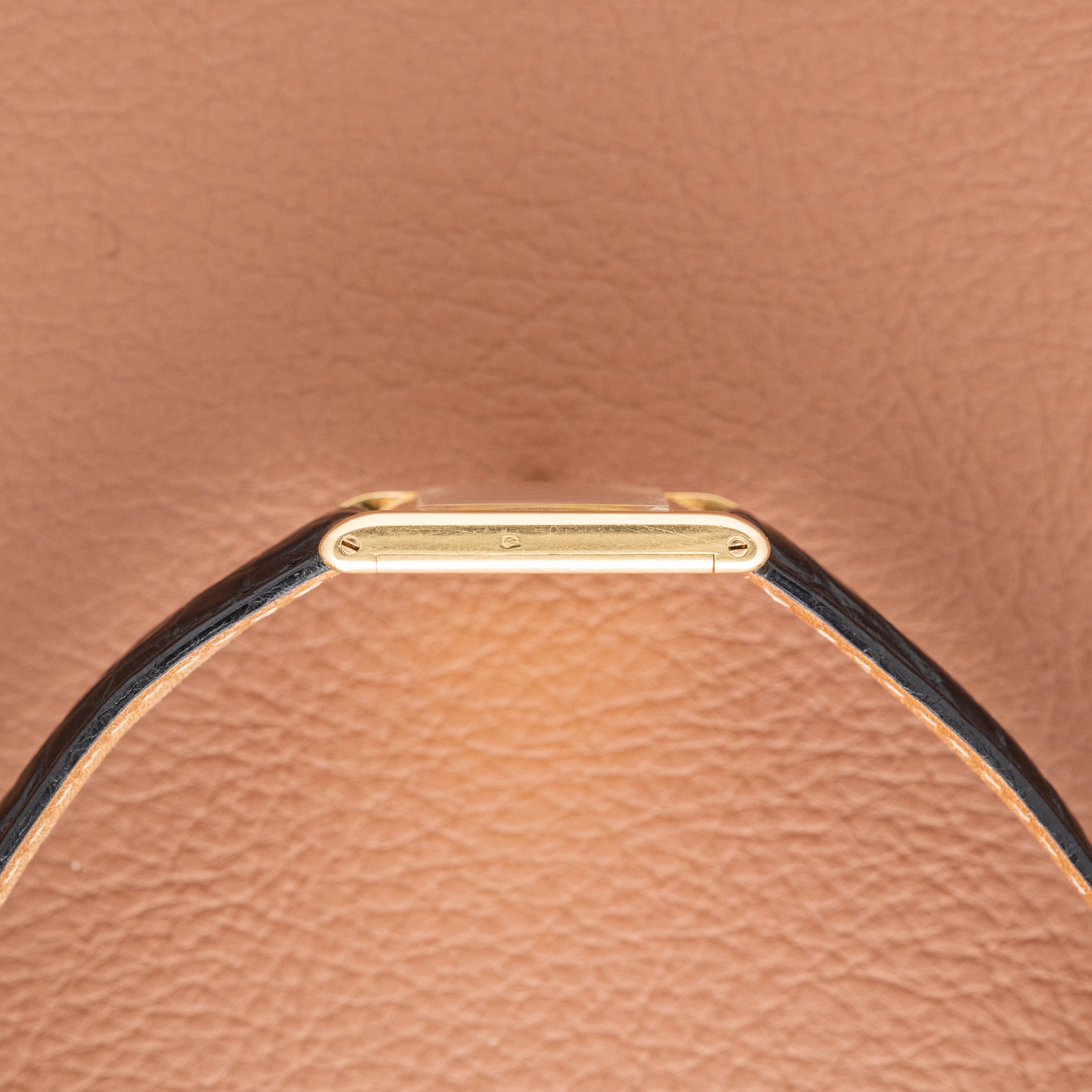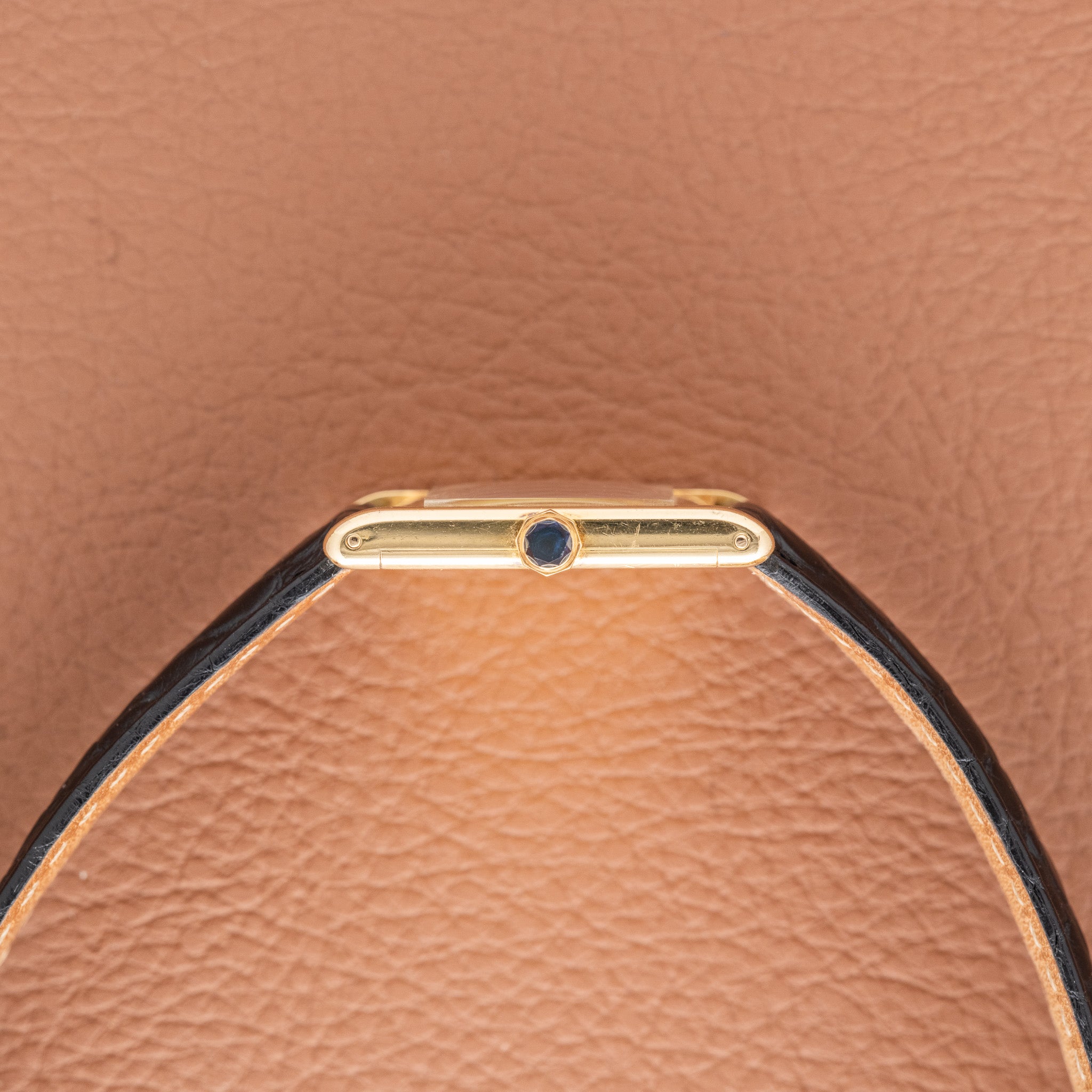 This example dates to 1970 and features what collectors often refer to as the transitional “extra plate” case. Unlike later Tanks with visible side screws, this case uses a snap-on caseback construction, a detail seen only briefly during this period. The case is solid 18k yellow gold and bears correct French eagle head hallmarks on both the caseback and case side, confirming Paris production.