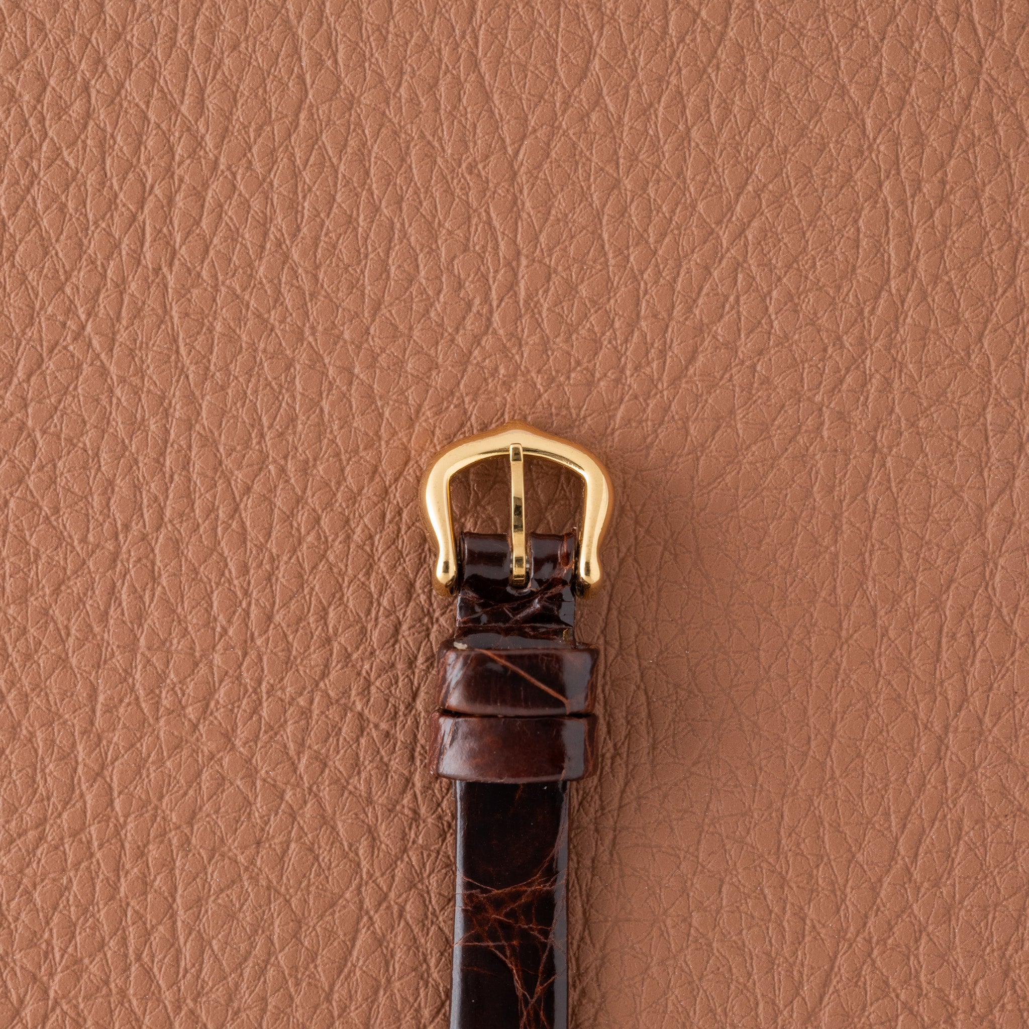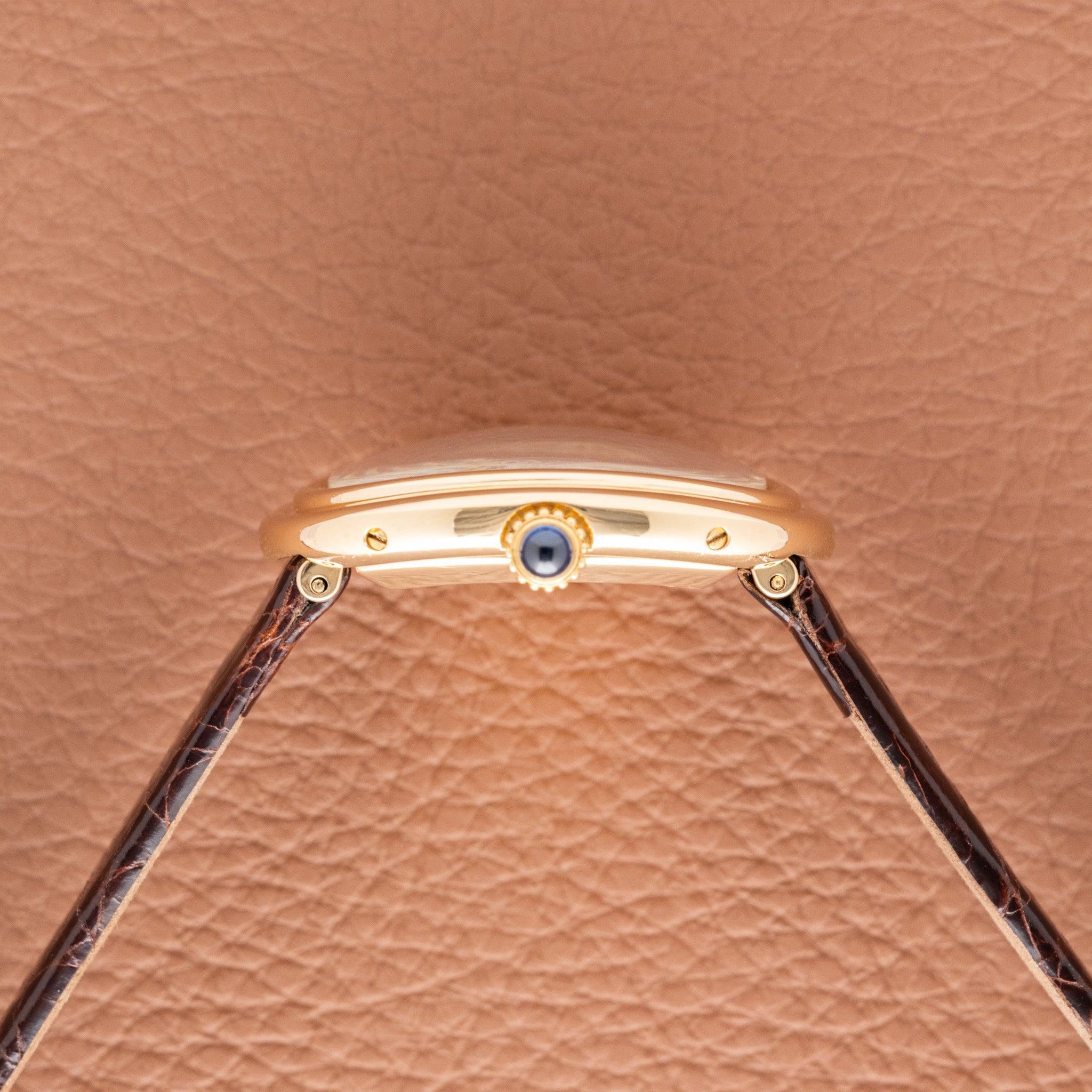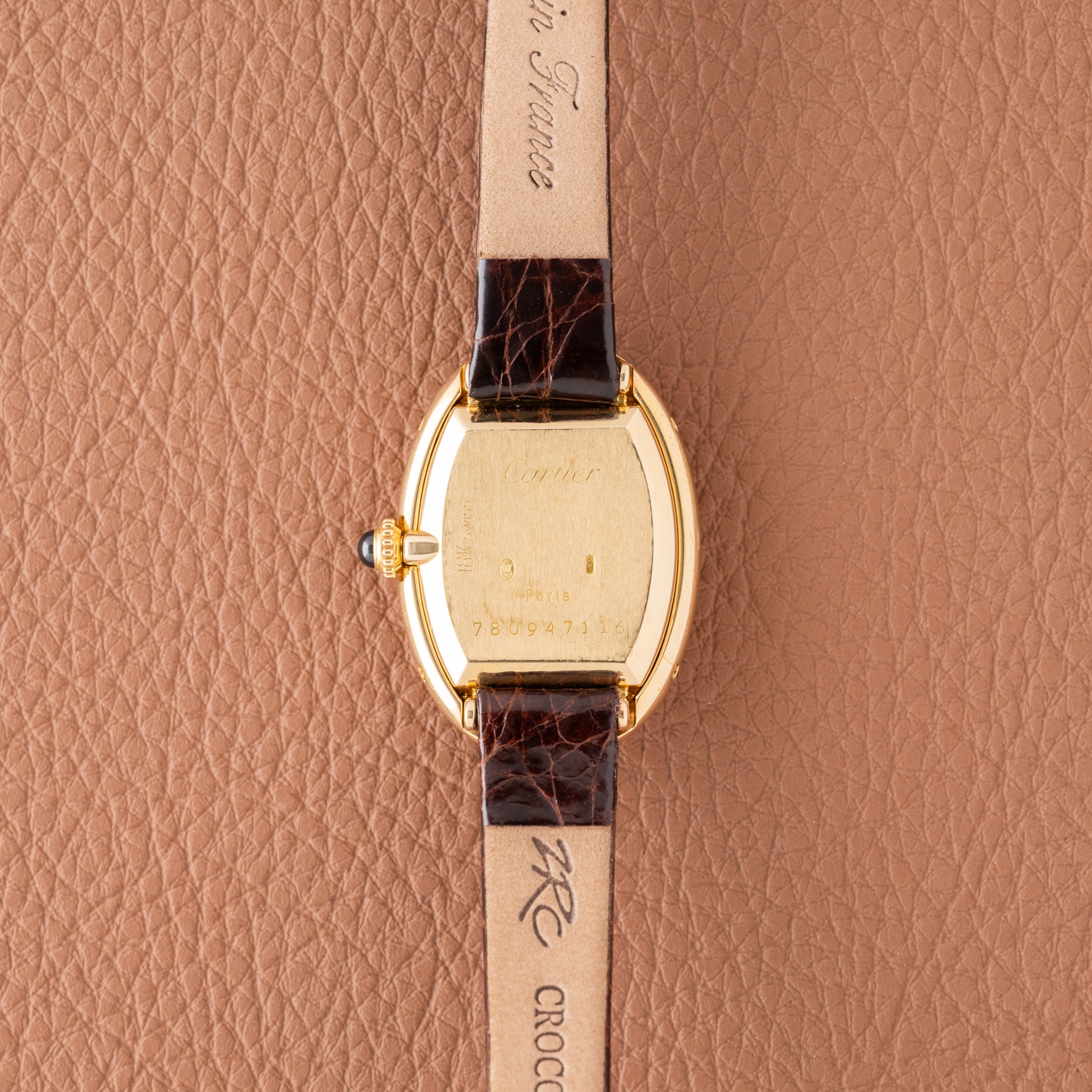 Reference 78094 sits firmly within that lineage. Produced during a period when Cartier Paris was still closely associated with traditional case construction and classical dial execution, this watch reflects the brand’s focus on harmony rather than scale. The polished yellow gold oval case flows seamlessly into the bezel, framing the dial in a way that feels sculptural rather than technical. The Roman numeral dial, blued steel hands, and cabochon crown are all signatures of Cartier’s design language, executed here with restraint and balance.