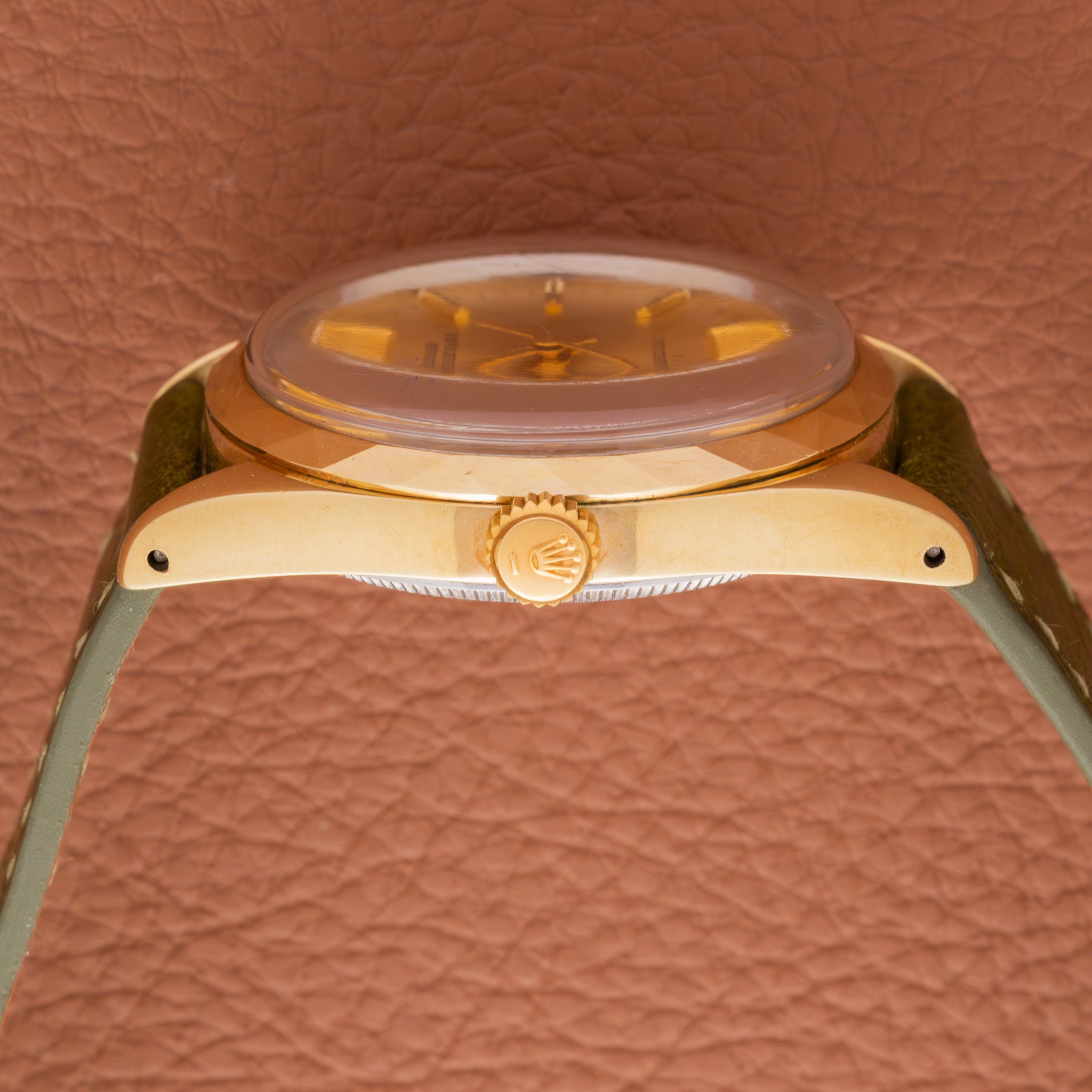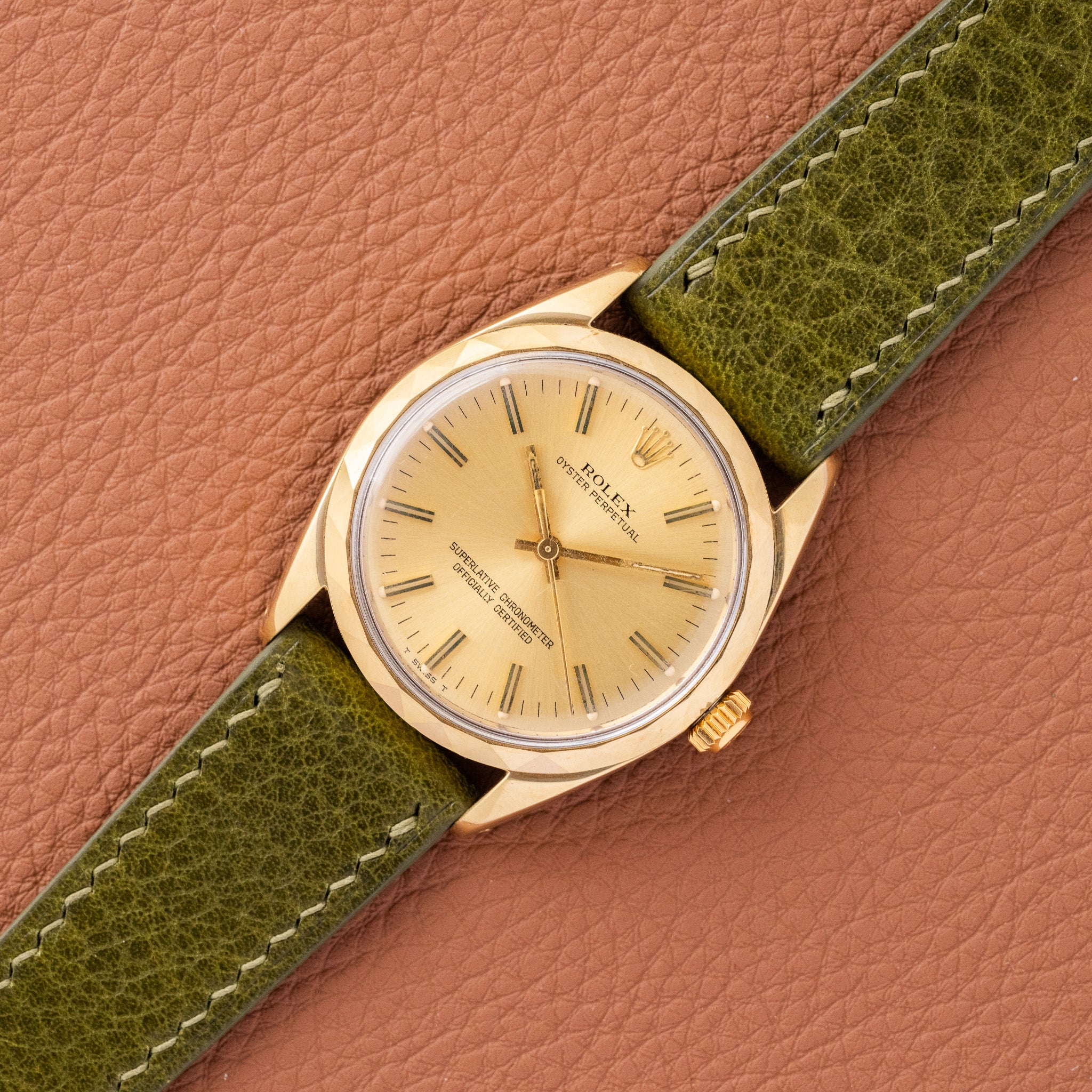The Ref. 1024 sits in the lineage of mid-century Oyster Perpetuals, produced in the late 1960s and early 1970s. While many examples were fitted with smooth or fluted bezels, the faceted bezel is exceptionally scarce—offered only in limited runs. This detail, combined with the warm champagne dial and 34mm case, makes this watch an under-the-radar vintage gem for Rolex collectors.