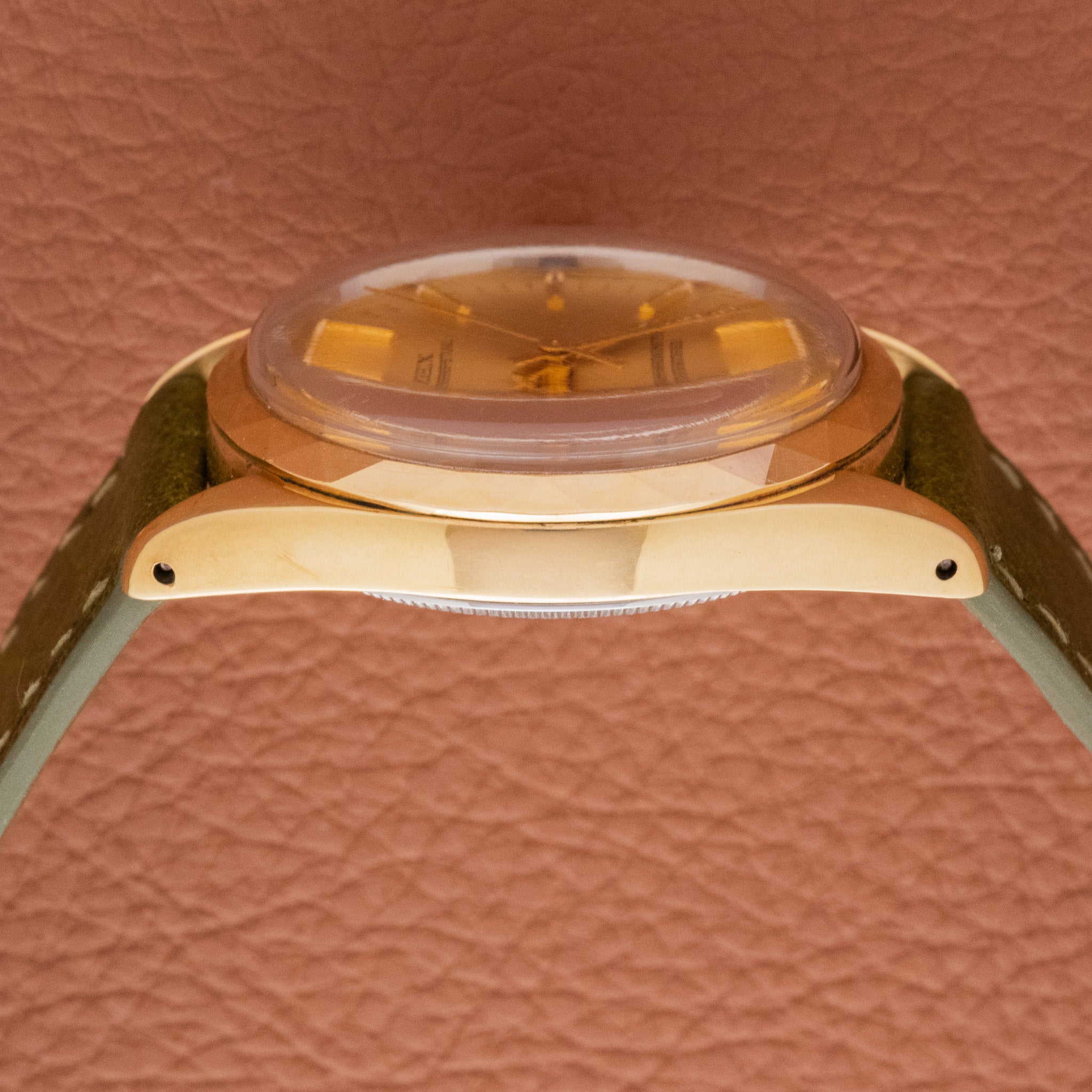 Case: Unpolished gold-plated case with even surfaces; no plating wear visible.