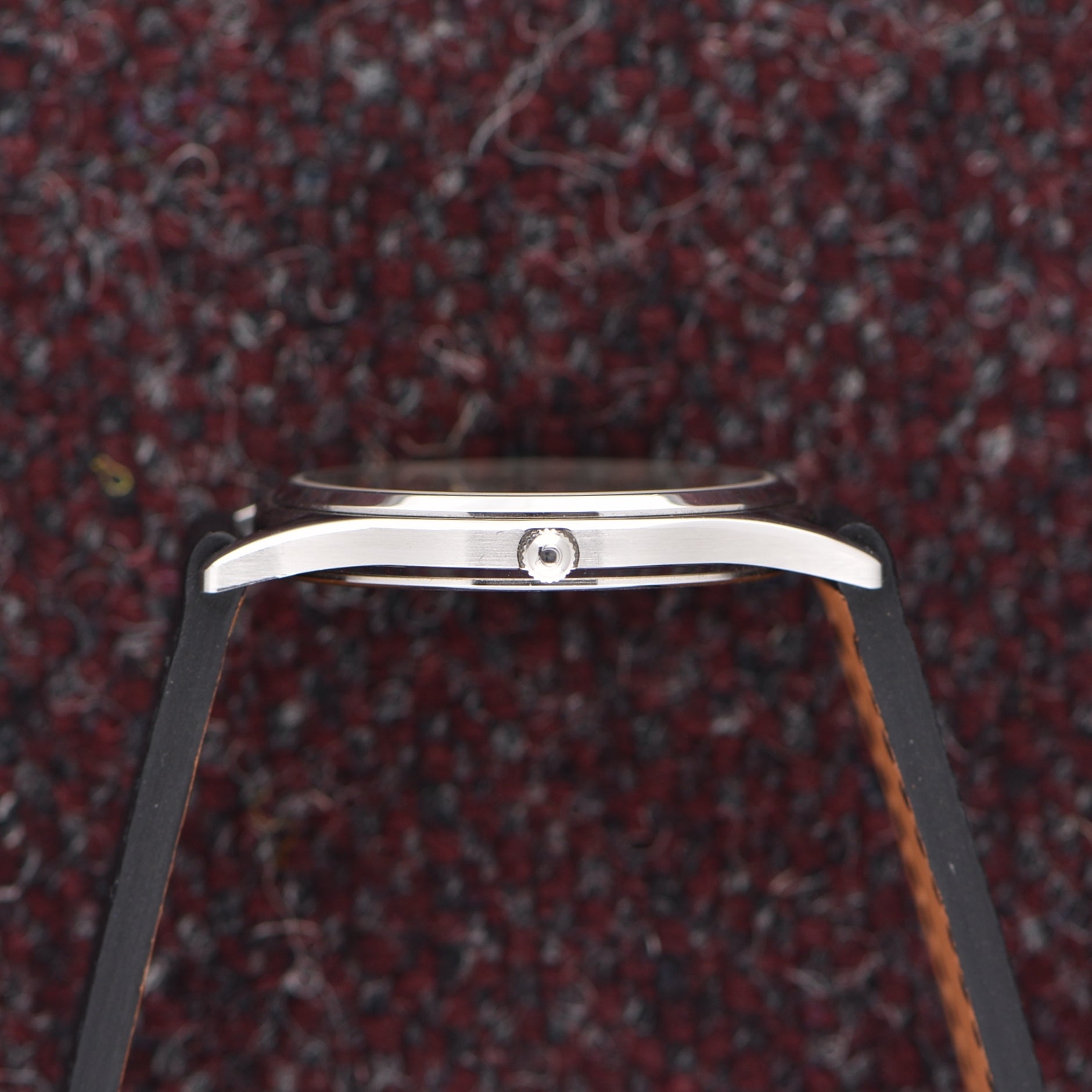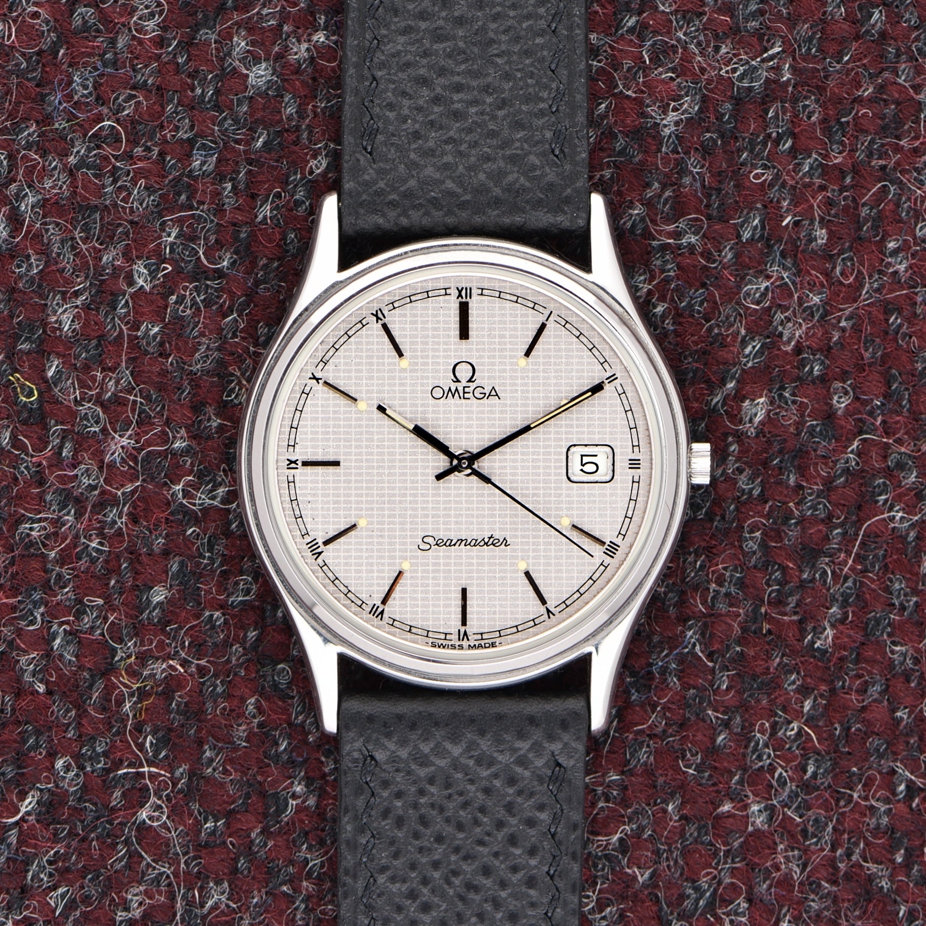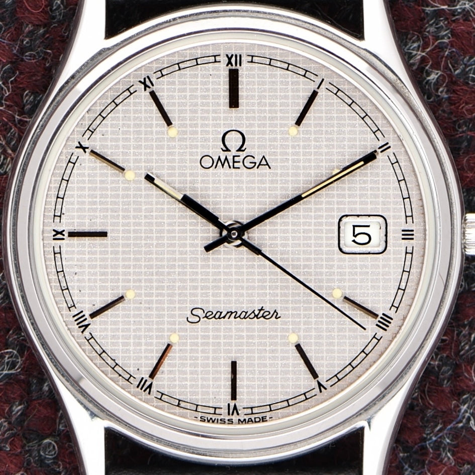 The reference 396.1010 is a great example of what you can find within the vintage Omega Market. The watch is super thin with a very unique grid, sparkle, dial. The dial has very even and puffy tritium lume that looks great on the silver dial.