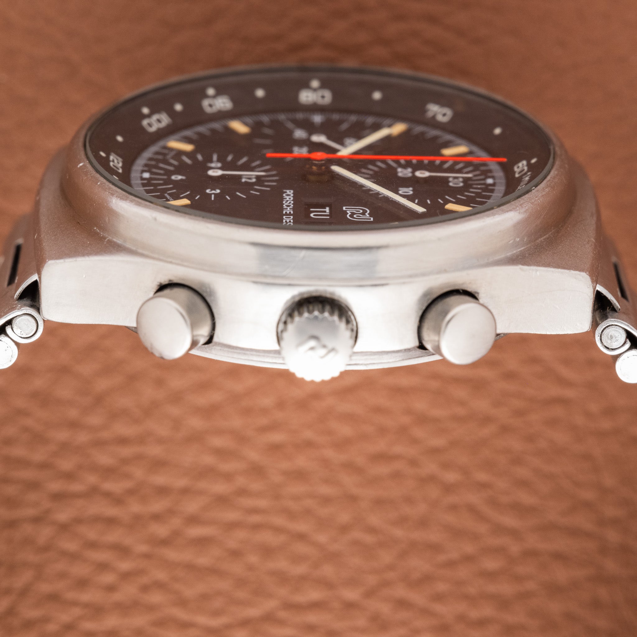 These watches were built to be worn hard and often show heavy use, which makes finding an unpolished example with its original finish still intact especially uncommon. The matte black dial with tritium plots, red central chronograph hand, and full day-date display captures the practical design ethos Porsche Design was known for through the 1980s.