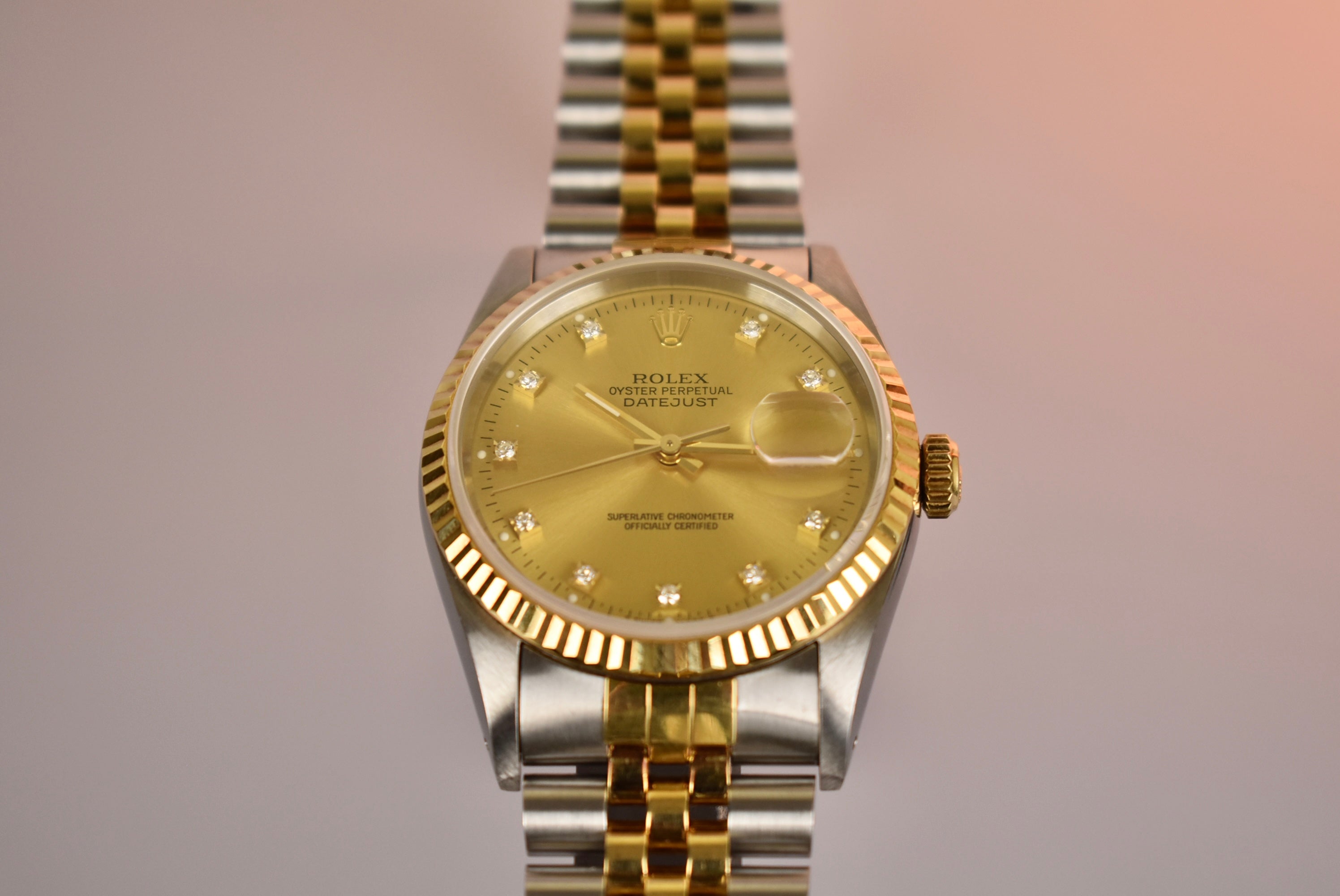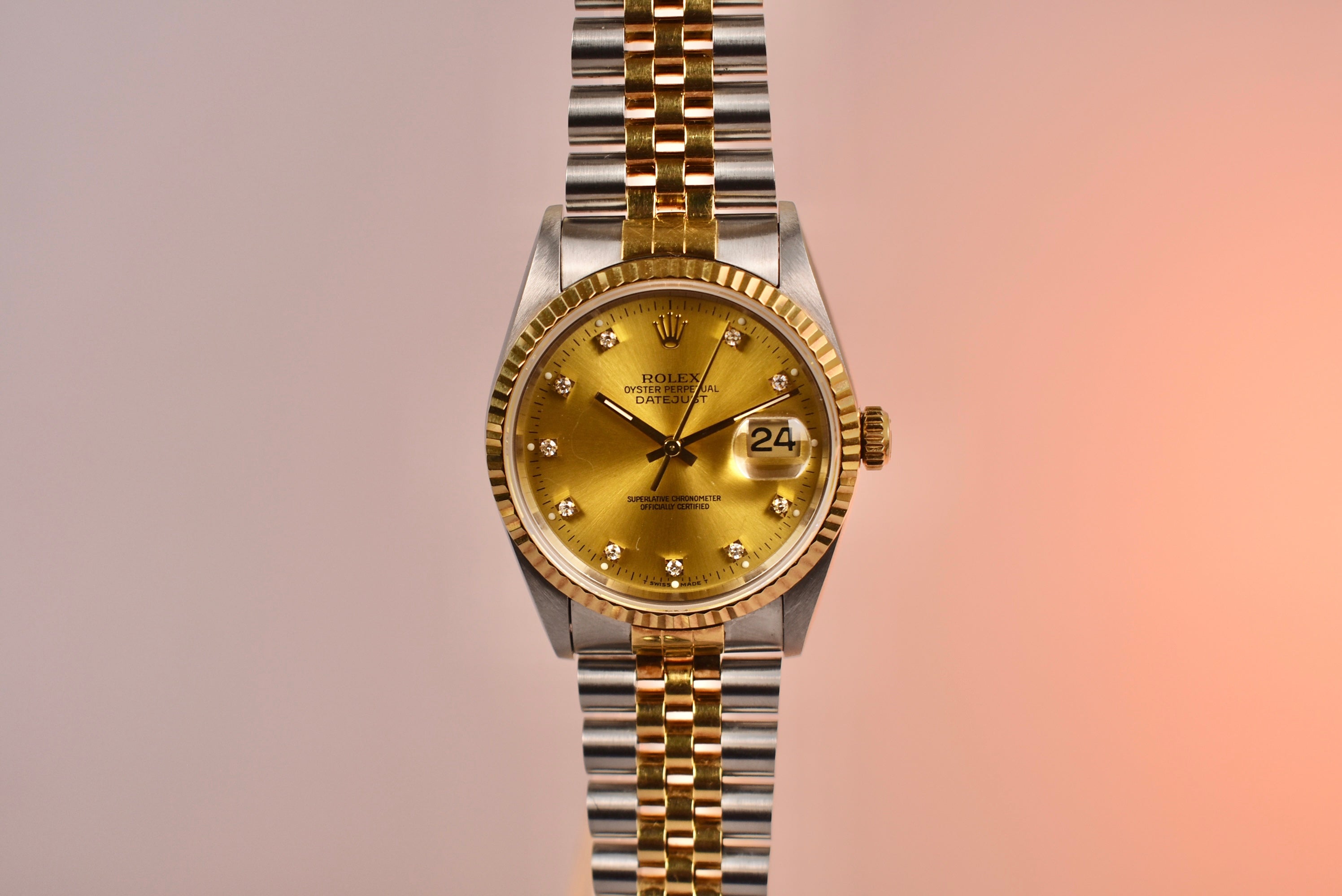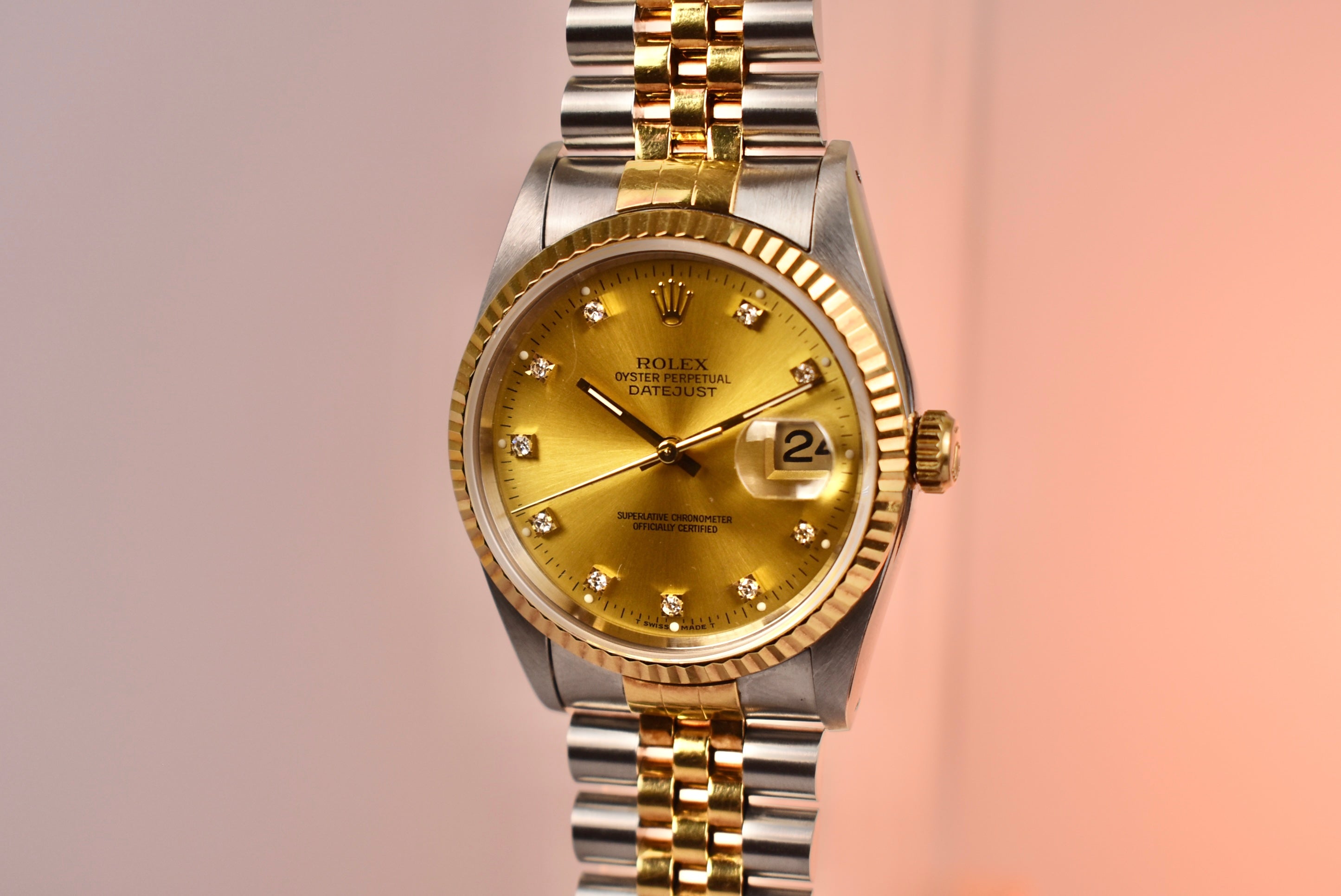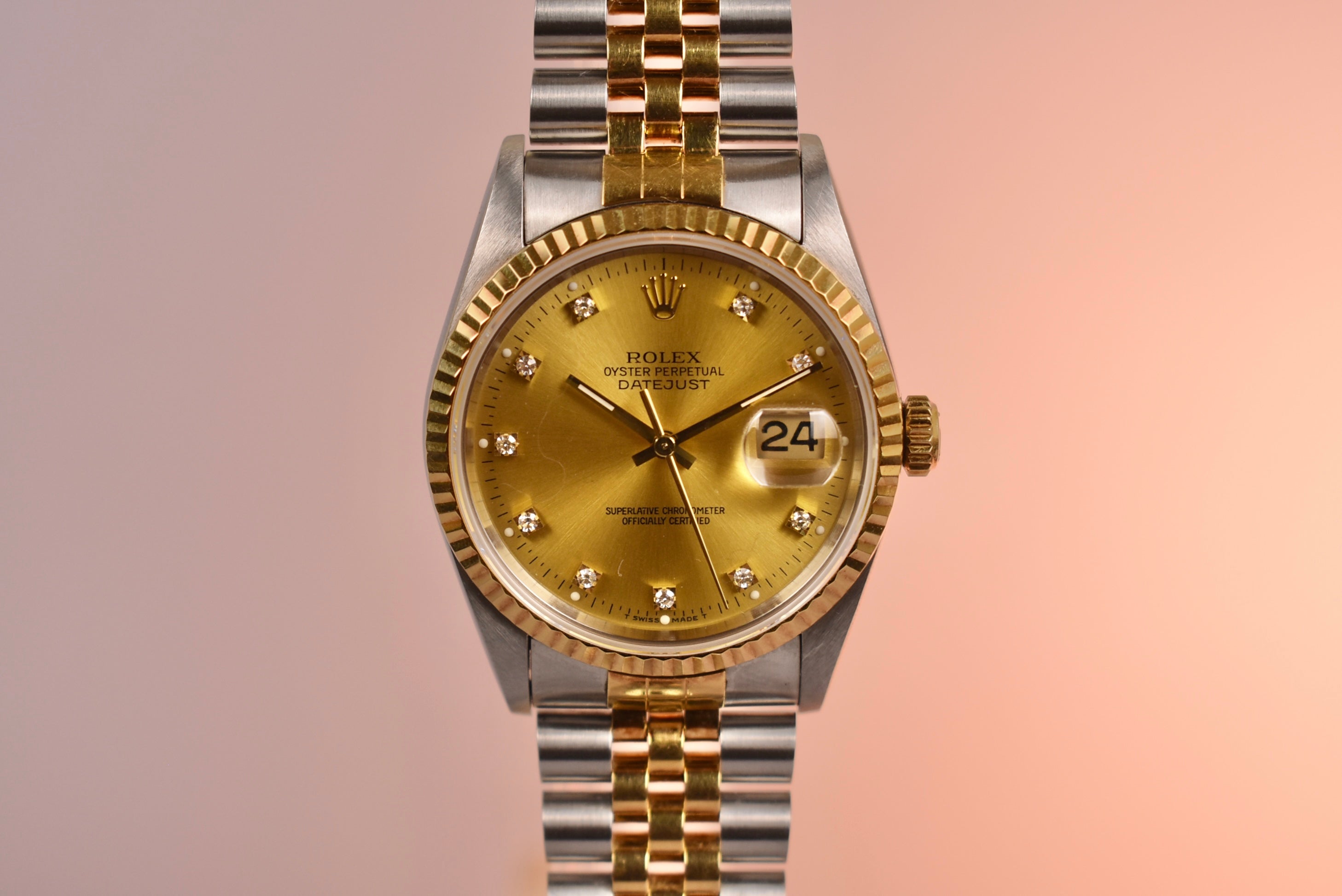 Hands down, the Rolex Datejust has becoming the most commonly know watch to everyone. The jubilee bracelet and fluted bezel work in harmony with a clean dial and simple date feature. The 16233 is also many people's sweet spot when it comes to Rolex. It is the most affordable Rolex model that can be had today with a sapphire crystal, quickset date and a two tone case and bracelet. This specific example has a factory diamond dial with its original box and papers