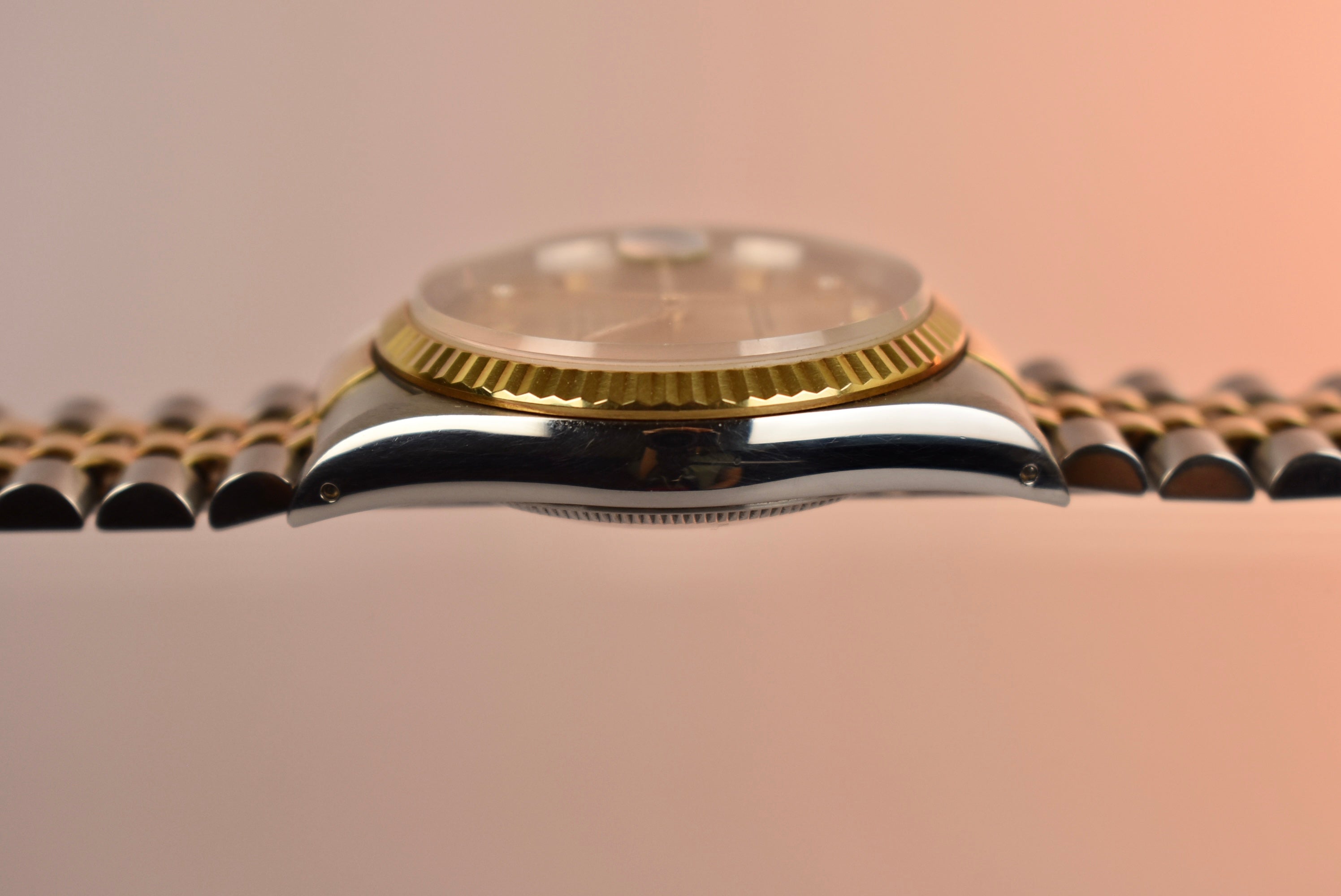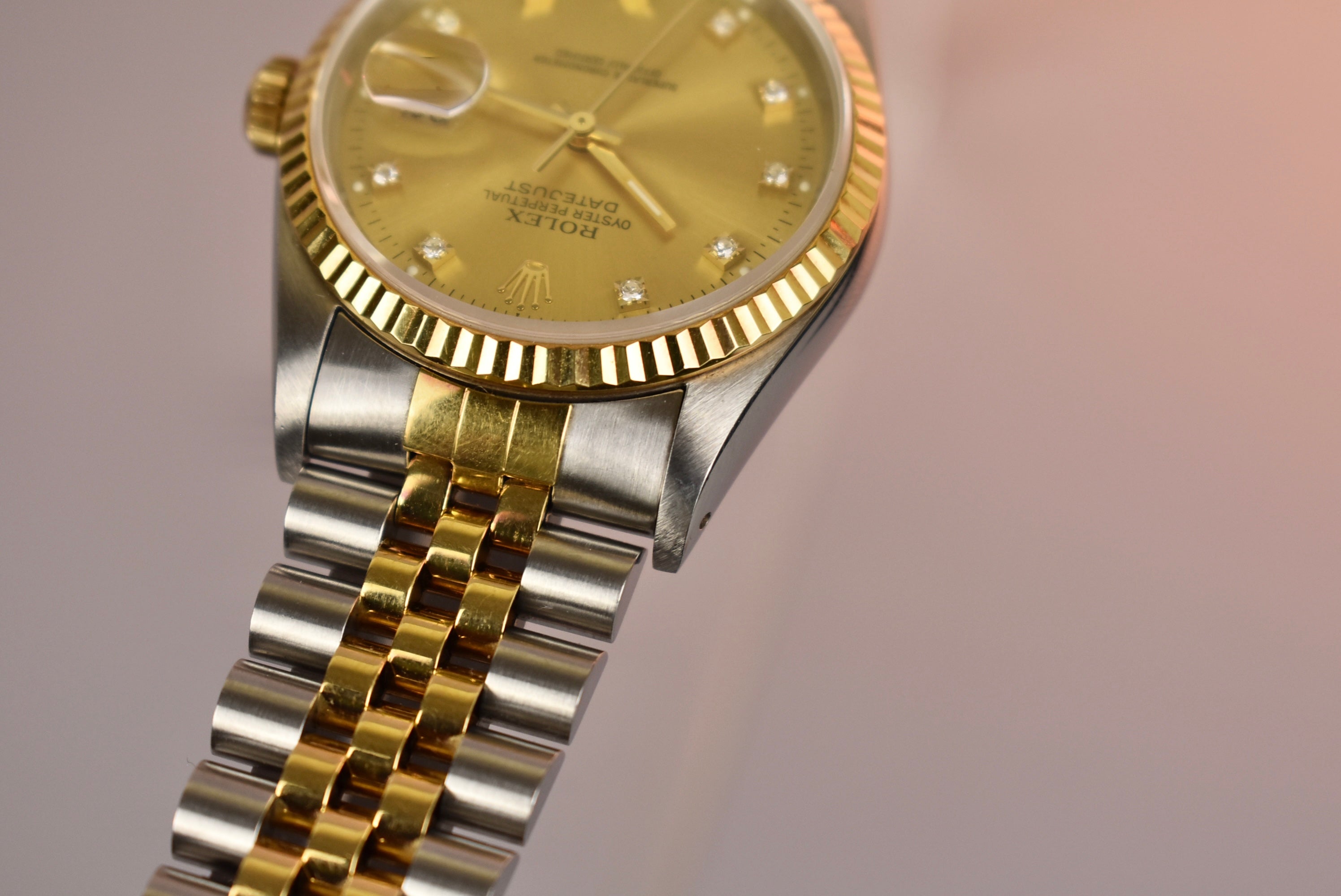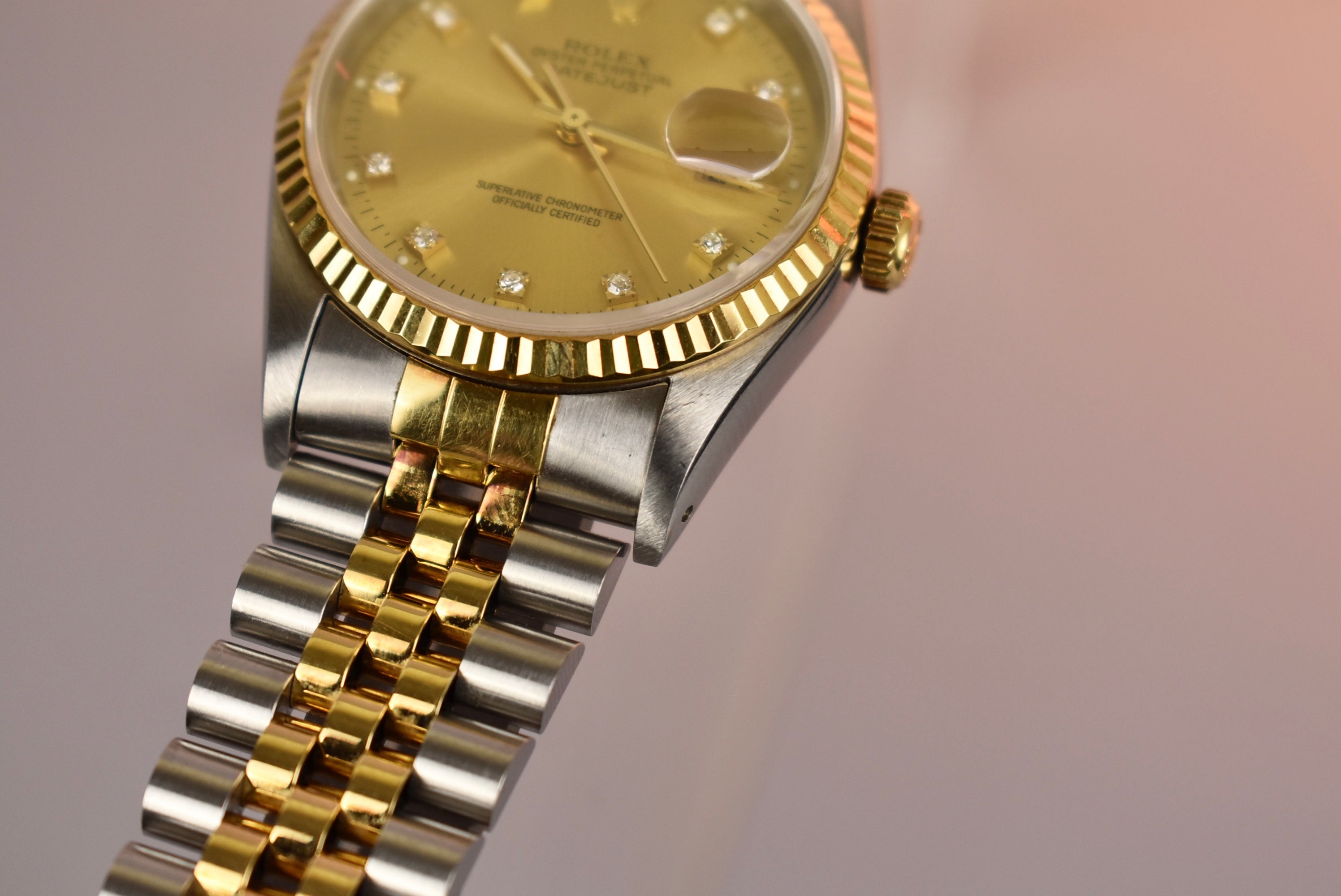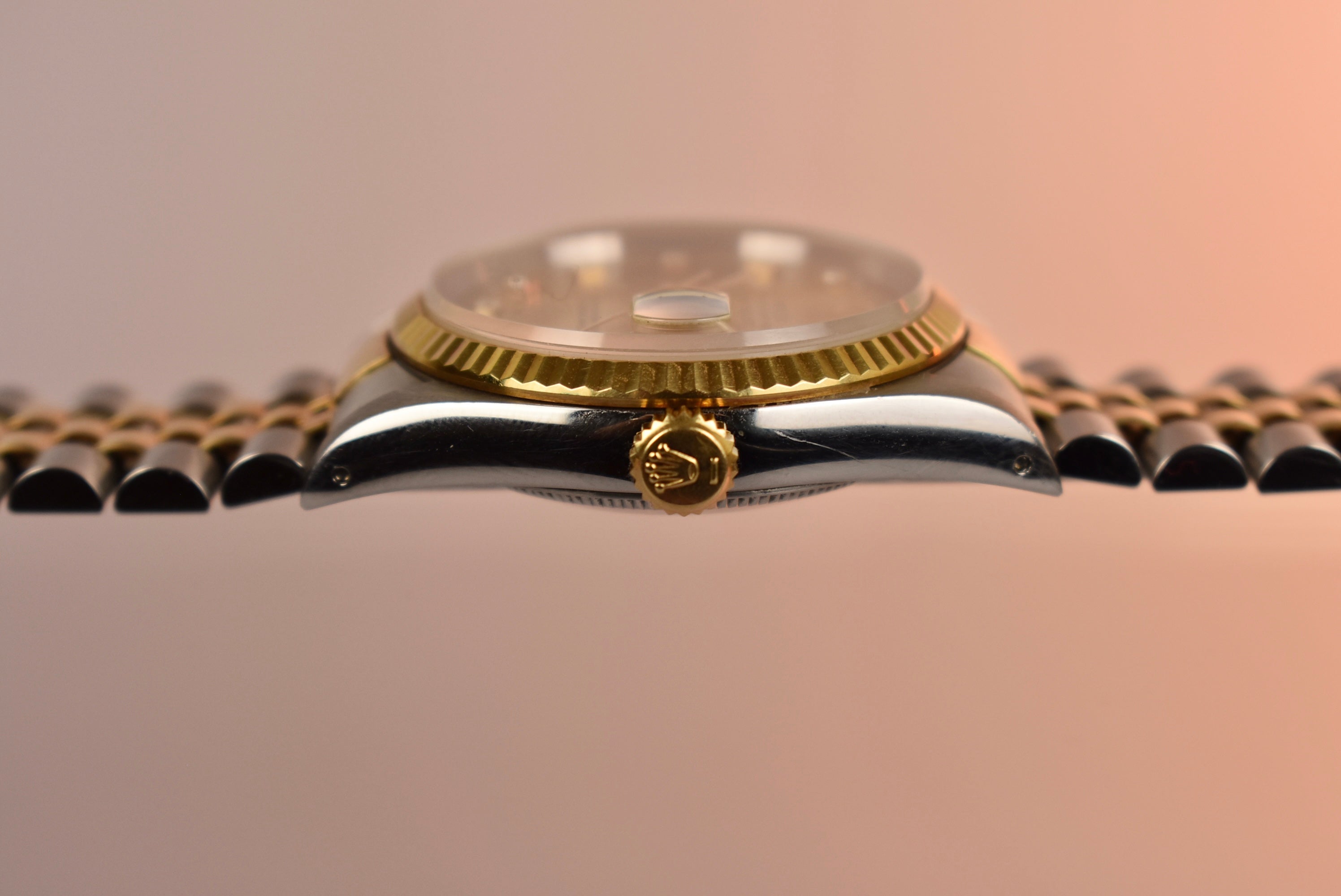 Hands down, the Rolex Datejust has becoming the most commonly know watch to everyone. The jubilee bracelet and fluted bezel work in harmony with a clean dial and simple date feature. The 16233 is also many people's sweet spot when it comes to Rolex. It is the most affordable Rolex model that can be had today with a sapphire crystal, quickset date and a two tone case and bracelet. This specific example has a factory diamond dial with its original box and papers