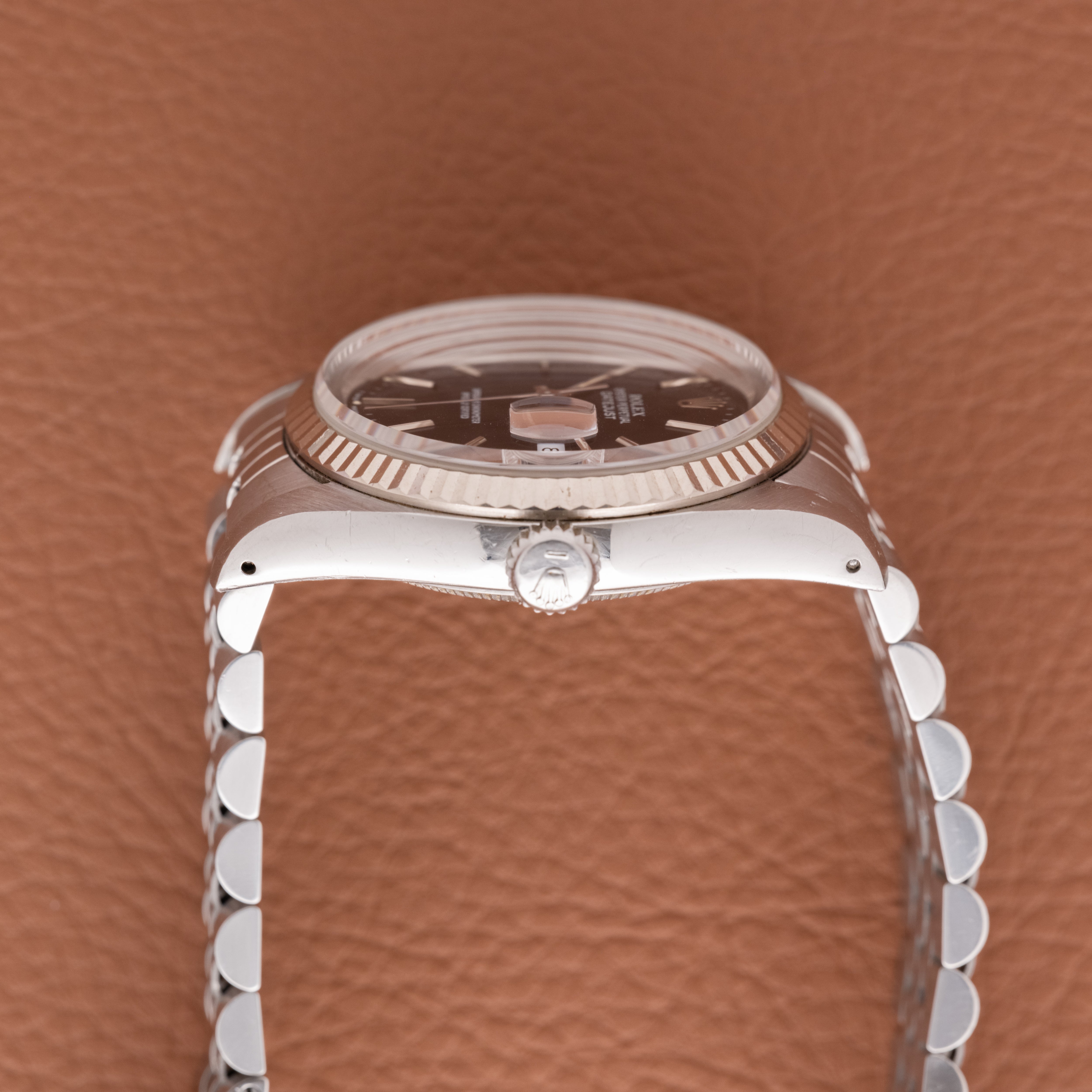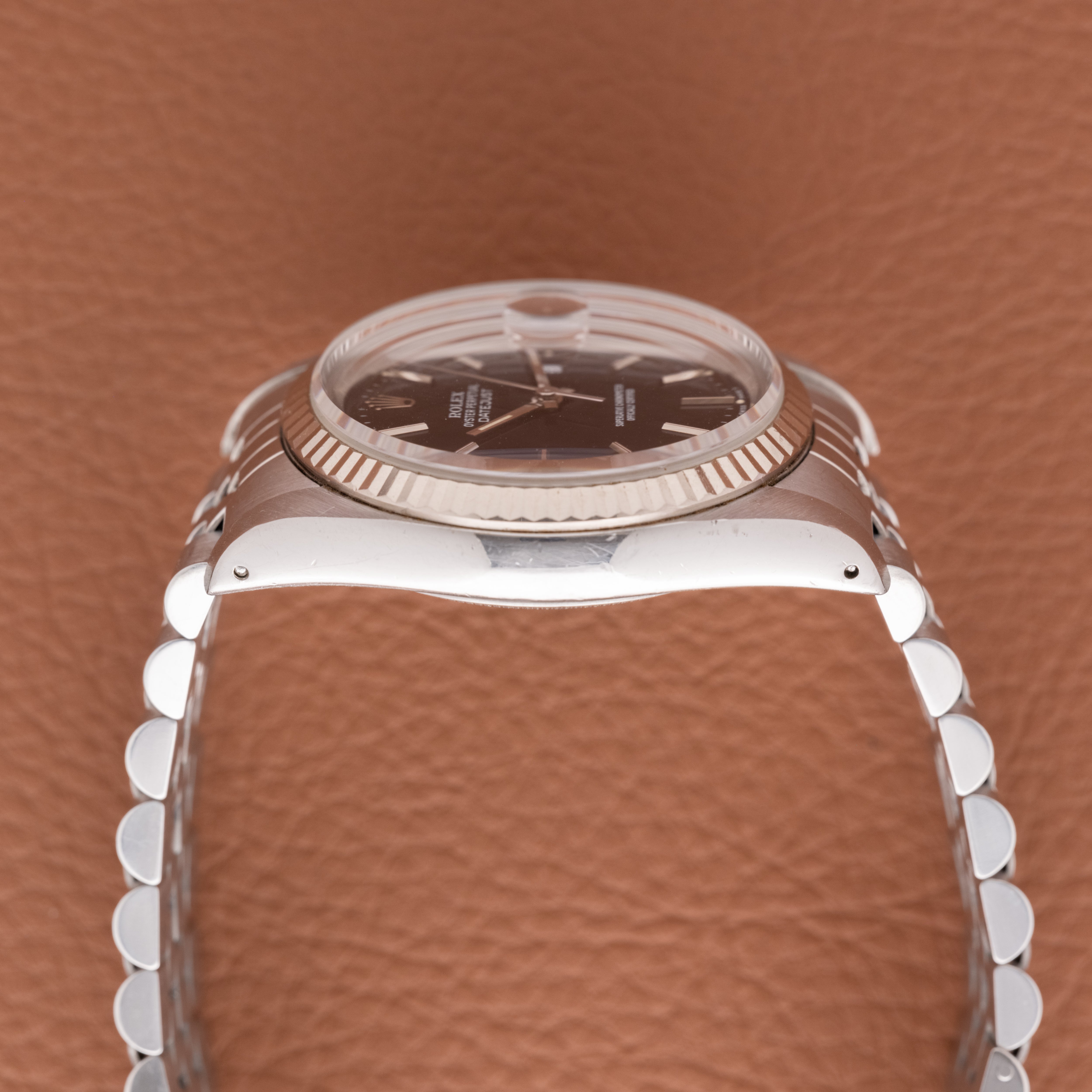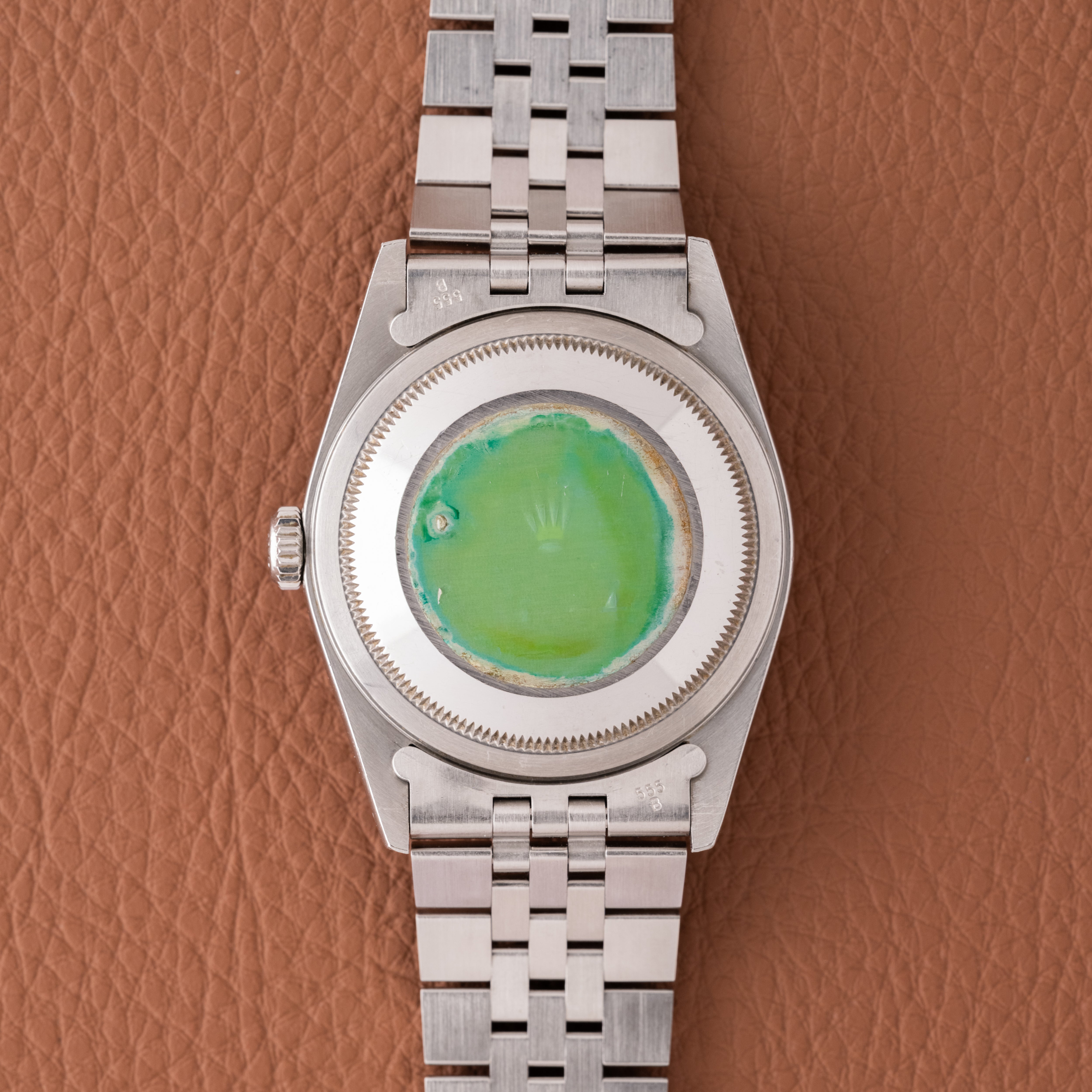 The dial shift is subtle but noticeable, especially in natural light, and it changes the feel of the watch quite a bit. The black dial has light taupe hues that make it feel a bit tropical at times. Also, condition like this is hard to come by. Sharp lugs, original lume, and the caseback sticker all together is not something you see often. It still wears like any great 36mm Datejust should, but there is just a bit more going on here if you care to notice it.