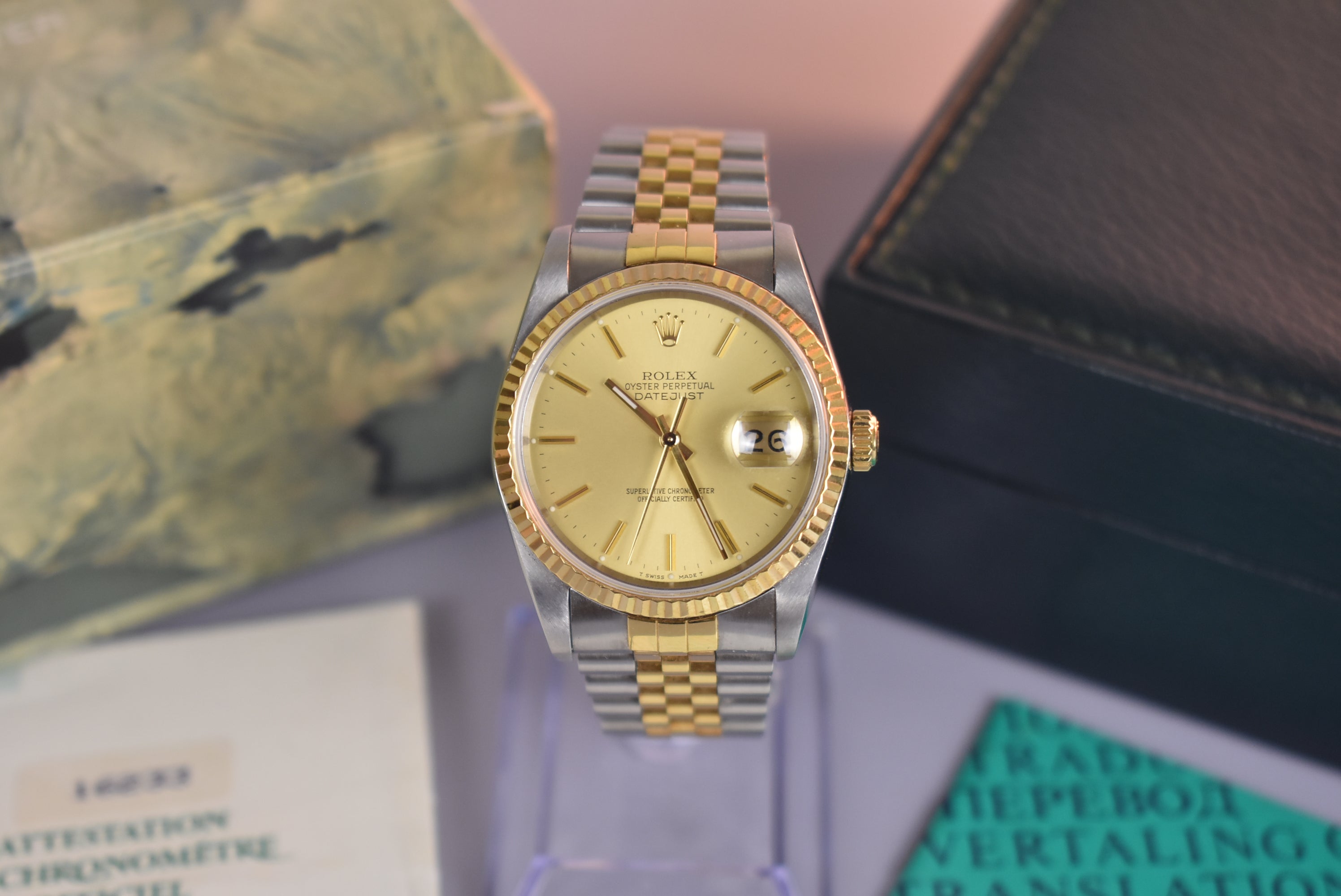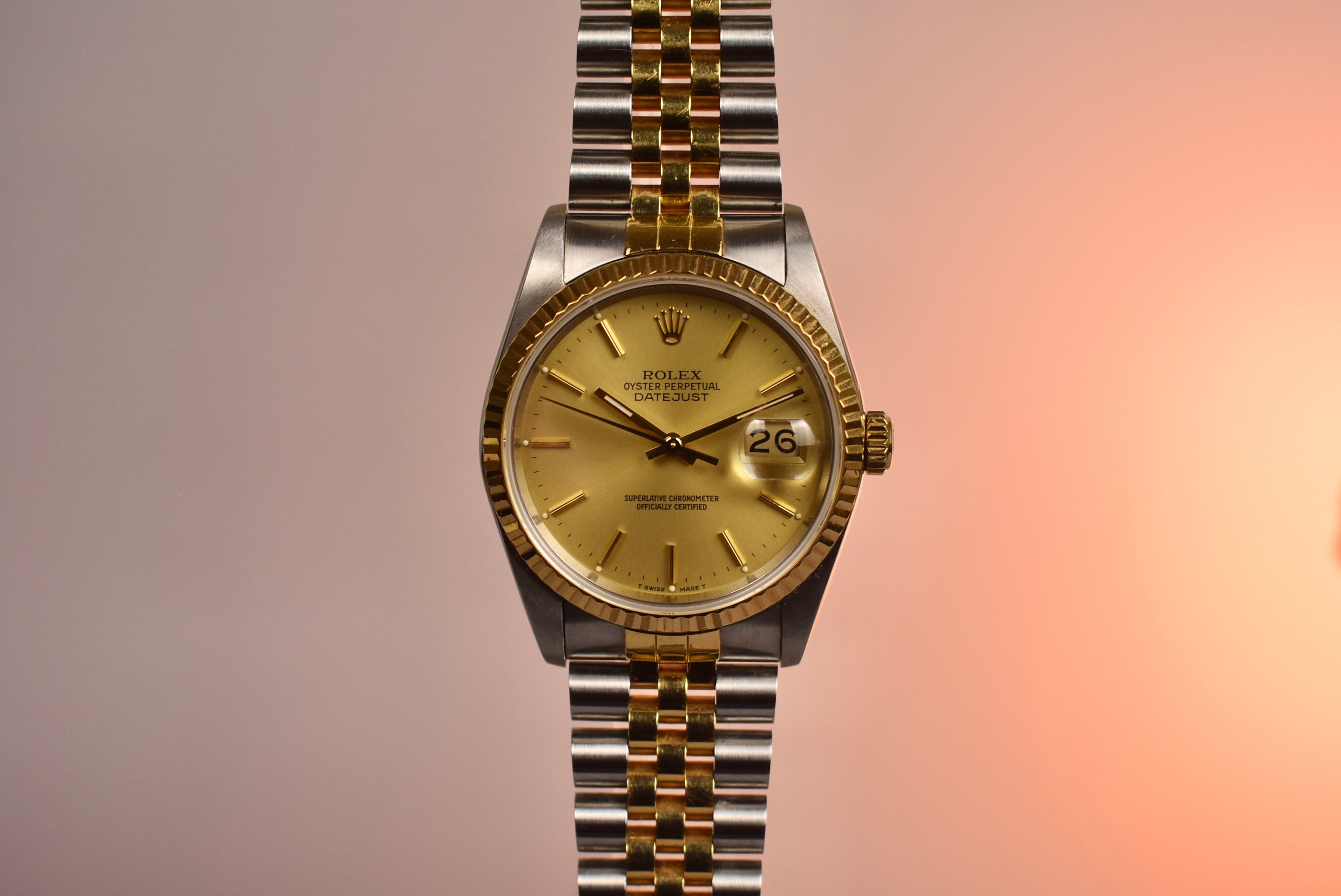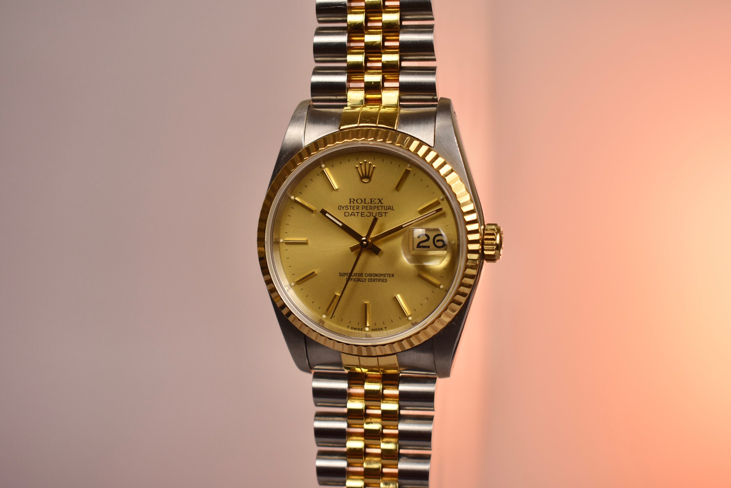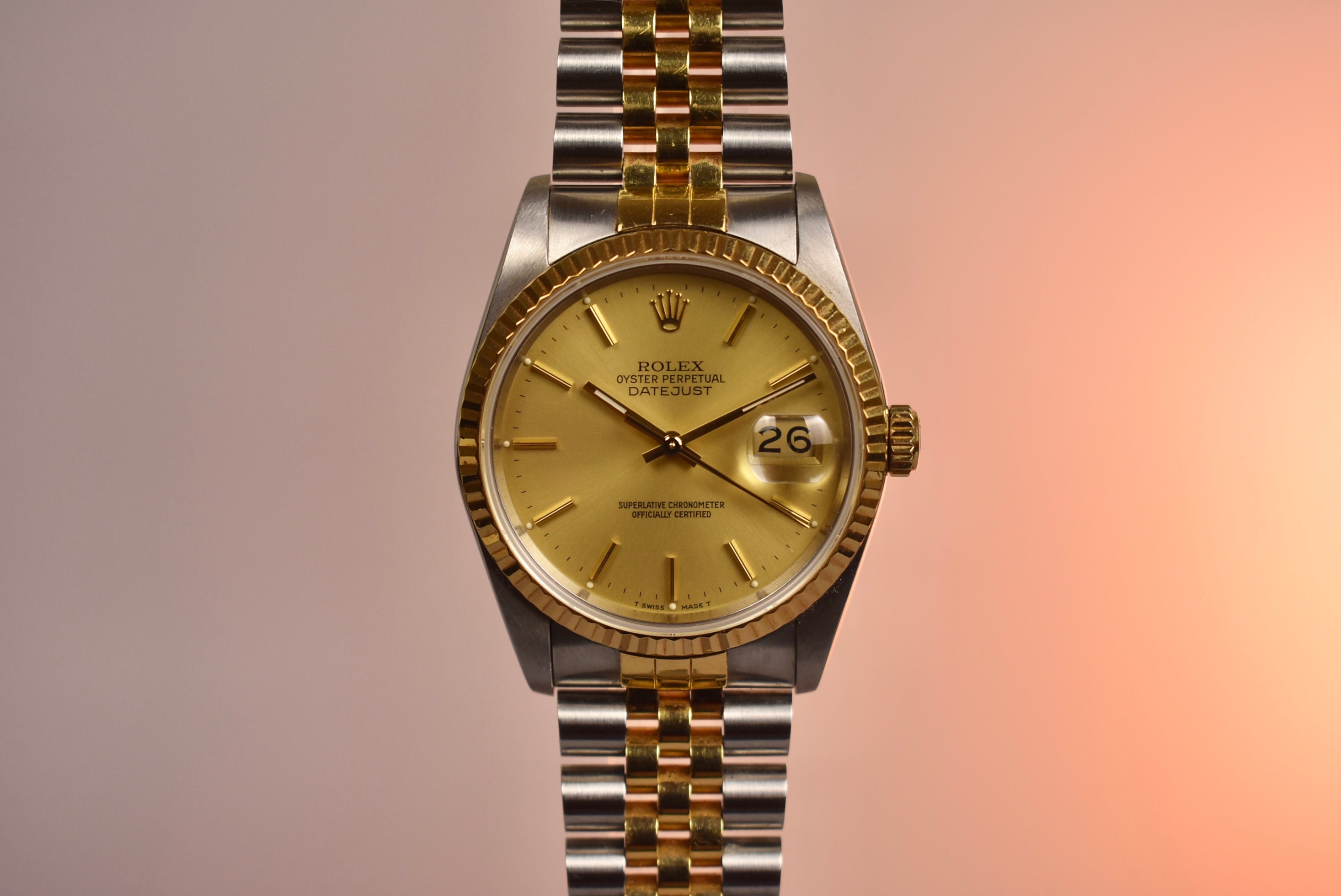 Hands down, the Rolex Datejust has becoming the most commonly know watch to everyone. The jubilee bracelet and fluted bezel work in harmony with a clean dial and simple date feature. The 16233 is also many people's sweet spot when it comes to Rolex. It is the most affordable Rolex model that can be had today with a sapphire crystal, quickset date and a two tone case and bracelet. This specific example has a champagne dial and its original box and papers.