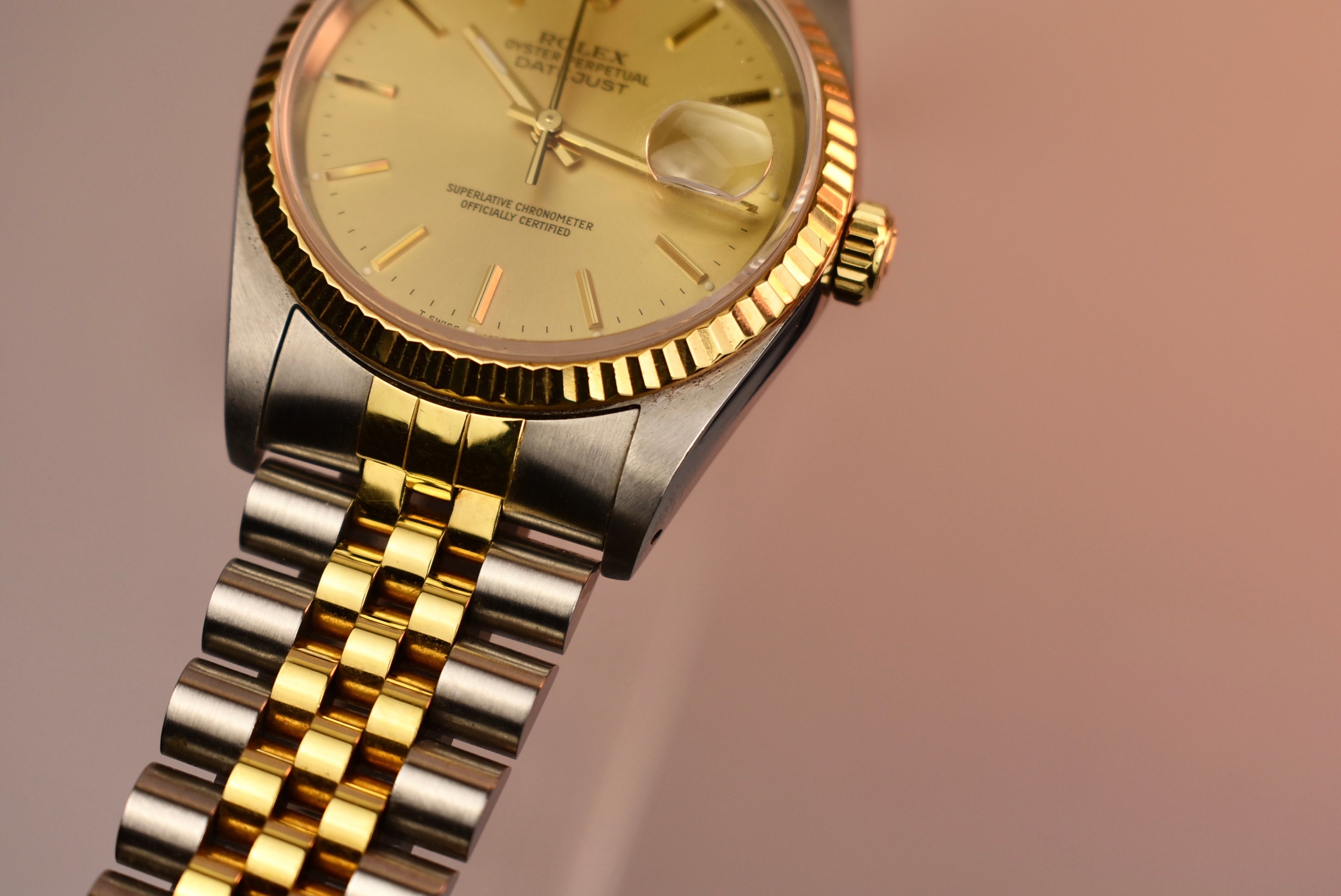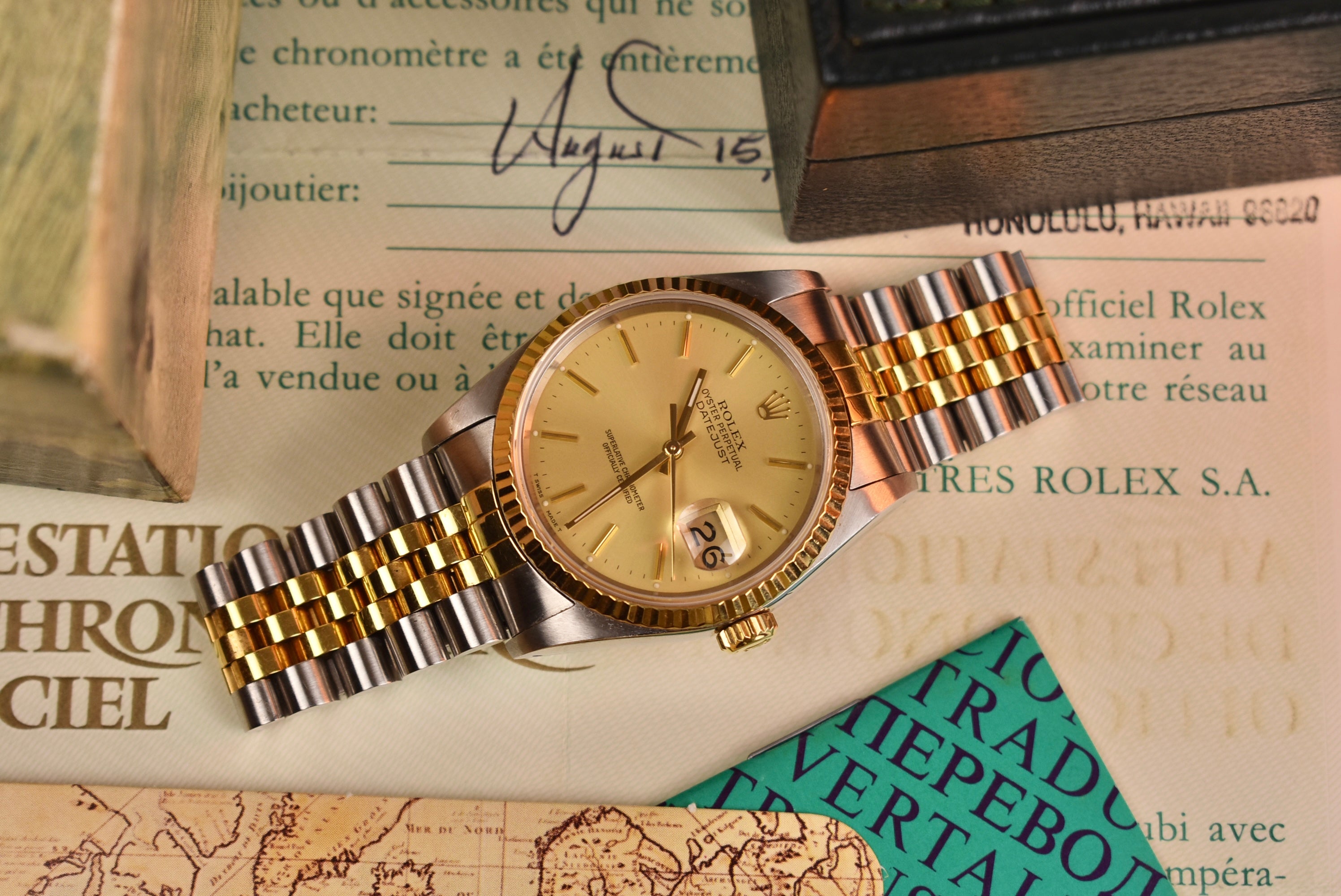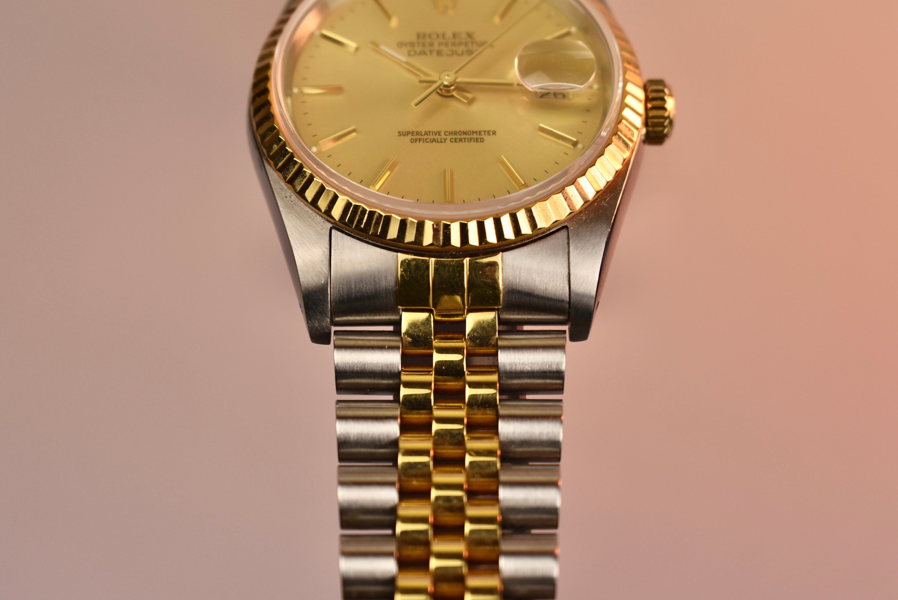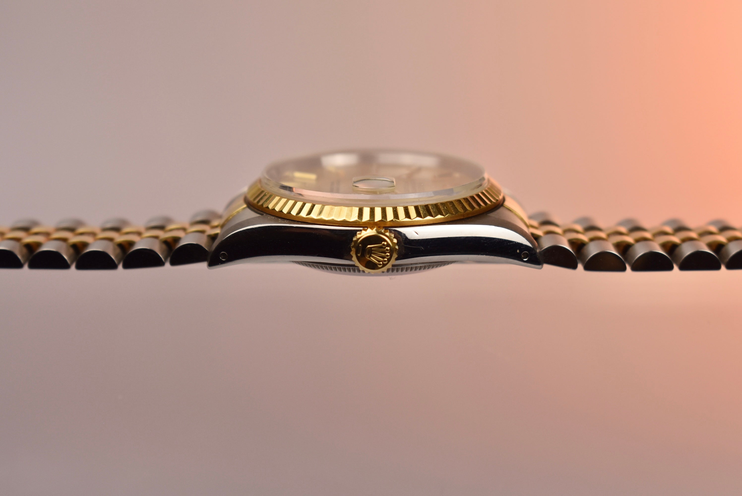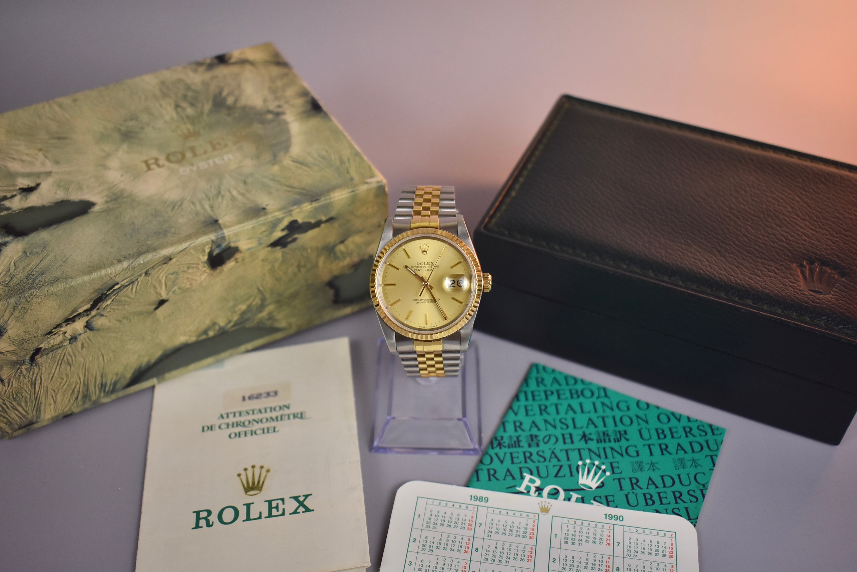 Hands down, the Rolex Datejust has becoming the most commonly know watch to everyone. The jubilee bracelet and fluted bezel work in harmony with a clean dial and simple date feature. The 16233 is also many people's sweet spot when it comes to Rolex. It is the most affordable Rolex model that can be had today with a sapphire crystal, quickset date and a two tone case and bracelet. This specific example has a champagne dial and its original box and papers.