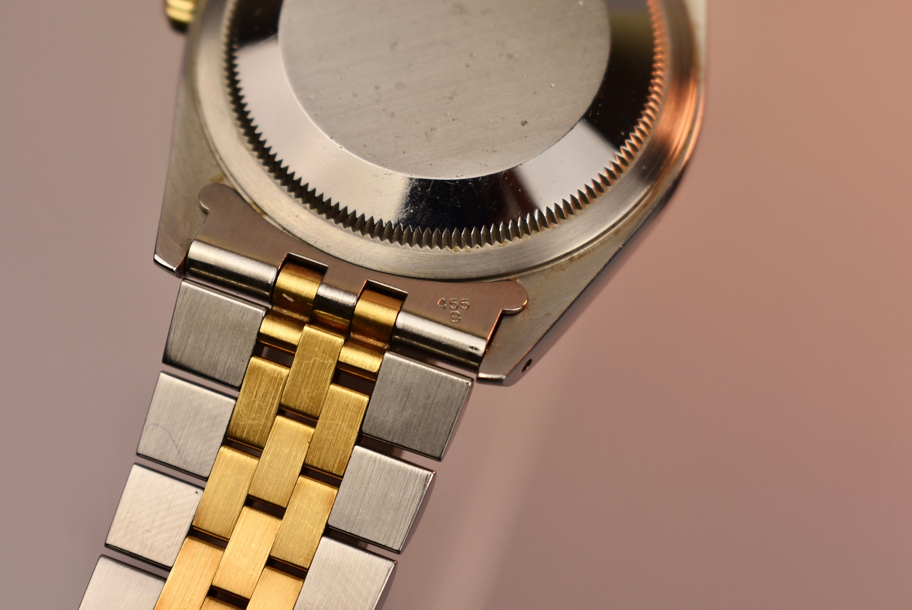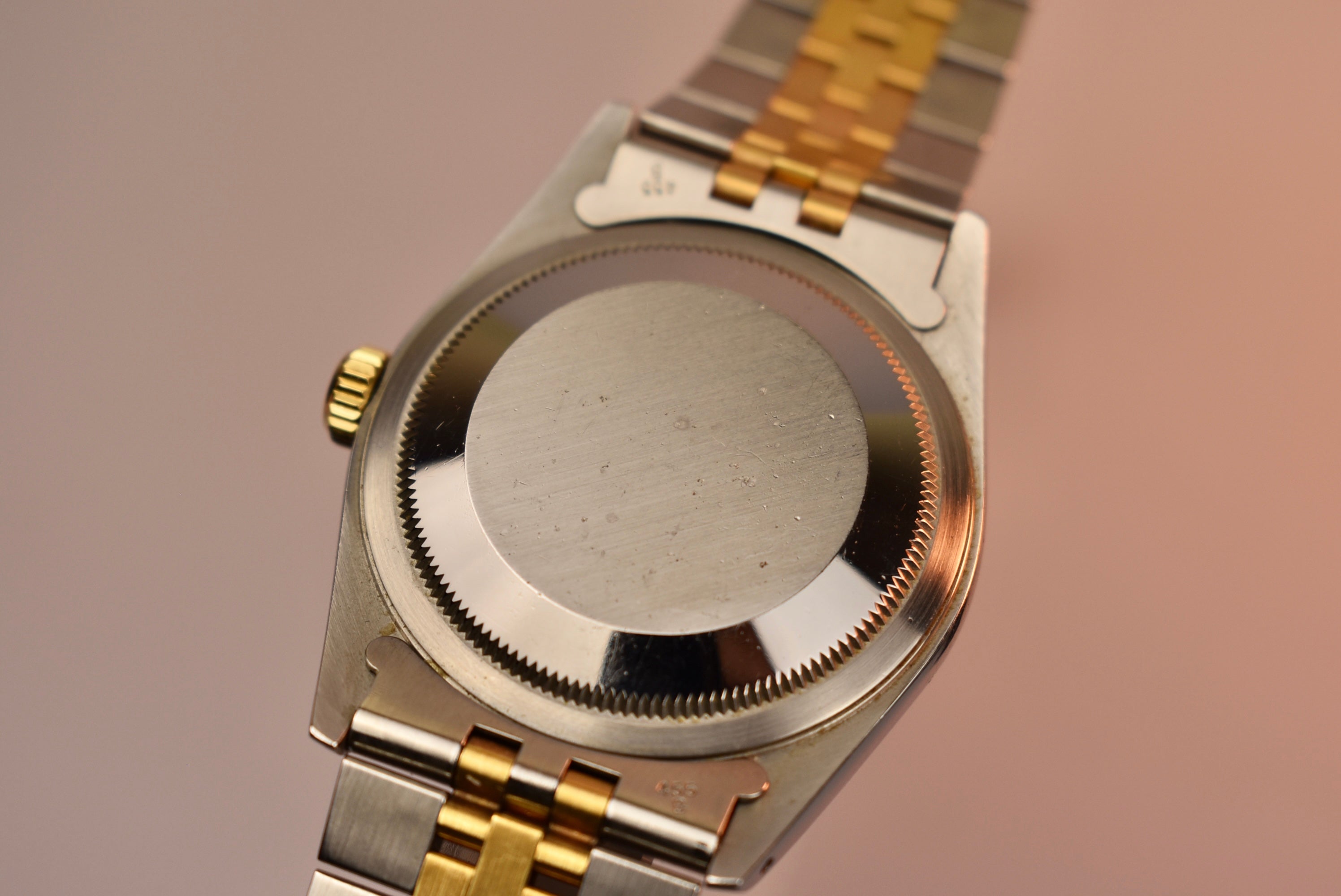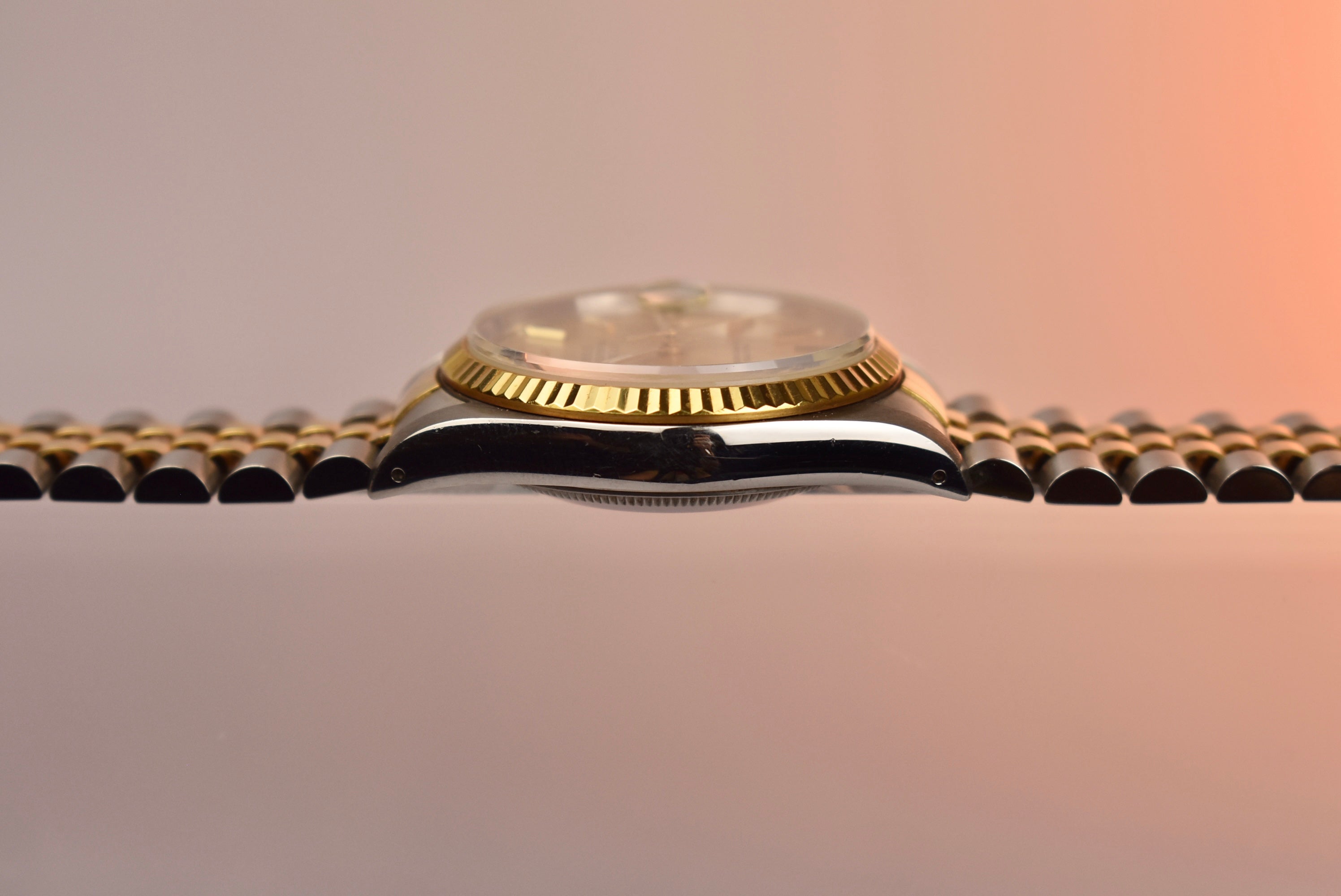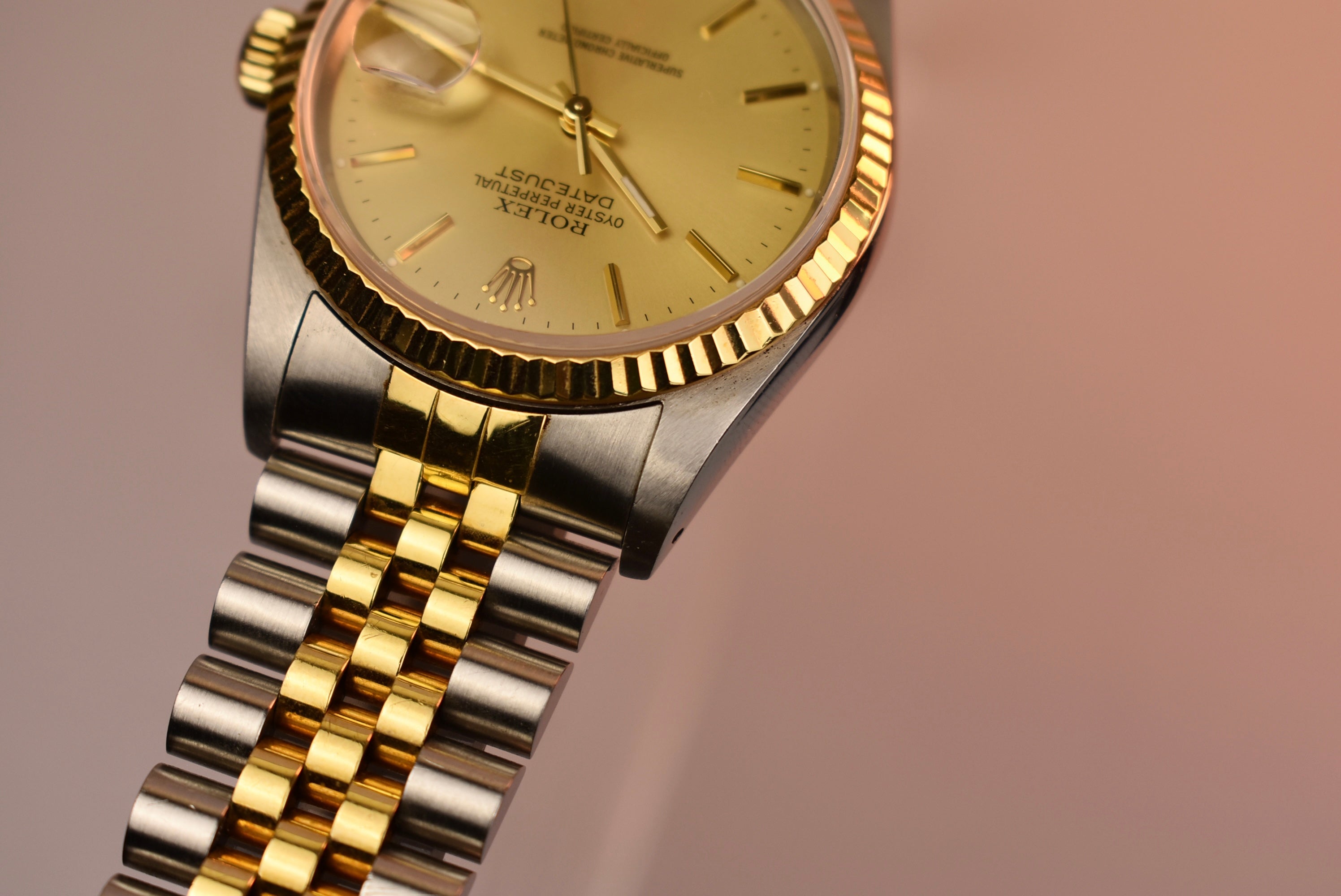 Hands down, the Rolex Datejust has becoming the most commonly know watch to everyone. The jubilee bracelet and fluted bezel work in harmony with a clean dial and simple date feature. The 16233 is also many people's sweet spot when it comes to Rolex. It is the most affordable Rolex model that can be had today with a sapphire crystal, quickset date and a two tone case and bracelet. This specific example has a champagne dial and its original box and papers.