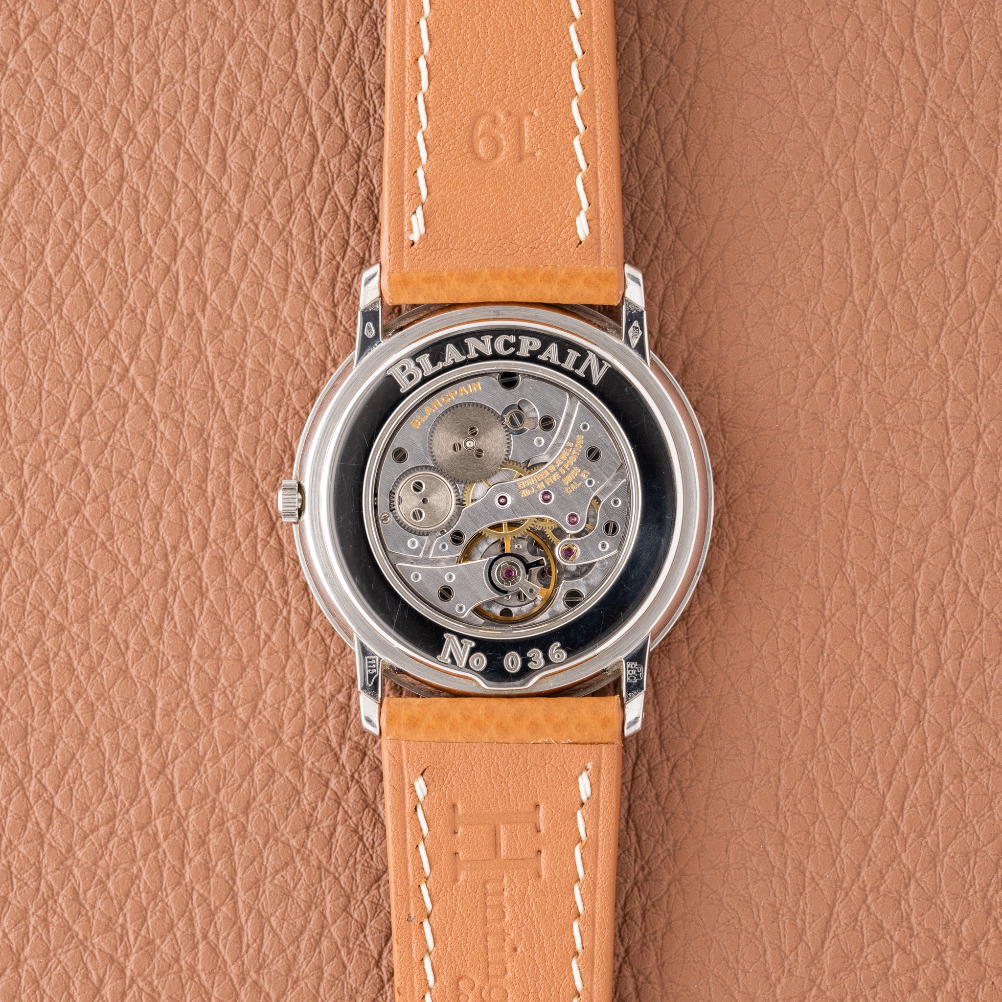 Inside is a manually wound ultra-thin Blancpain movement, visible through the sapphire caseback. The movement finishing is thoughtful and deliberate, with attention given to layout and proportion rather than theatrical decoration. Watches like this were never produced in large numbers, and platinum examples were always reserved for clients who understood exactly what they were buying. As a result, they remain relatively uncommon today, particularly in complete and well-preserved condition.