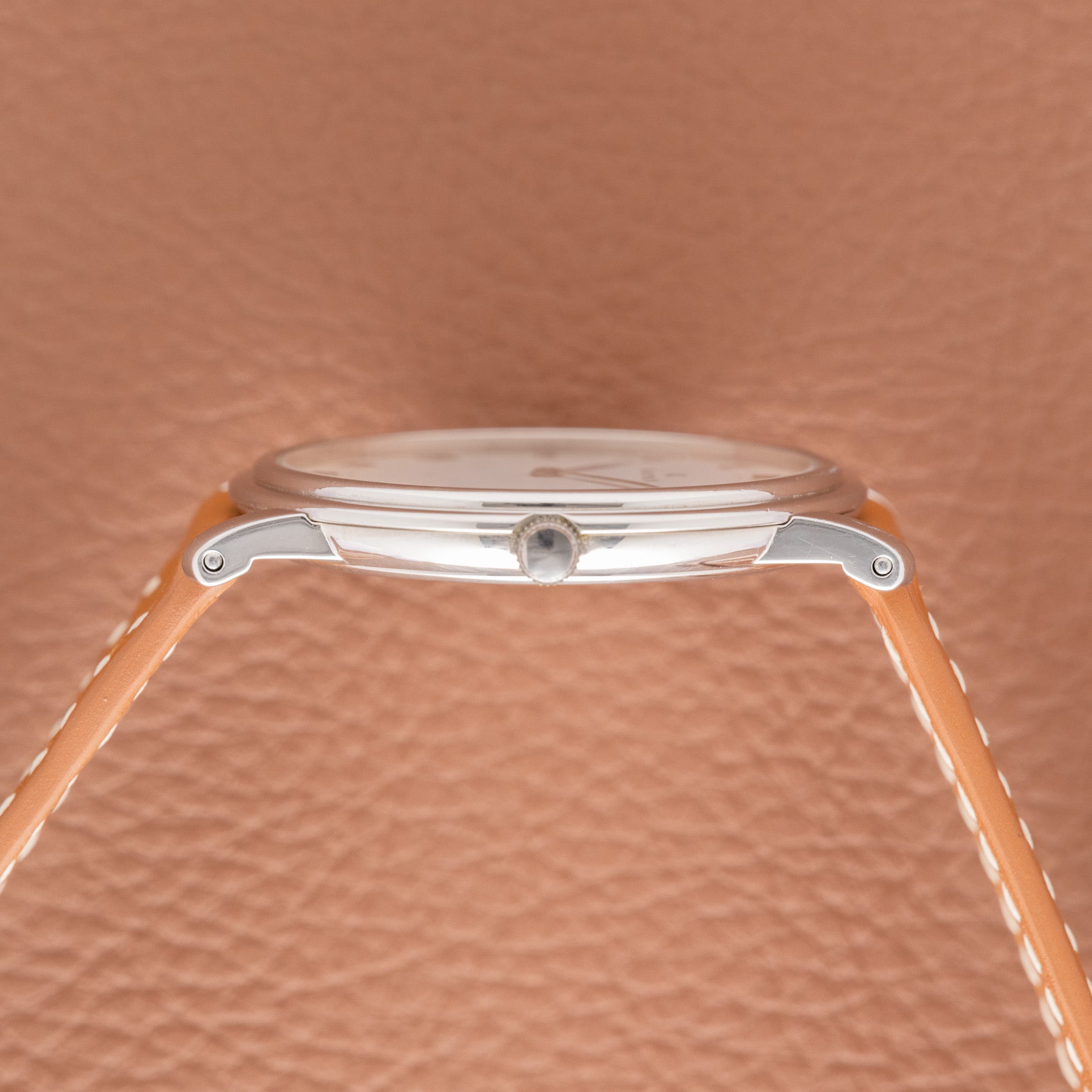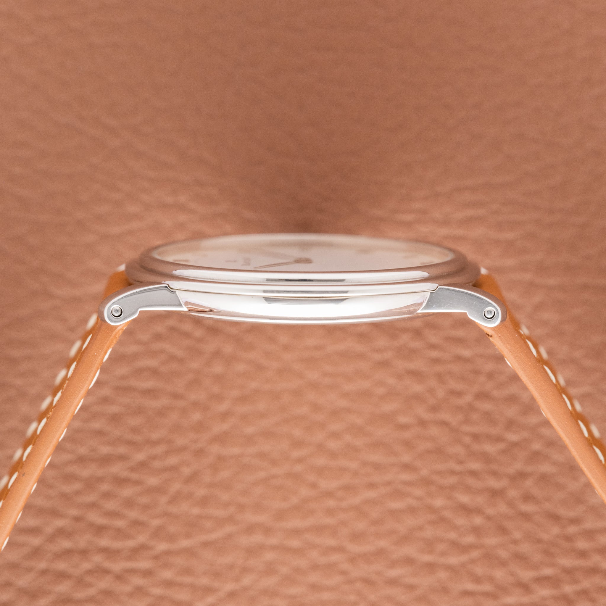 What makes this reference especially compelling is its simplicity. The clean white dial with printed Roman numerals recalls mid-century dress watches, yet the execution is unmistakably modern in its precision and finishing. There is no date window, no excess text, and no decorative flourish beyond what is necessary. The result is a watch that feels timeless rather than vintage-inspired.