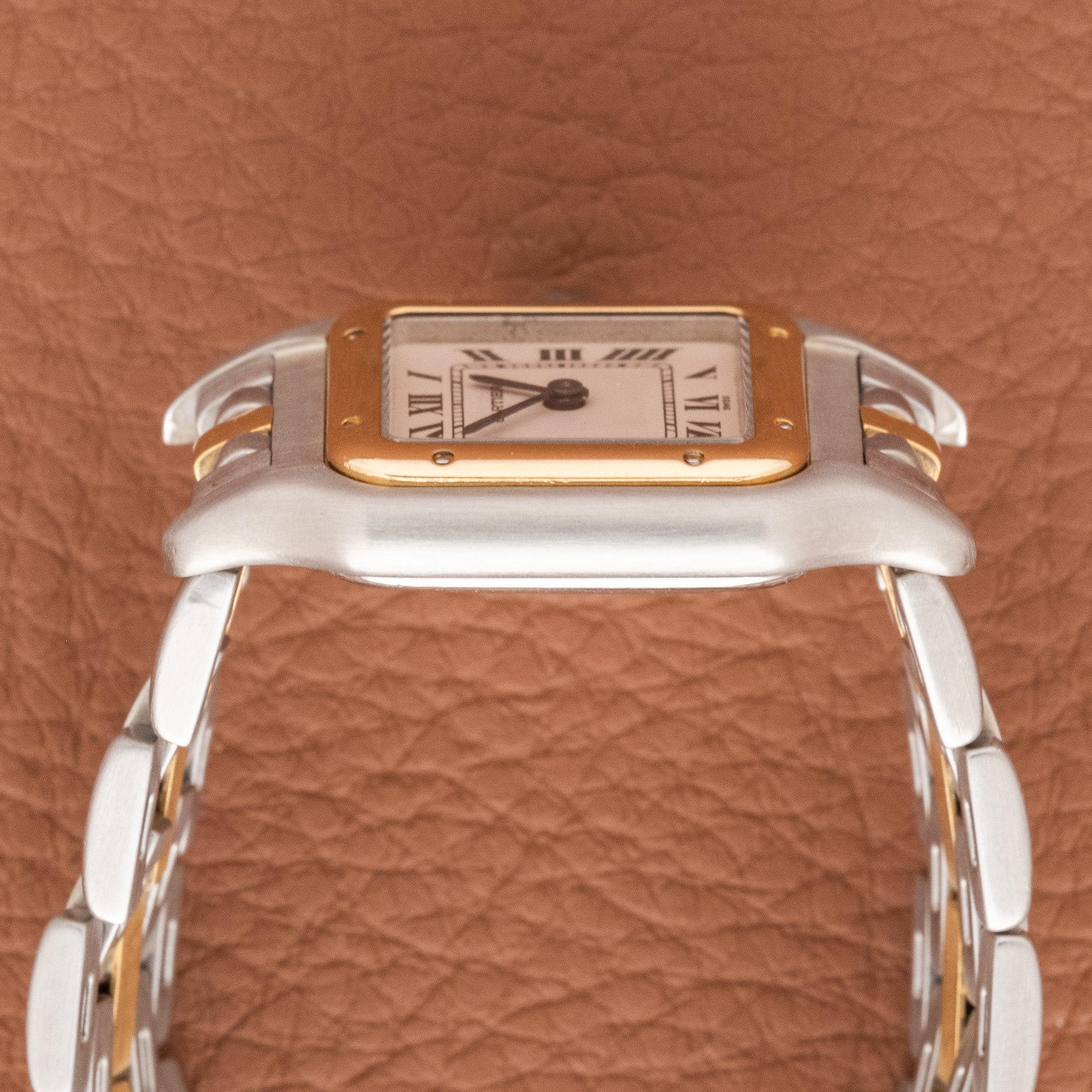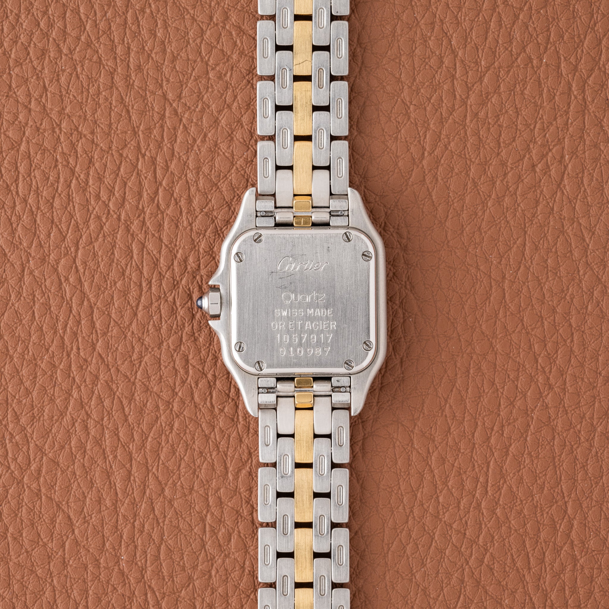 This reference 1057917 represents the smaller, two-tone variation of the Panthère, featuring a stainless steel case with a single row of solid 18k yellow gold links down the bracelet and a matching gold bezel. The opaline dial with black Roman numerals and blued-steel hands remains quintessentially Cartier. Inside beats a reliable quartz movement, ensuring precision with minimal maintenance. The case and bracelet retain the slim, elegant silhouette that made the Panthère a lasting icon in both watchmaking and fashion.