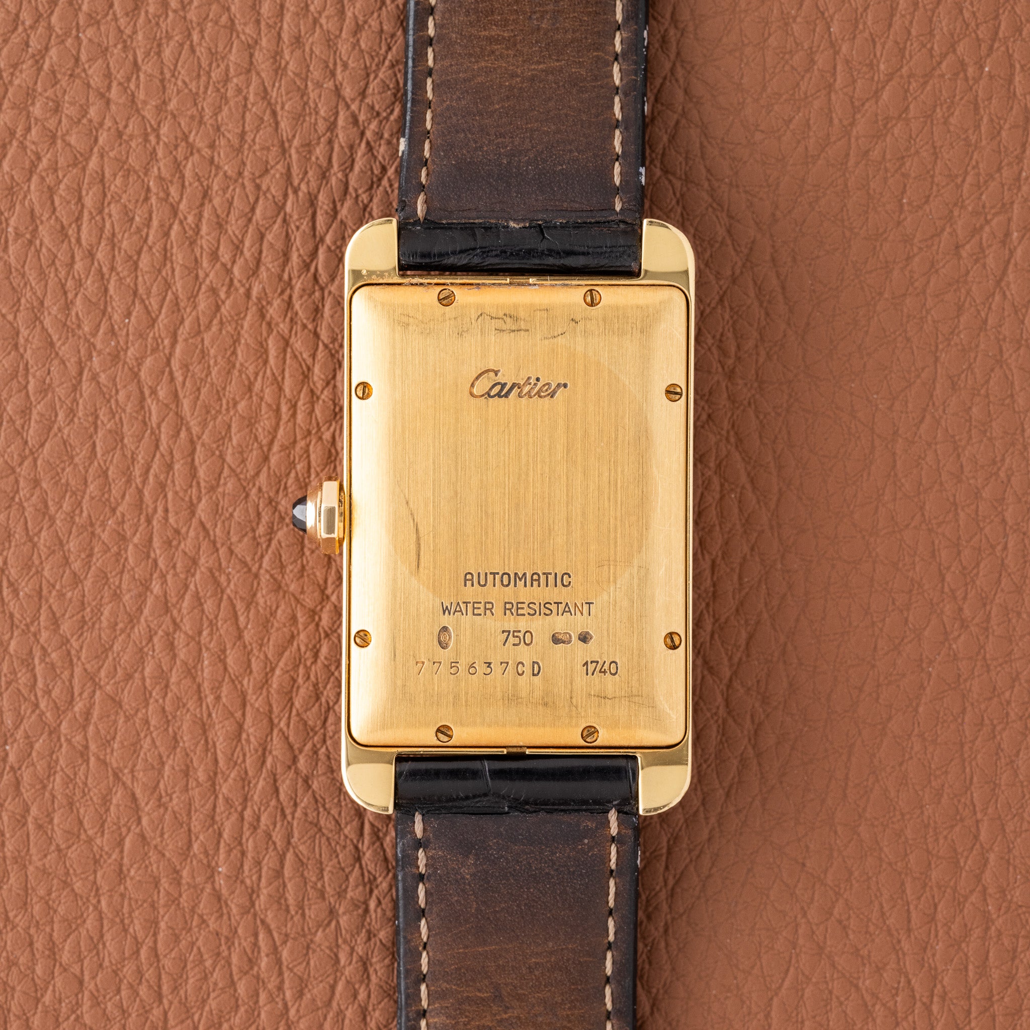 The Cartier Tank Américaine was introduced in 1989 as a reinterpretation of the earlier Tank Cintrée, retaining the elegant curvature of the case while adapting it for automatic movements and modern dimensions. The reference 1740 (also known as W2603156) represents the larger version in solid 18k yellow gold, striking a balance between classic Cartier proportions and a contemporary wrist presence. Its guilloché dial, Roman numerals, and blued hands capture the brand’s design language that has defined dress watch elegance for over a century.