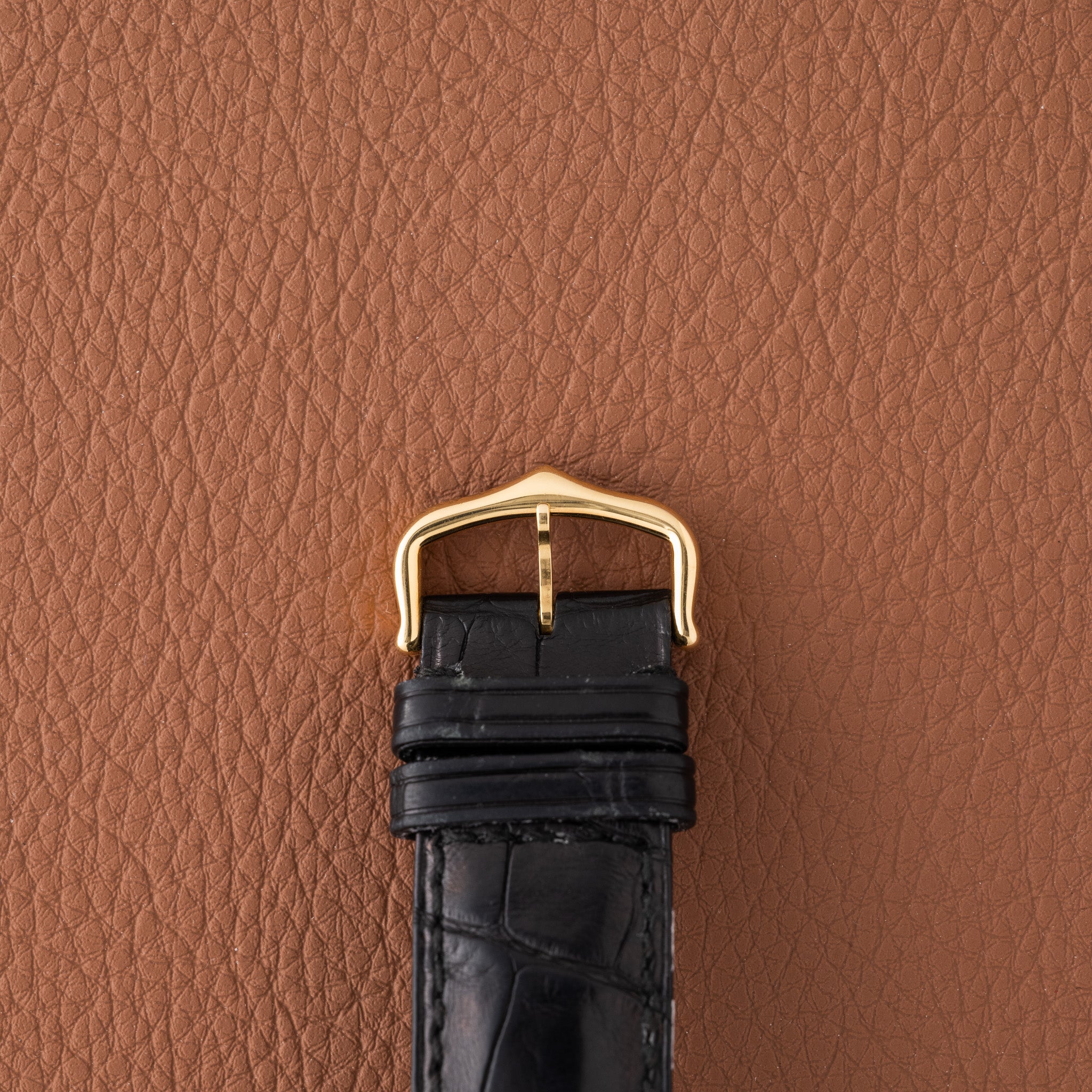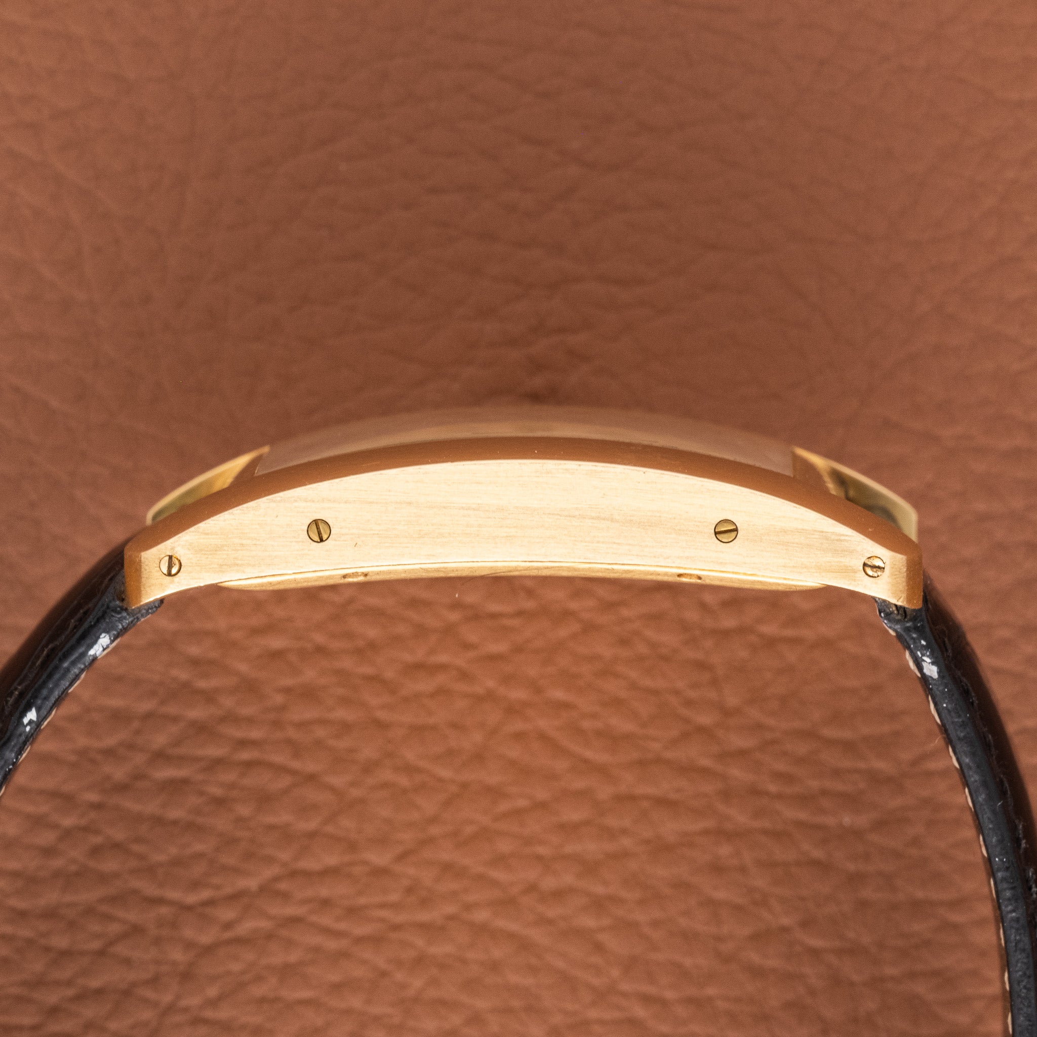 The larger yellow gold Américaine stands out as one of Cartier’s most wearable precious metal models. It offers the visual charm of the Cintrée’s elongated form but with a sturdier build and automatic convenience. This example’s original strap and solid gold buckle complete the package, making it an exceptional representation of late 20th-century Cartier design.