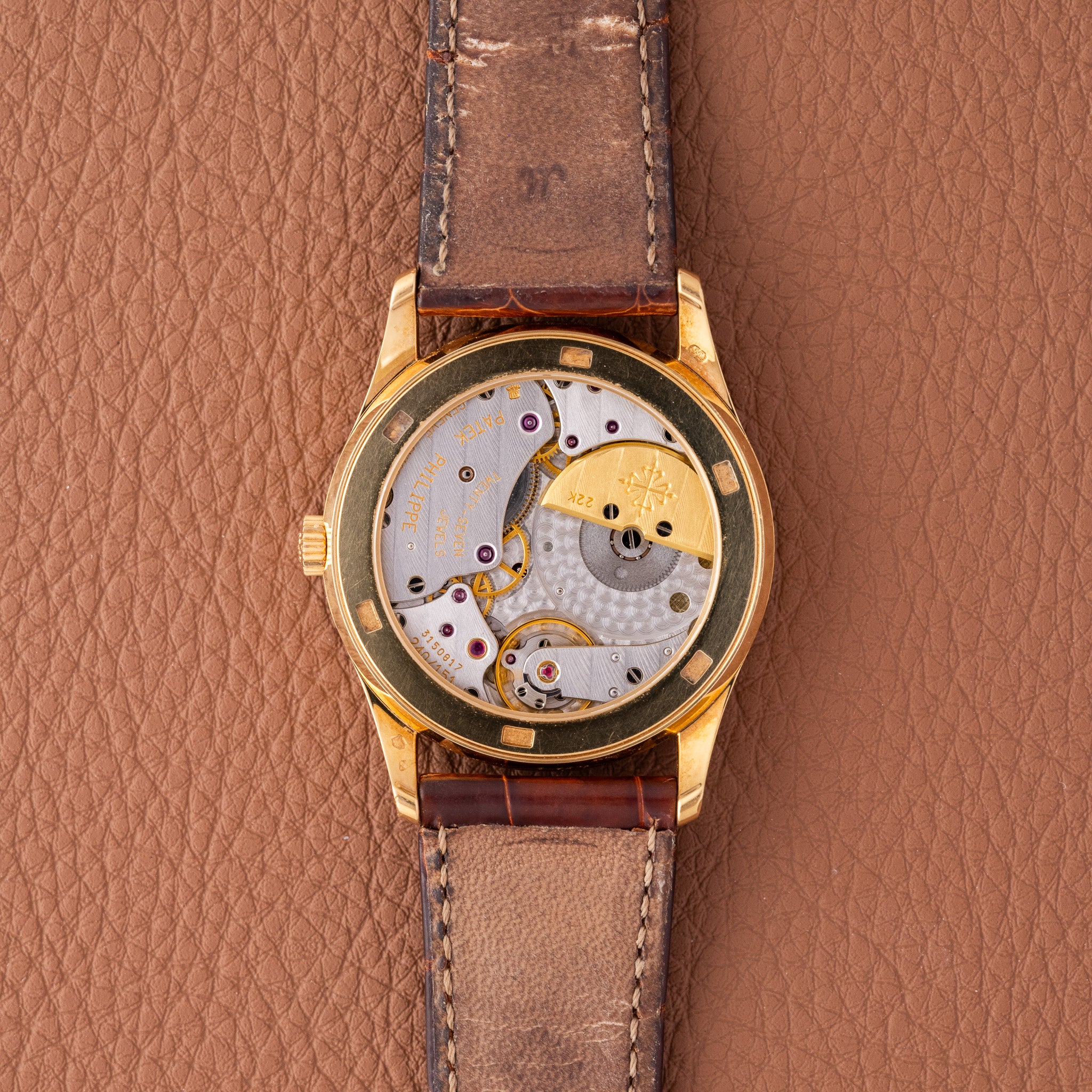 At the heart of the watch beats the Caliber 240, one of Patek Philippe’s most admired self-winding movements. The micro-rotor architecture allows for an ultra-thin profile while preserving precise chronometry and beautiful finishing, including Geneva striping and anglage.