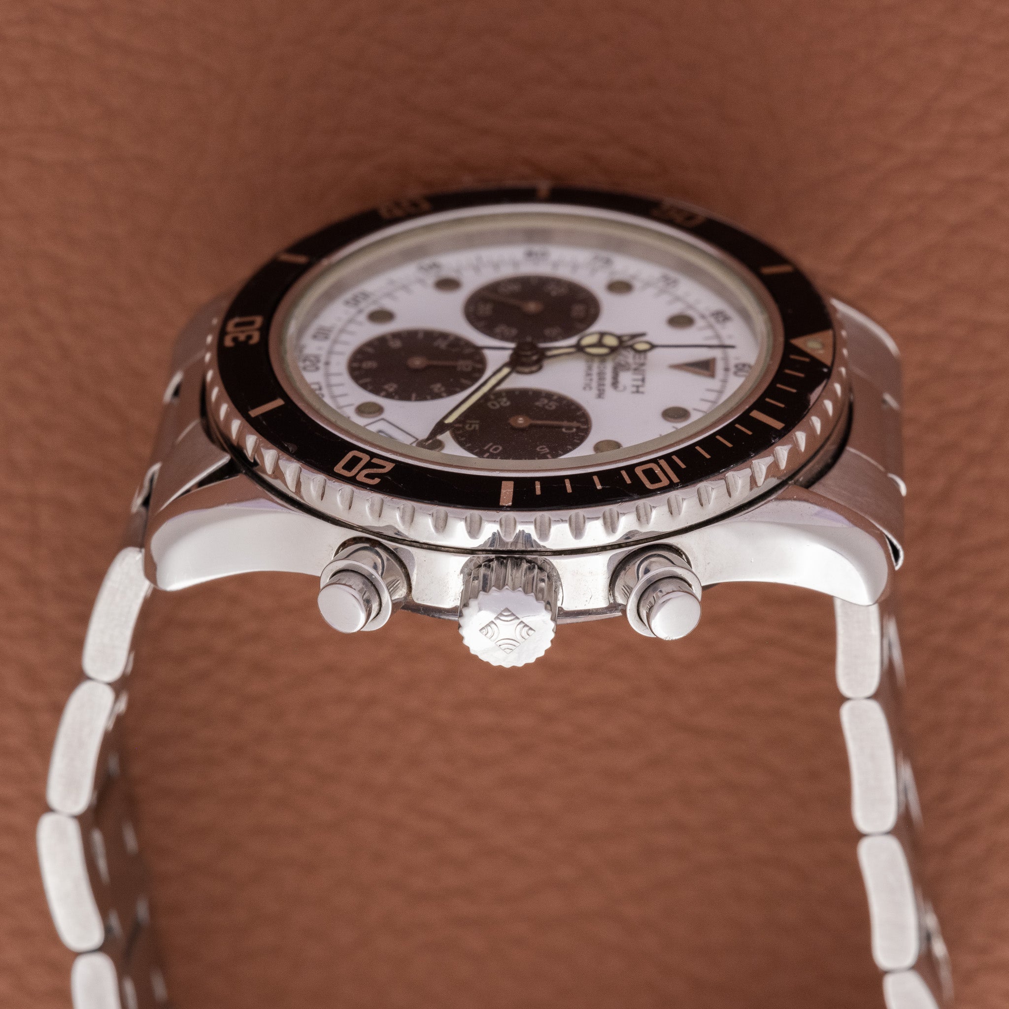 Four versions of the De Luca were produced during this period, totaling approximately 6,500 pieces across panda and reverse panda dial configurations. With each iteration, Zenith refined the design, adding features like screw-down pushers, updated bezels, and slightly altered case dimensions, bringing the De Luca closer to the aesthetic of the Rolex Daytona while maintaining its El Primero identity.