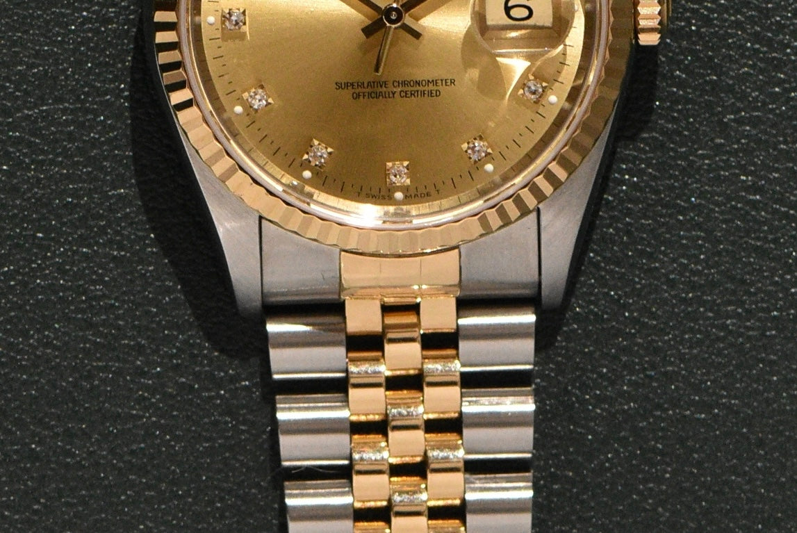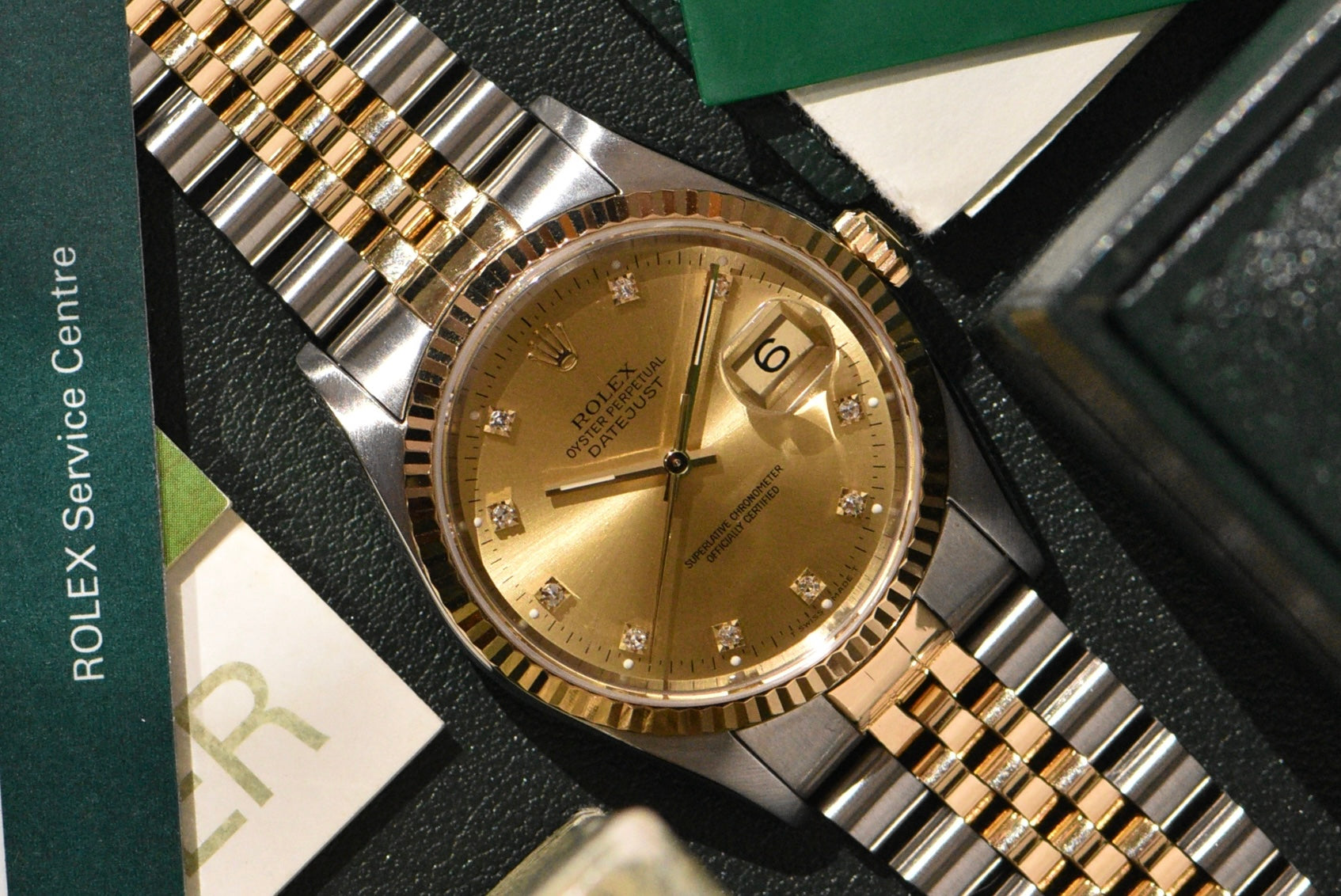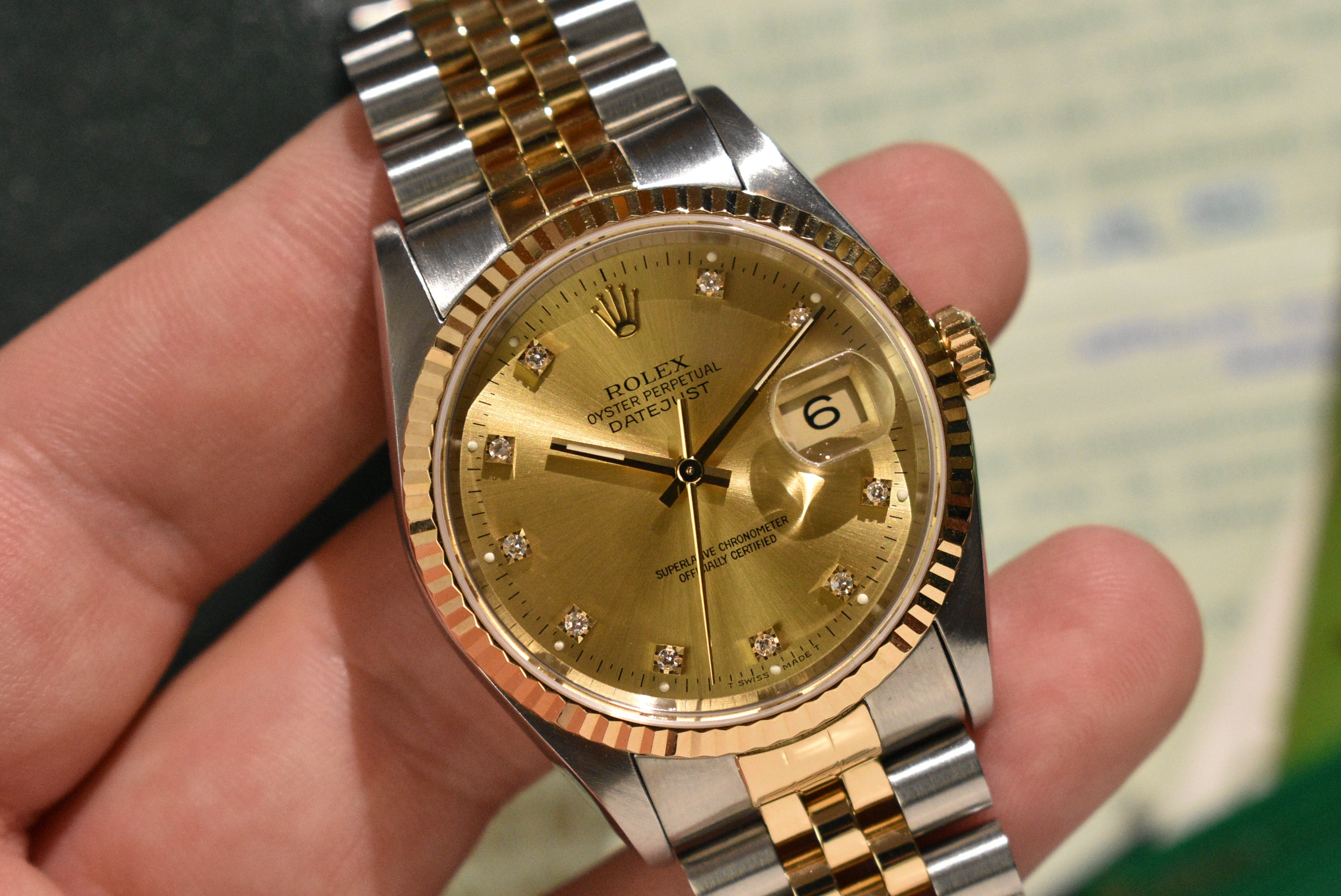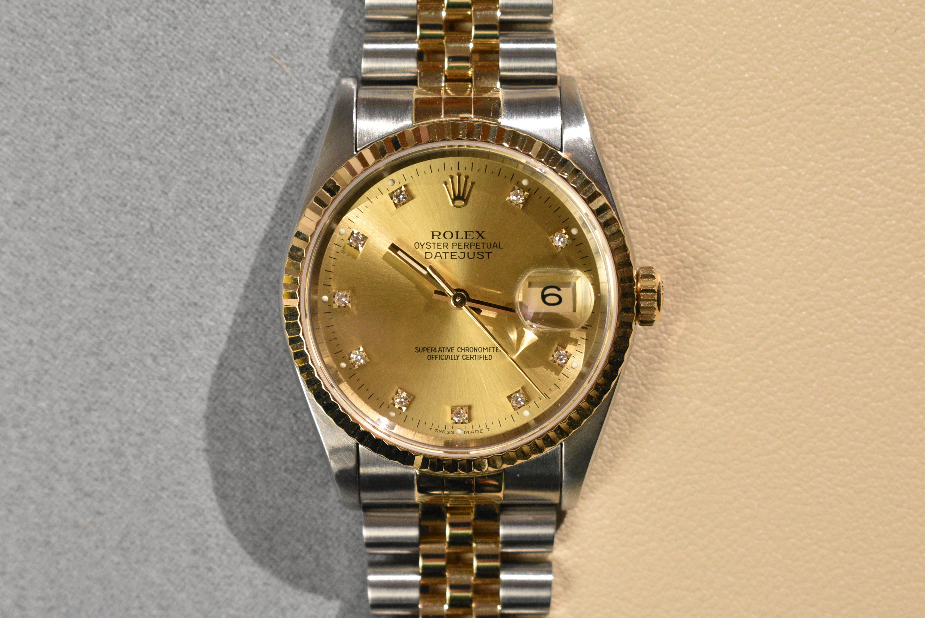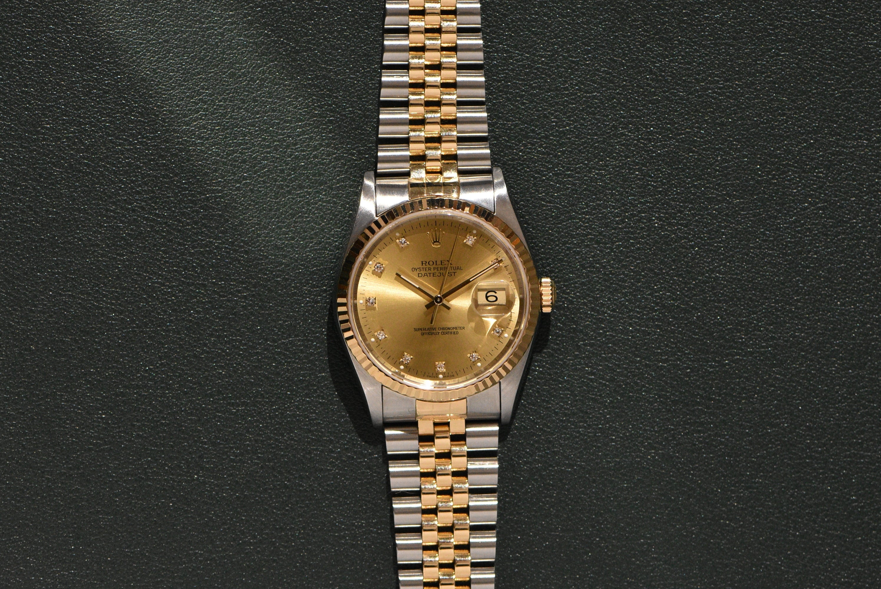 Hands down, the Rolex Datejust has become the most commonly known watch to everyone. The jubilee bracelet and fluted bezel work in harmony with a clean dial and simple date feature. The 16233 is also many people's sweet spot when it comes to Rolex. It is the most affordable Rolex model that can be had today with a sapphire crystal, quickset date, and a two-tone case and bracelet. This 16233 comes with a factory diamond dial.