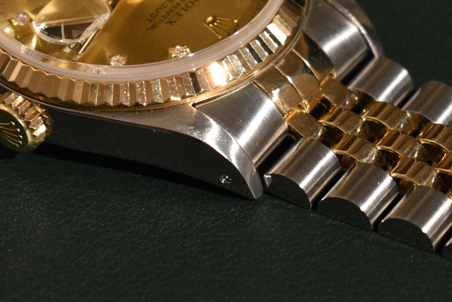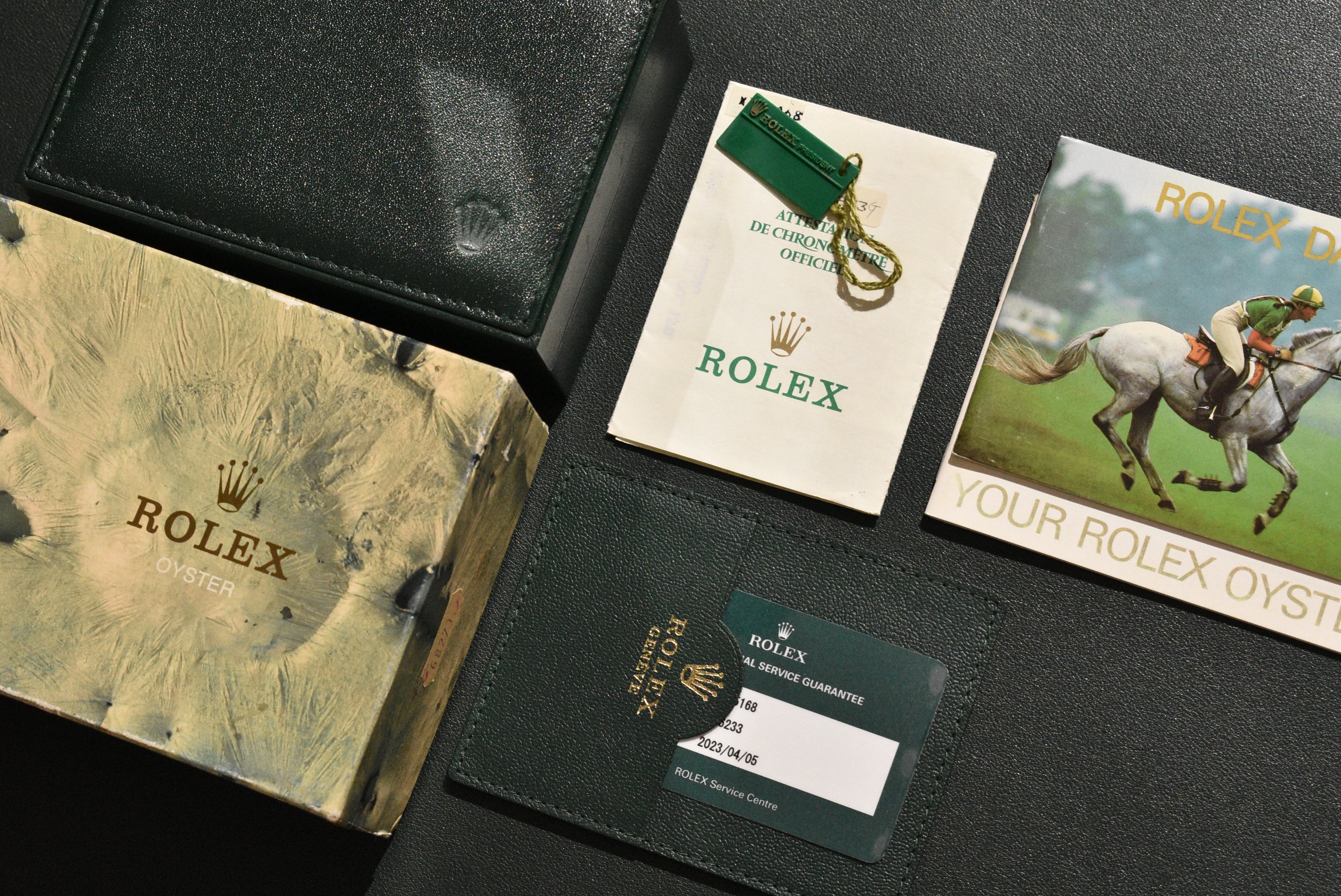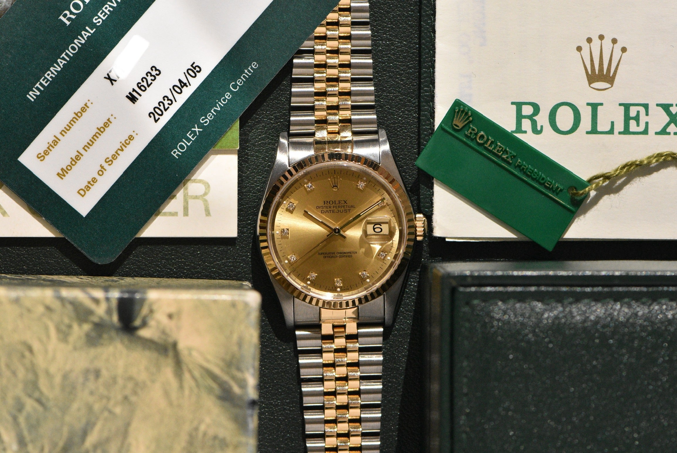 This 16233G has a clean factory diamond dial with tritium lume. The watch has recently been serviced and polished by Rolex and comes with the Rolex Service Certificate from 2023. The watch is in great shape, seeing that it was serviced by Rolex themselves. The watch comes complete with box and papers.
