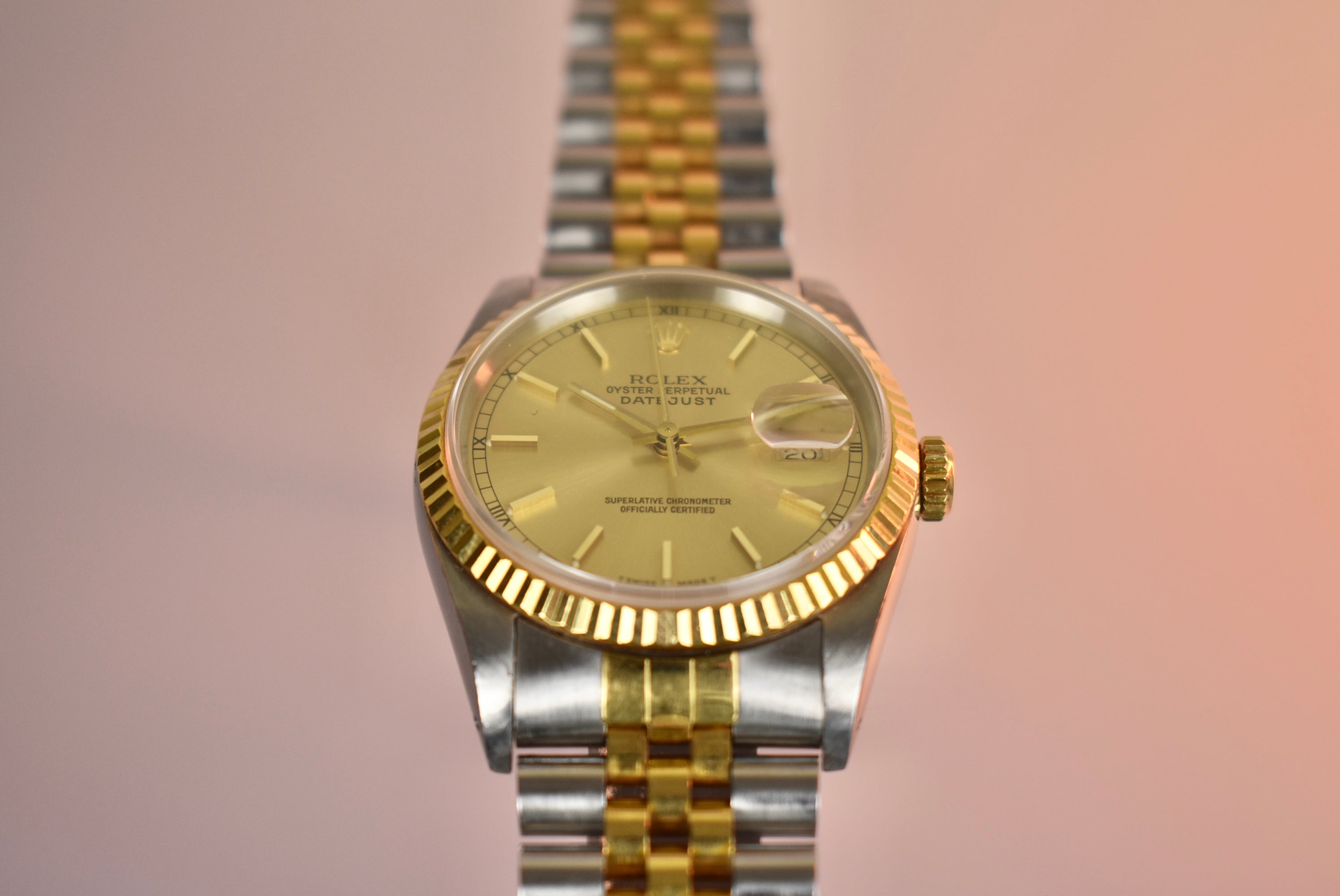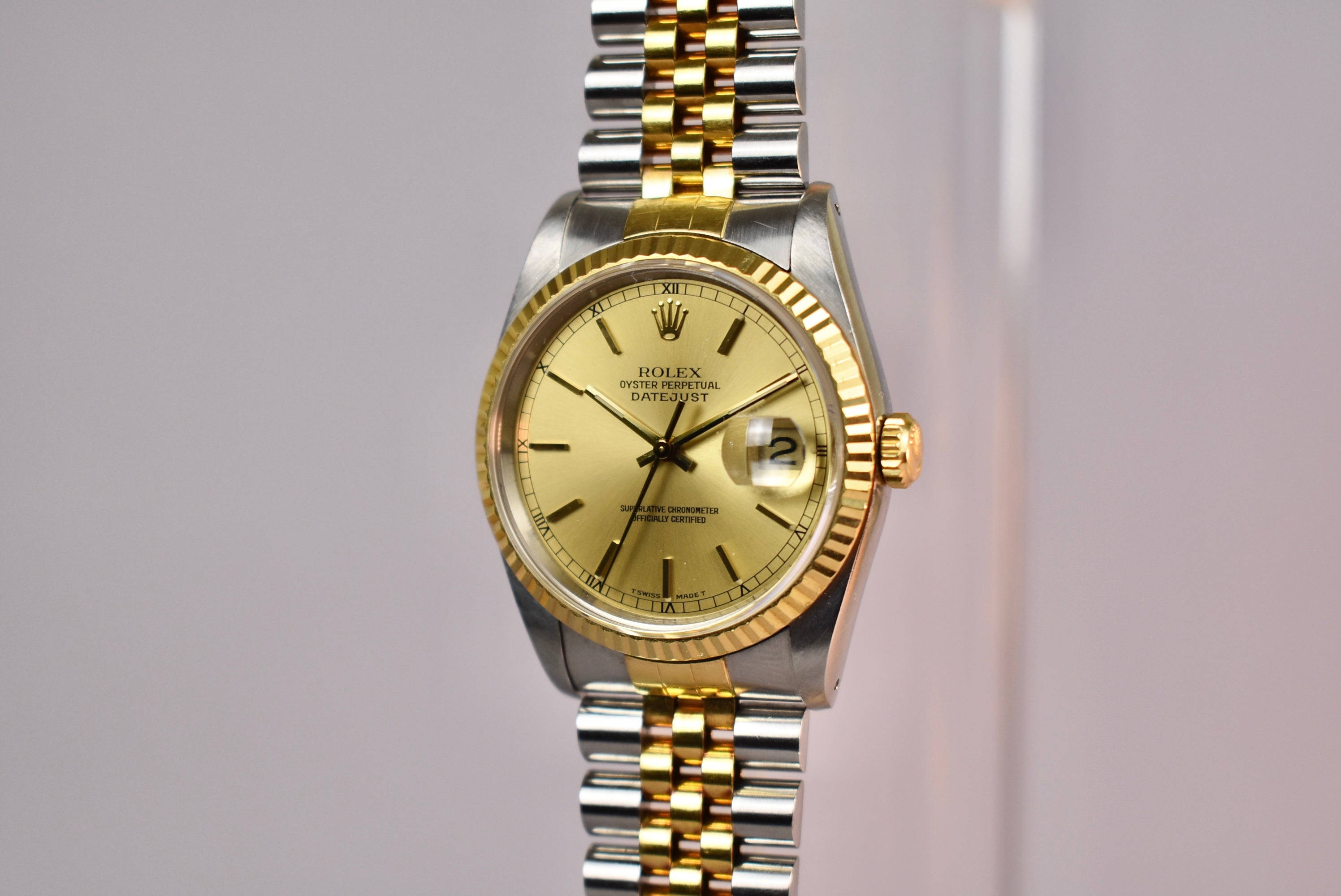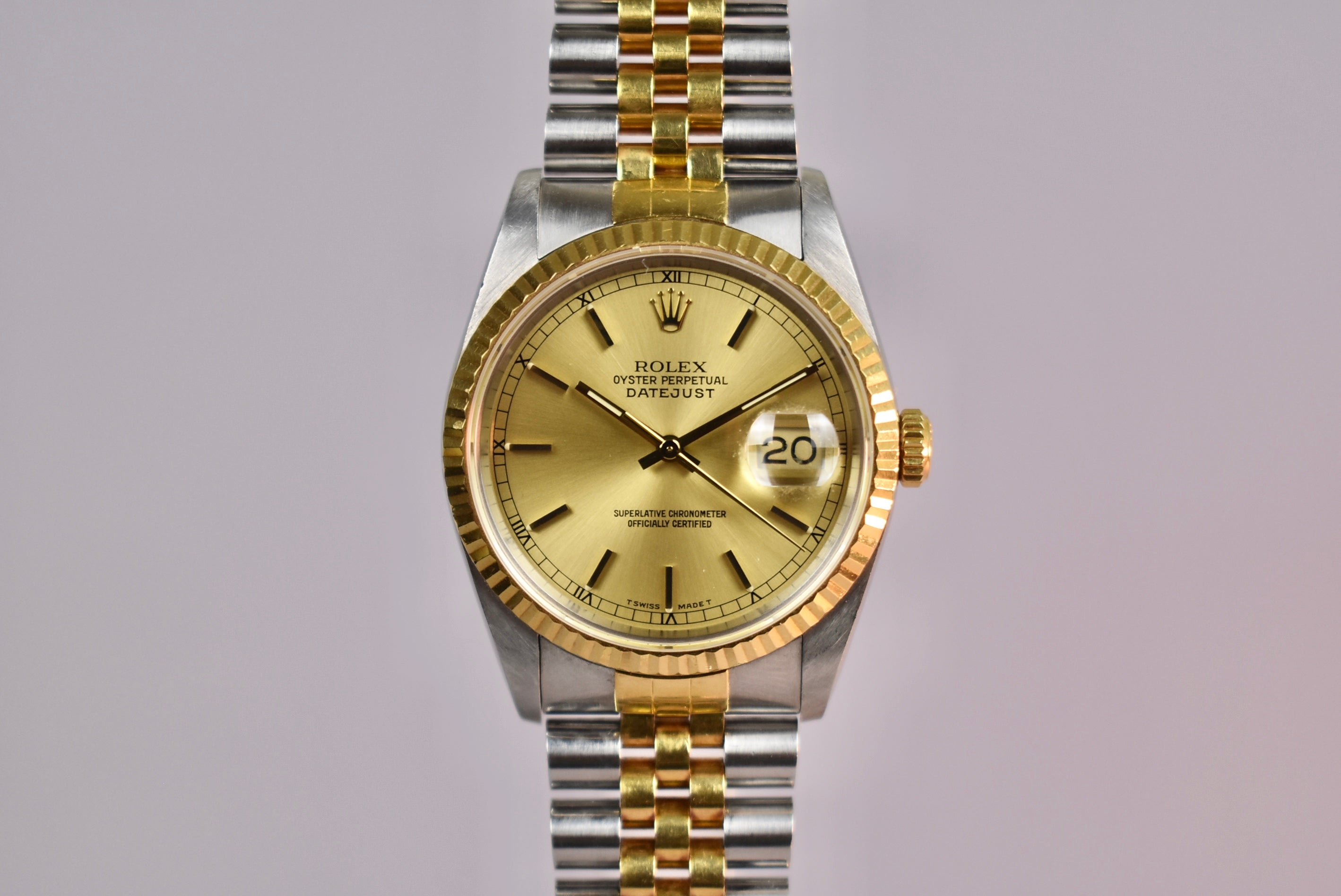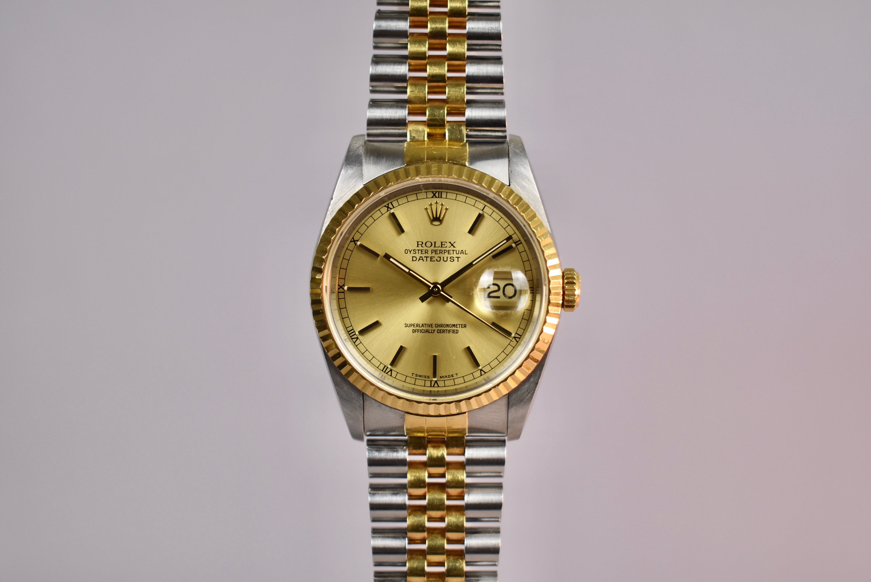 Hands down, the Rolex Datejust has becoming the most commonly know watch to everyone. The jubilee bracelet and fluted bezel work in harmony with a clean dial and simple date feature. The 16233 is also many people's sweet spot when it comes to Rolex. It is the most affordable Rolex model that can be had today with a sapphire crystal, quickset date and a two tone case and bracelet. This specific example has a champagne rail dial with Roman numerals. It also comes with its original box and papers.