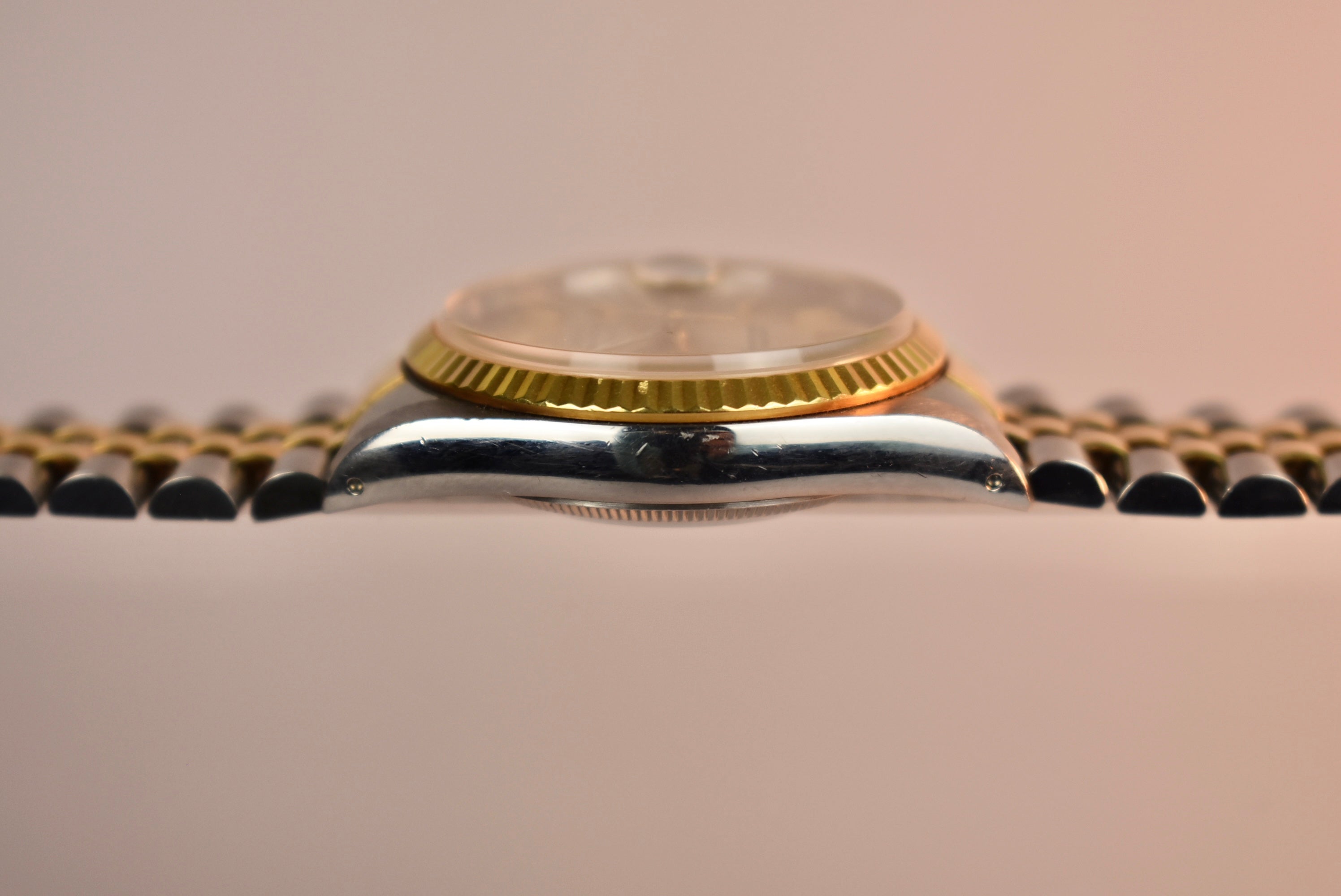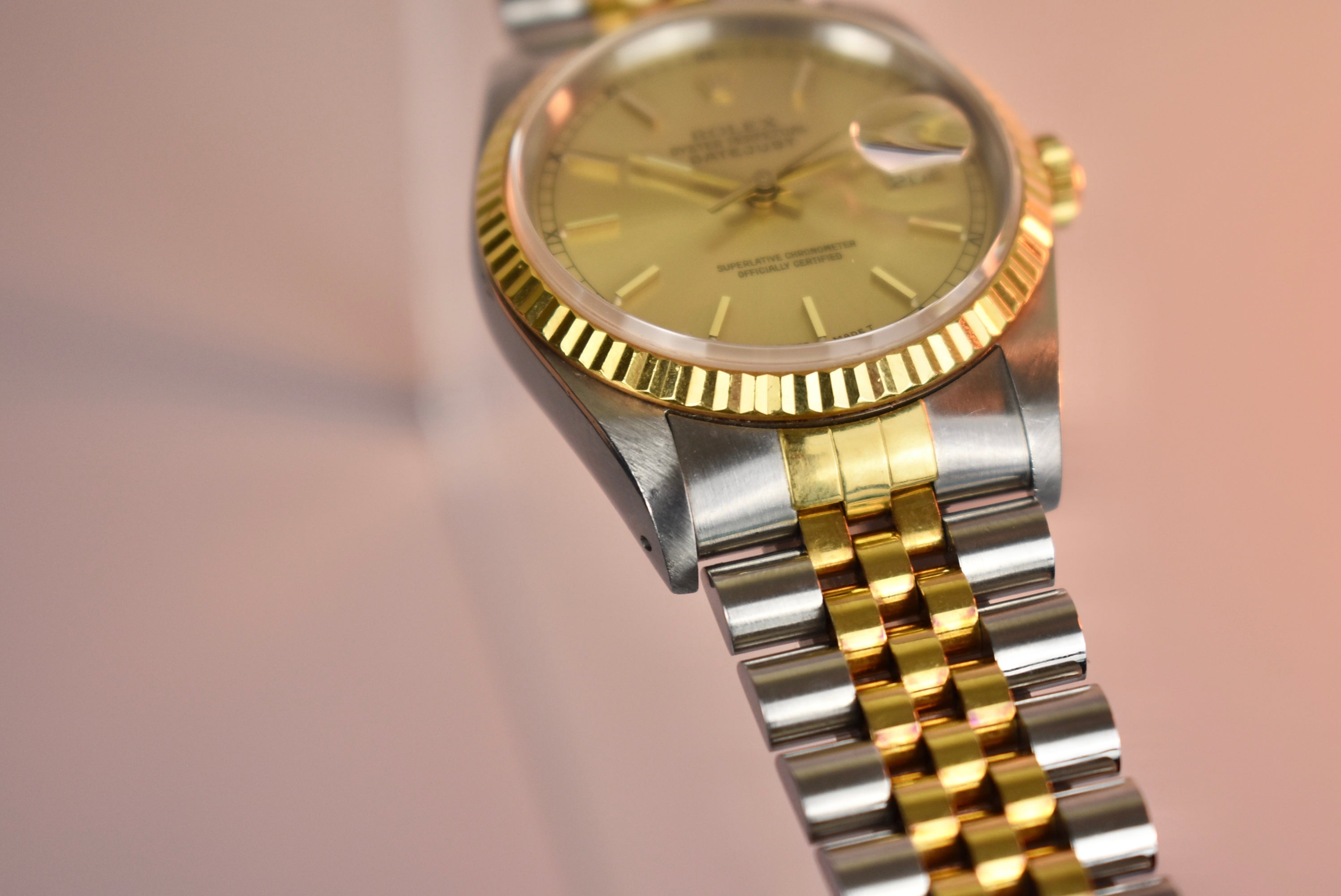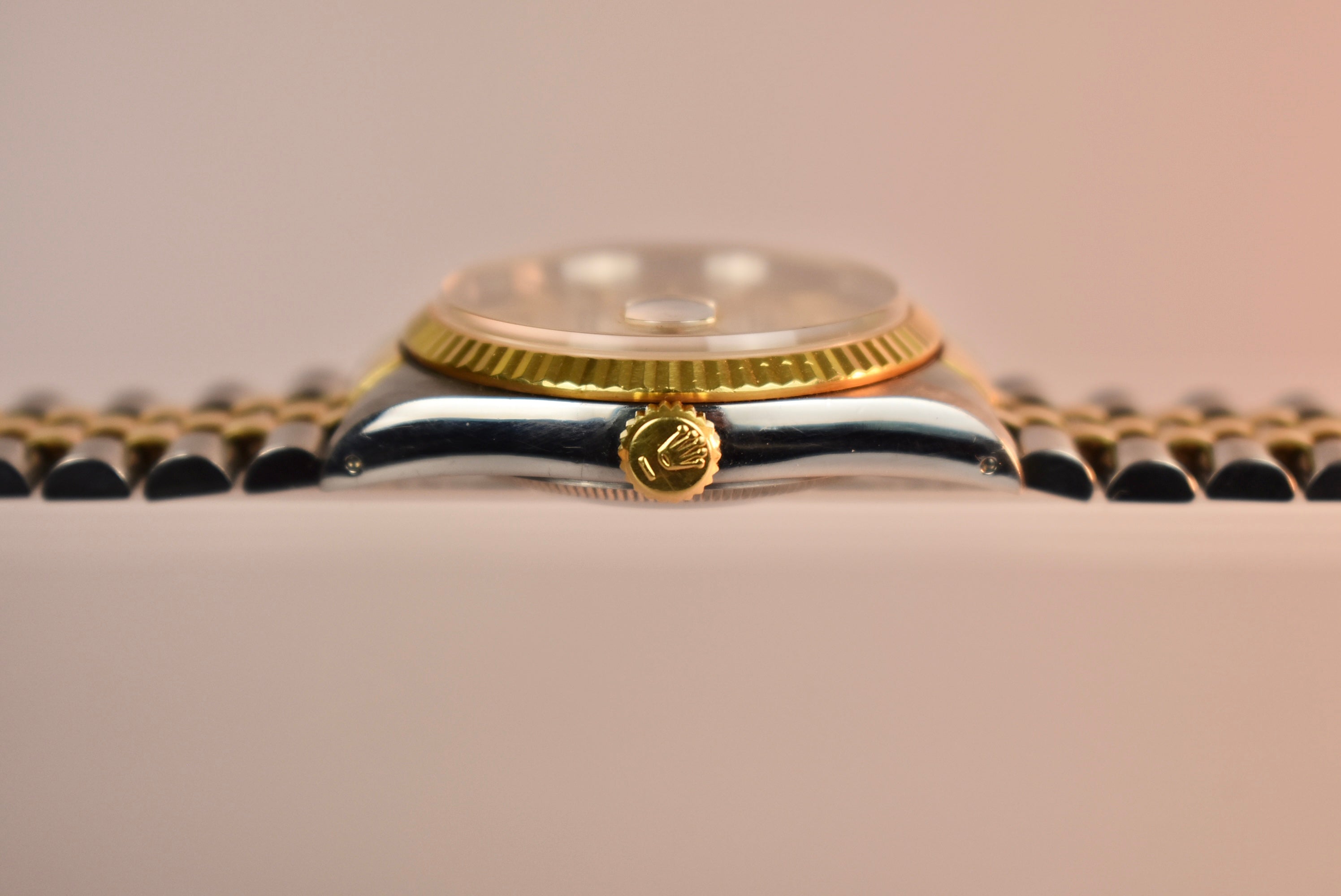 Hands down, the Rolex Datejust has becoming the most commonly know watch to everyone. The jubilee bracelet and fluted bezel work in harmony with a clean dial and simple date feature. The 16233 is also many people's sweet spot when it comes to Rolex. It is the most affordable Rolex model that can be had today with a sapphire crystal, quickset date and a two tone case and bracelet. This specific example has a champagne rail dial with Roman numerals. It also comes with its original box and papers.