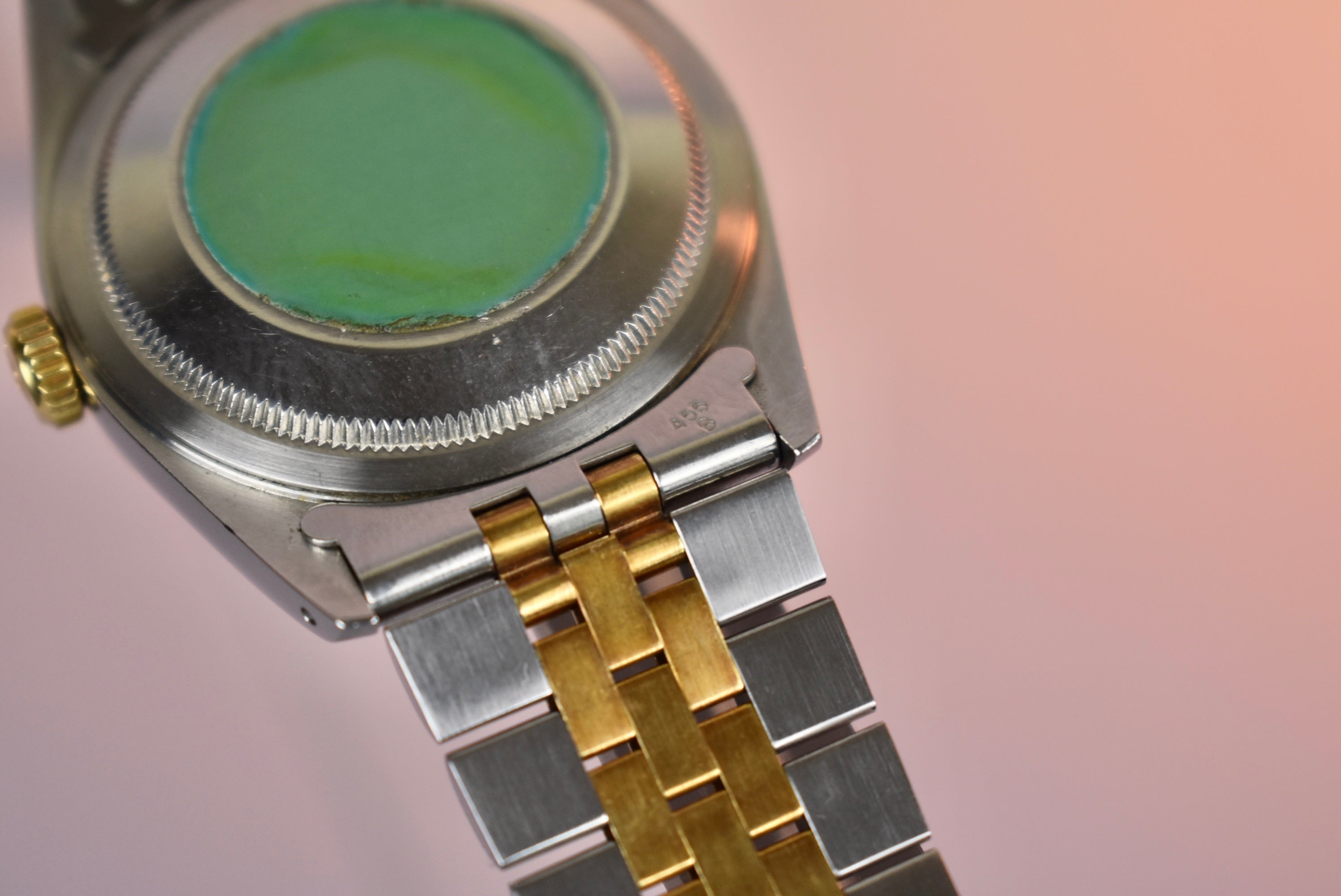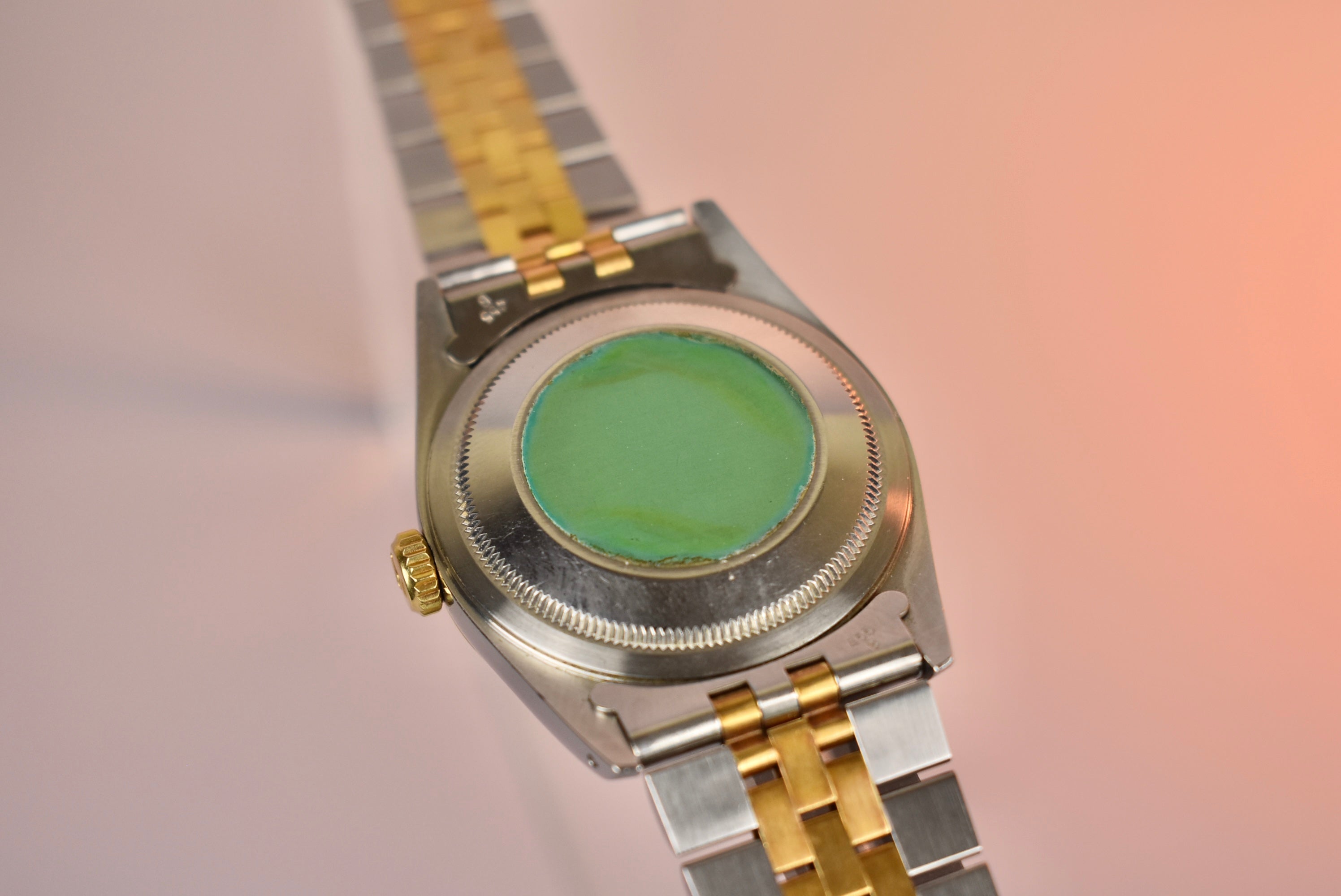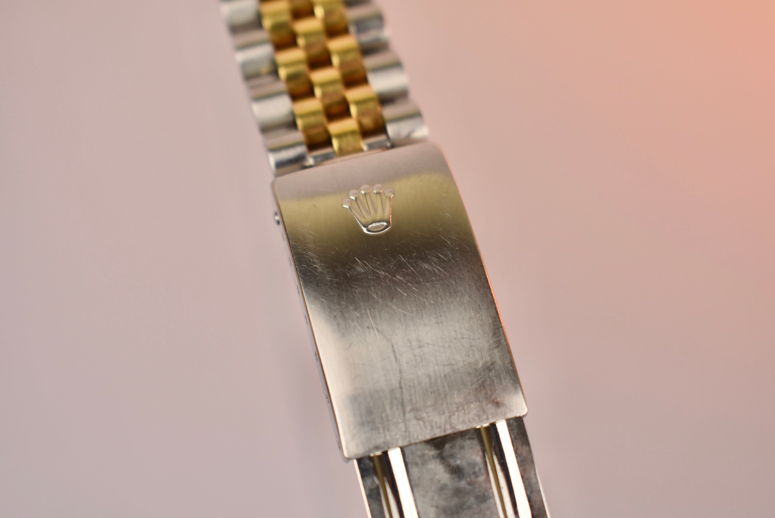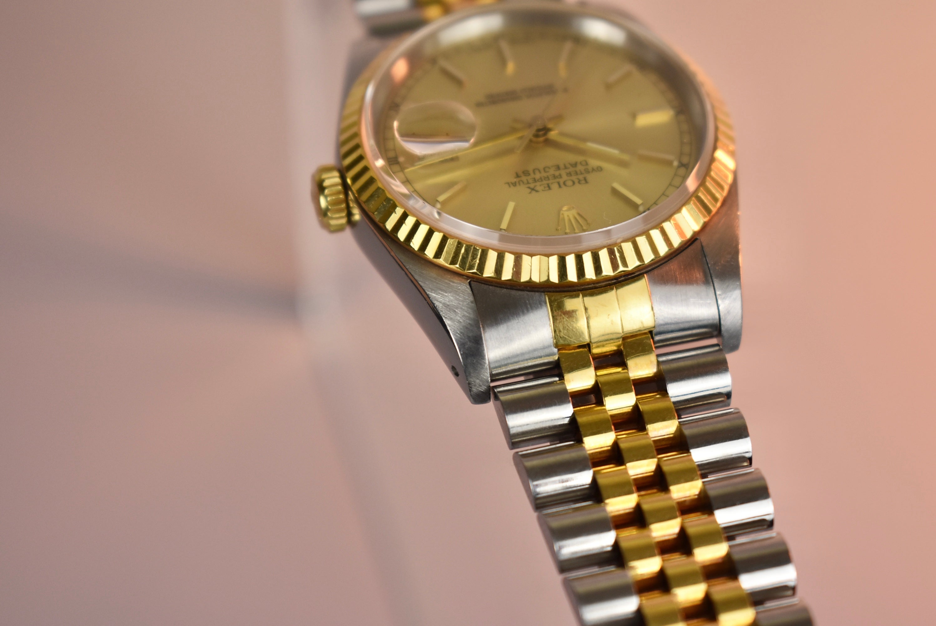 Hands down, the Rolex Datejust has becoming the most commonly know watch to everyone. The jubilee bracelet and fluted bezel work in harmony with a clean dial and simple date feature. The 16233 is also many people's sweet spot when it comes to Rolex. It is the most affordable Rolex model that can be had today with a sapphire crystal, quickset date and a two tone case and bracelet. This specific example has a champagne rail dial with Roman numerals. It also comes with its original box and papers.