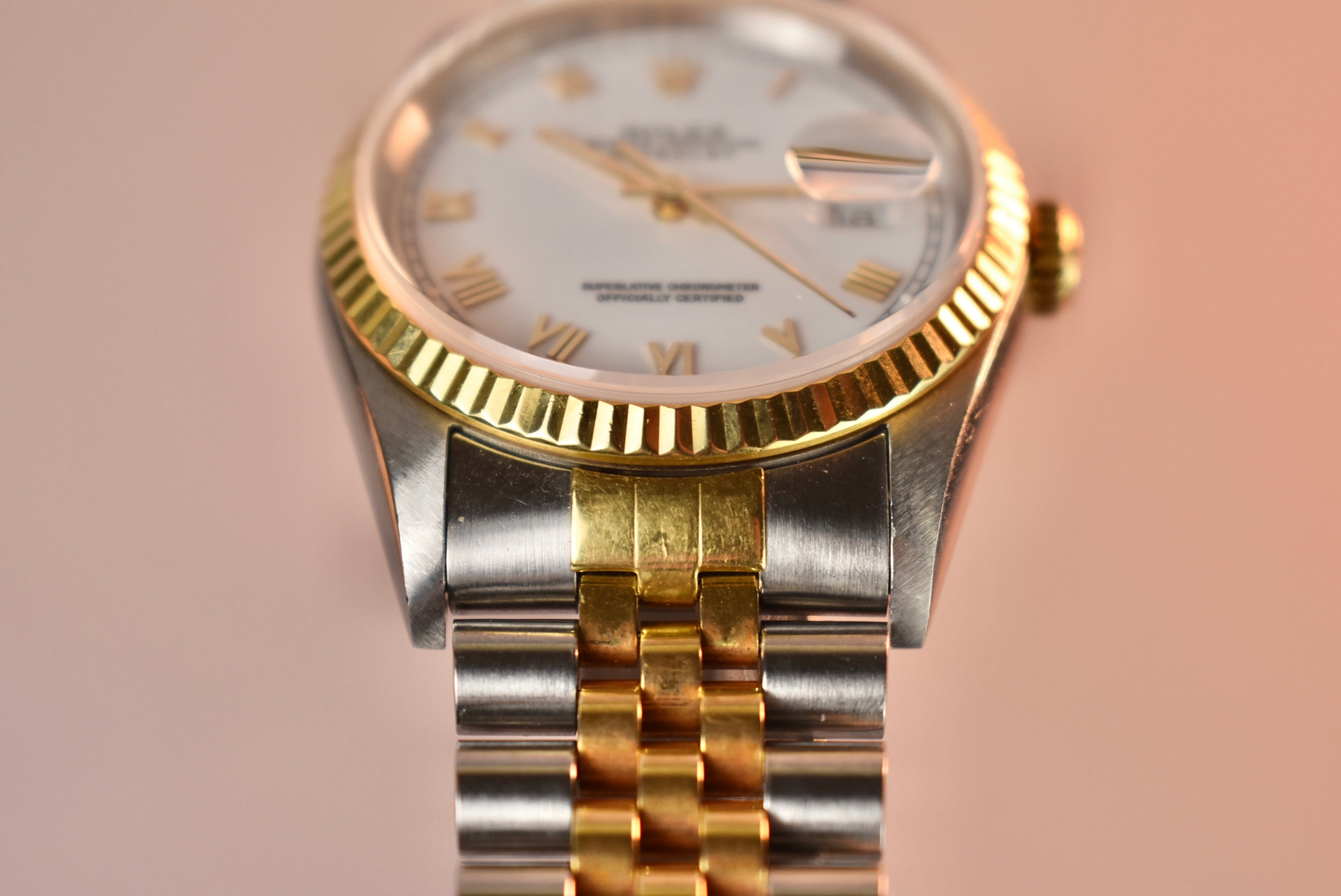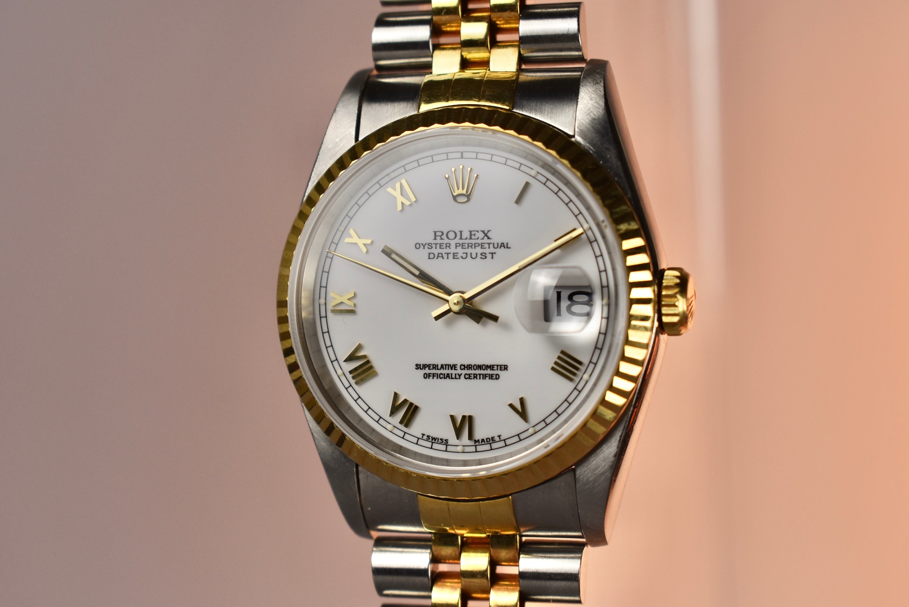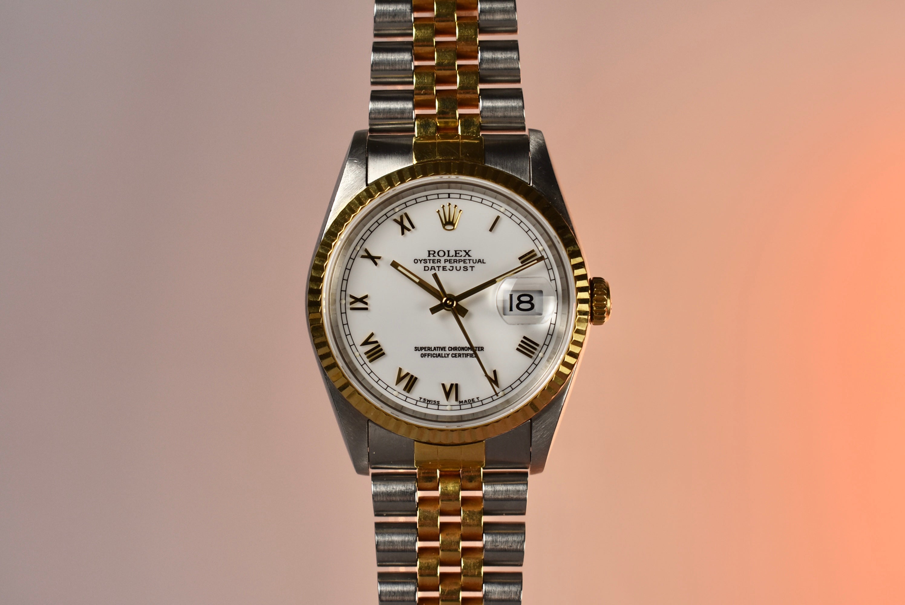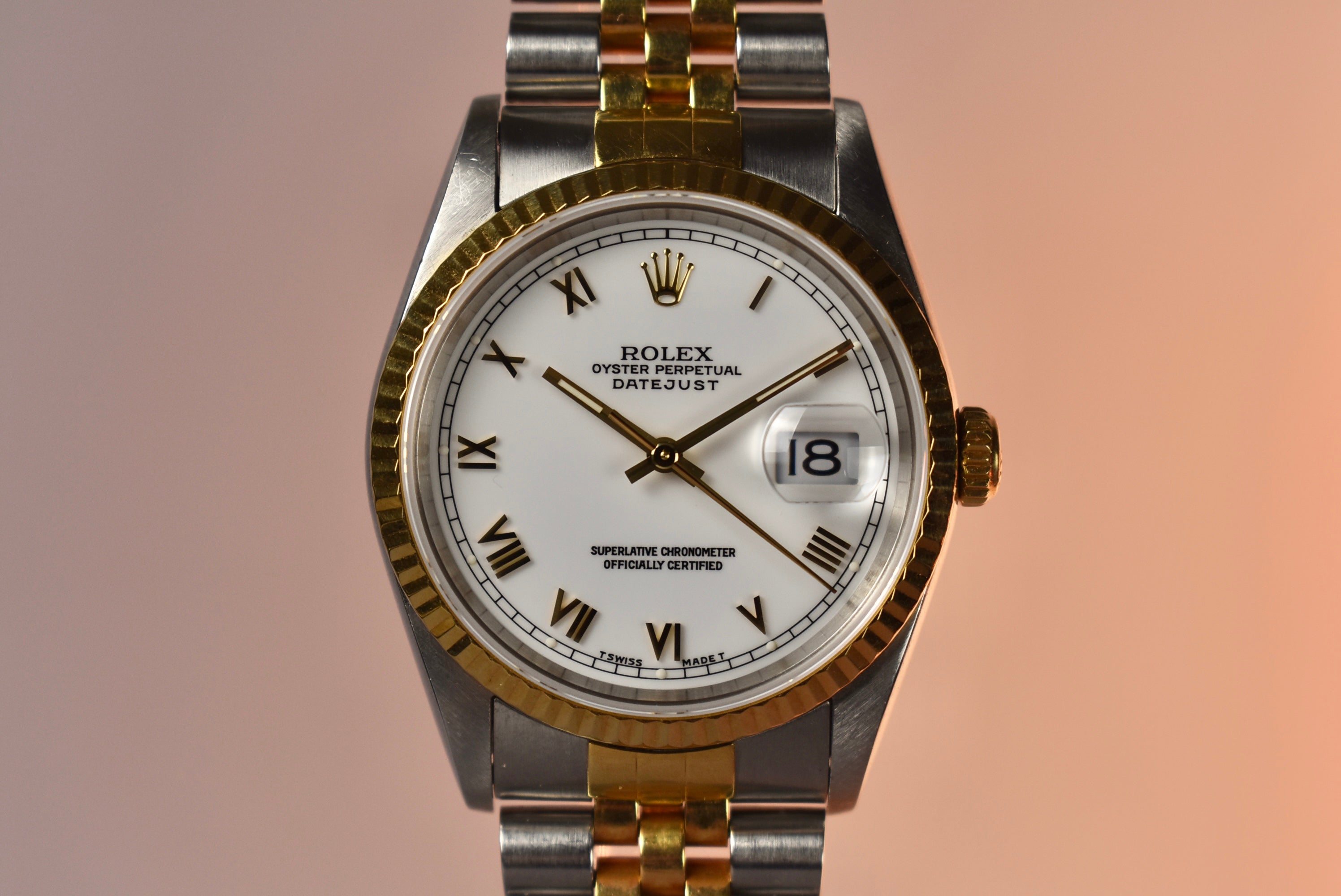 Hands down, the Rolex Datejust has become the most commonly known watch to everyone. The jubilee bracelet and fluted bezel work in harmony with a clean dial and simple date feature. The 16233 is also many people's sweet spot when it comes to Rolex. It is the most affordable Rolex model that can be had today with a sapphire crystal, quickset date, and a two-tone case and bracelet. This 16233 features a clean gloss white dial with applied roman numeral hour markers