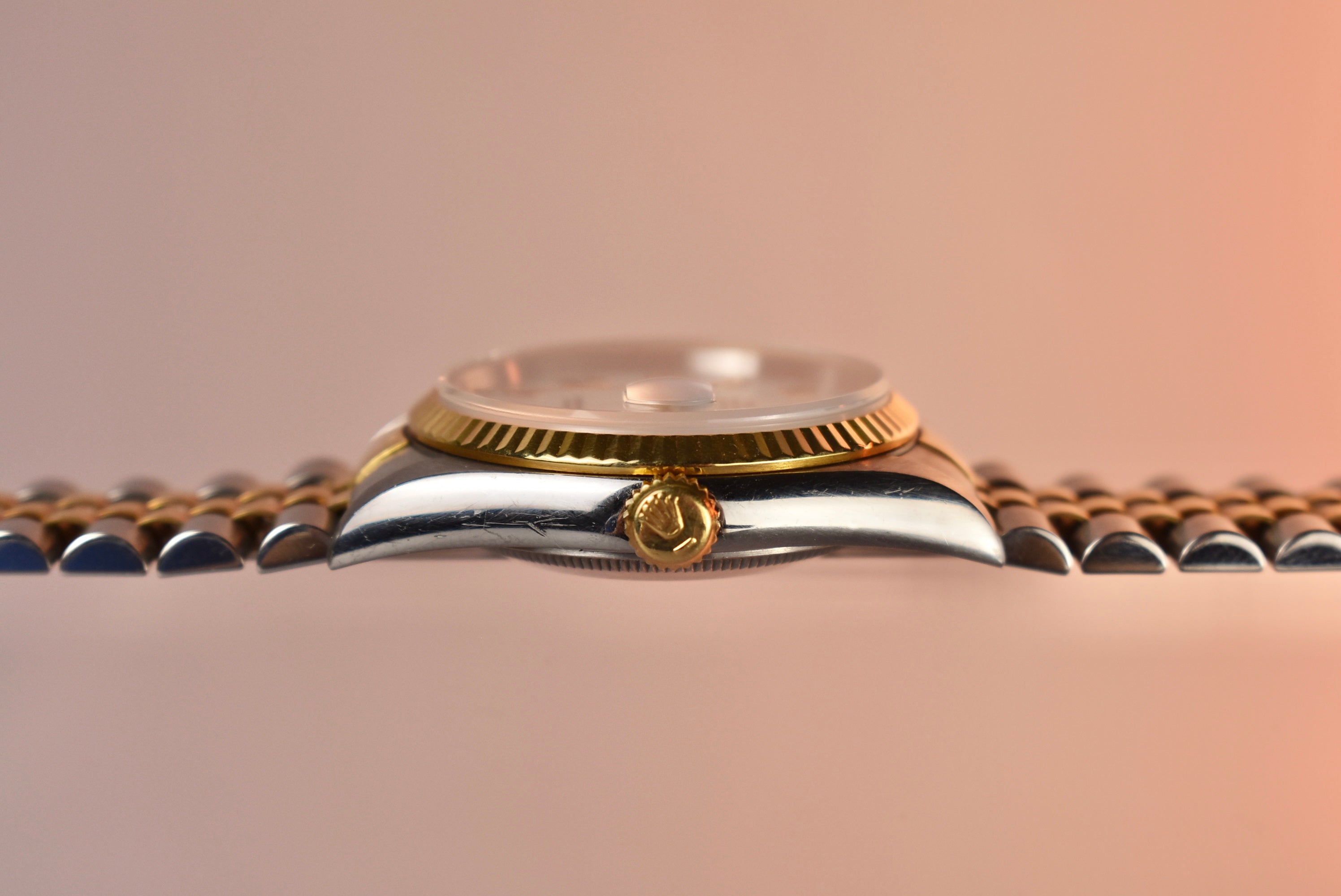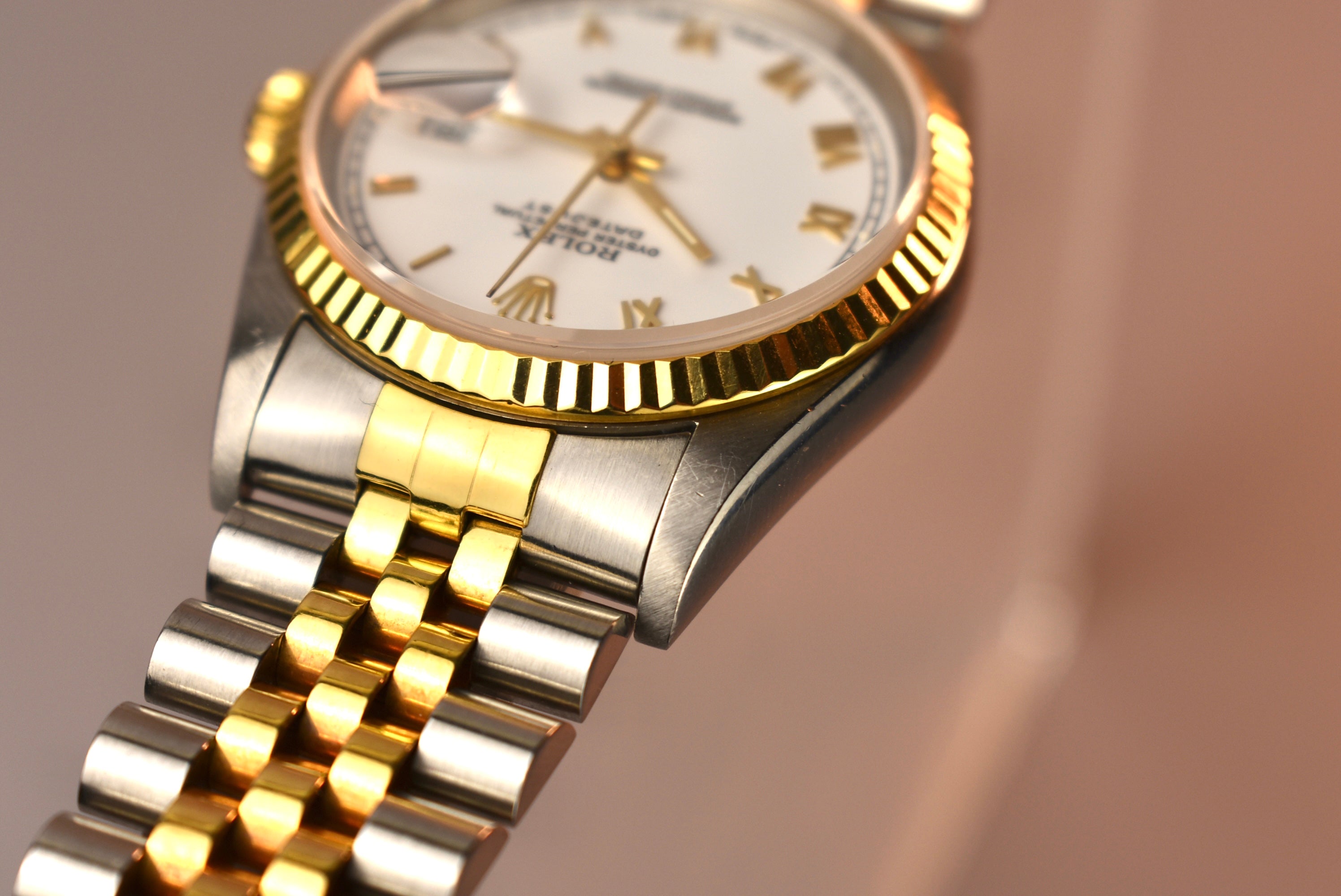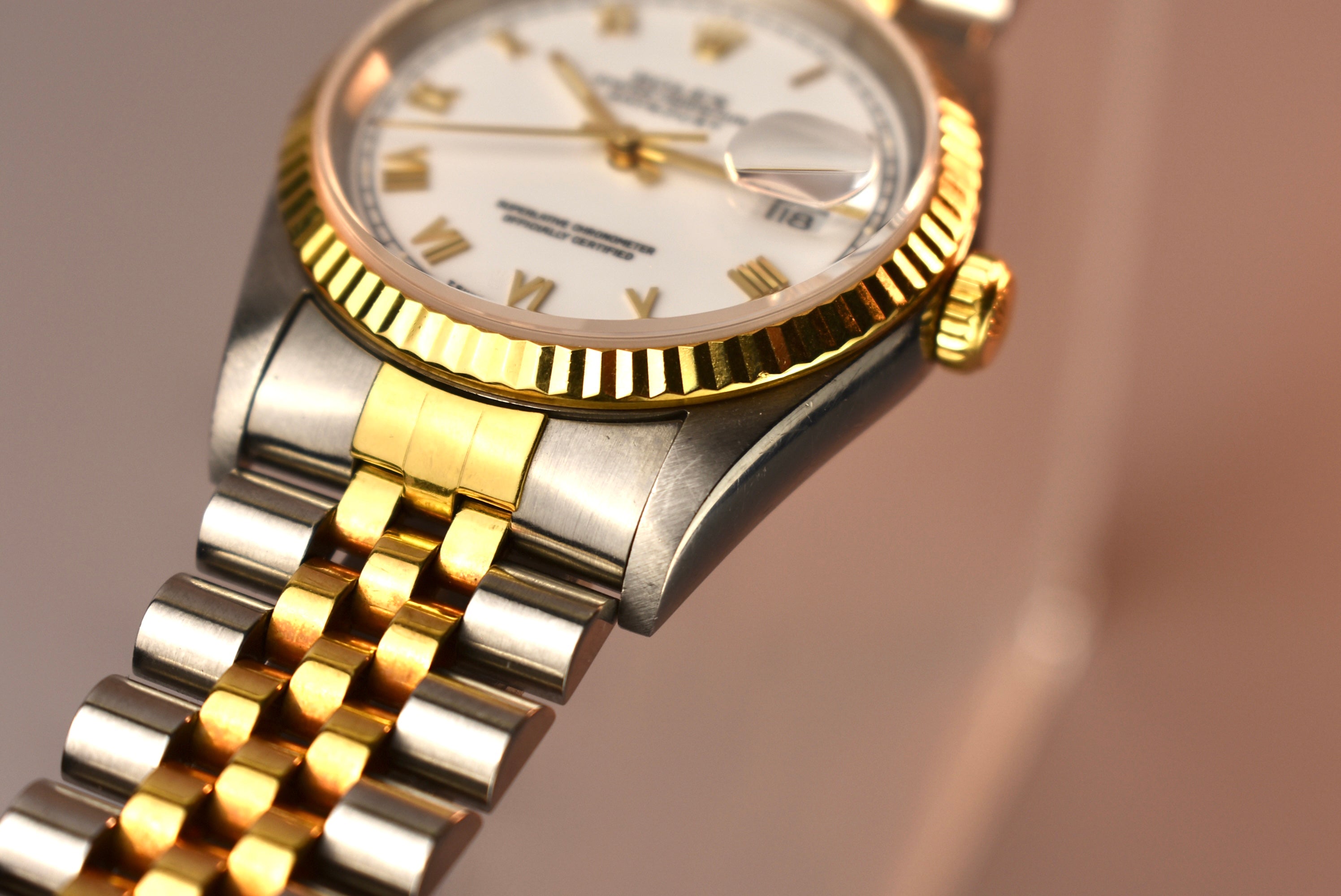 Hands down, the Rolex Datejust has become the most commonly known watch to everyone. The jubilee bracelet and fluted bezel work in harmony with a clean dial and simple date feature. The 16233 is also many people's sweet spot when it comes to Rolex. It is the most affordable Rolex model that can be had today with a sapphire crystal, quickset date, and a two-tone case and bracelet. This 16233 features a clean gloss white dial with applied roman numeral hour markers
