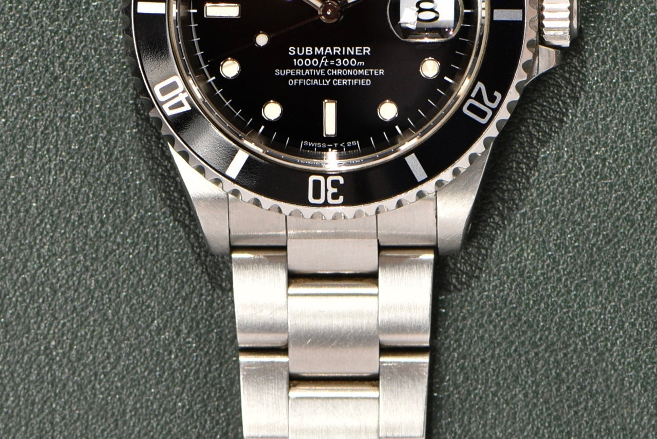 This '95 Submariner comes as watch only. The case has seen a polish in its life but still has thick and even lugs with chamfers. The watch also has its original caseback sticker still intact. The dial, hands and bezel are in good condition with original tritium lume that has gained even patina.