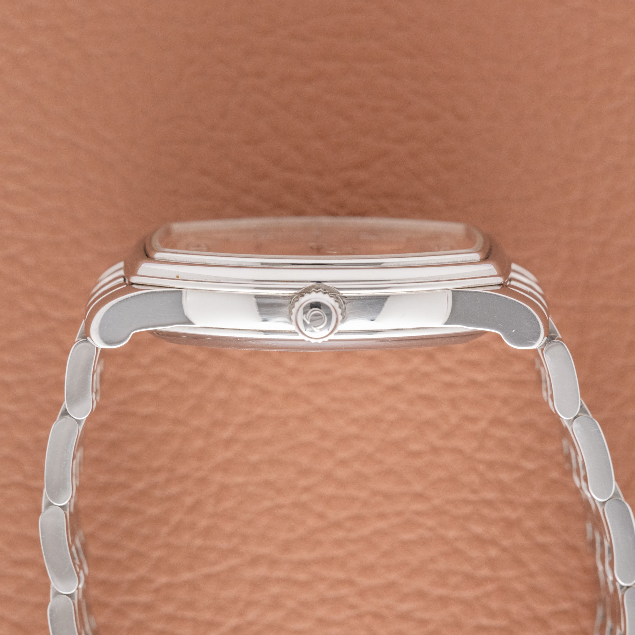 Introduced in 1998 and produced for just one year, the Ref. 4553.61 was part of Omega’s De Ville collection, a line celebrated for elegance and experimentation. The watch combined a compact yet striking case design with a dual-finish salmon guilloché dial, applied numerals, and a jump hour display that advanced crisply each hour.