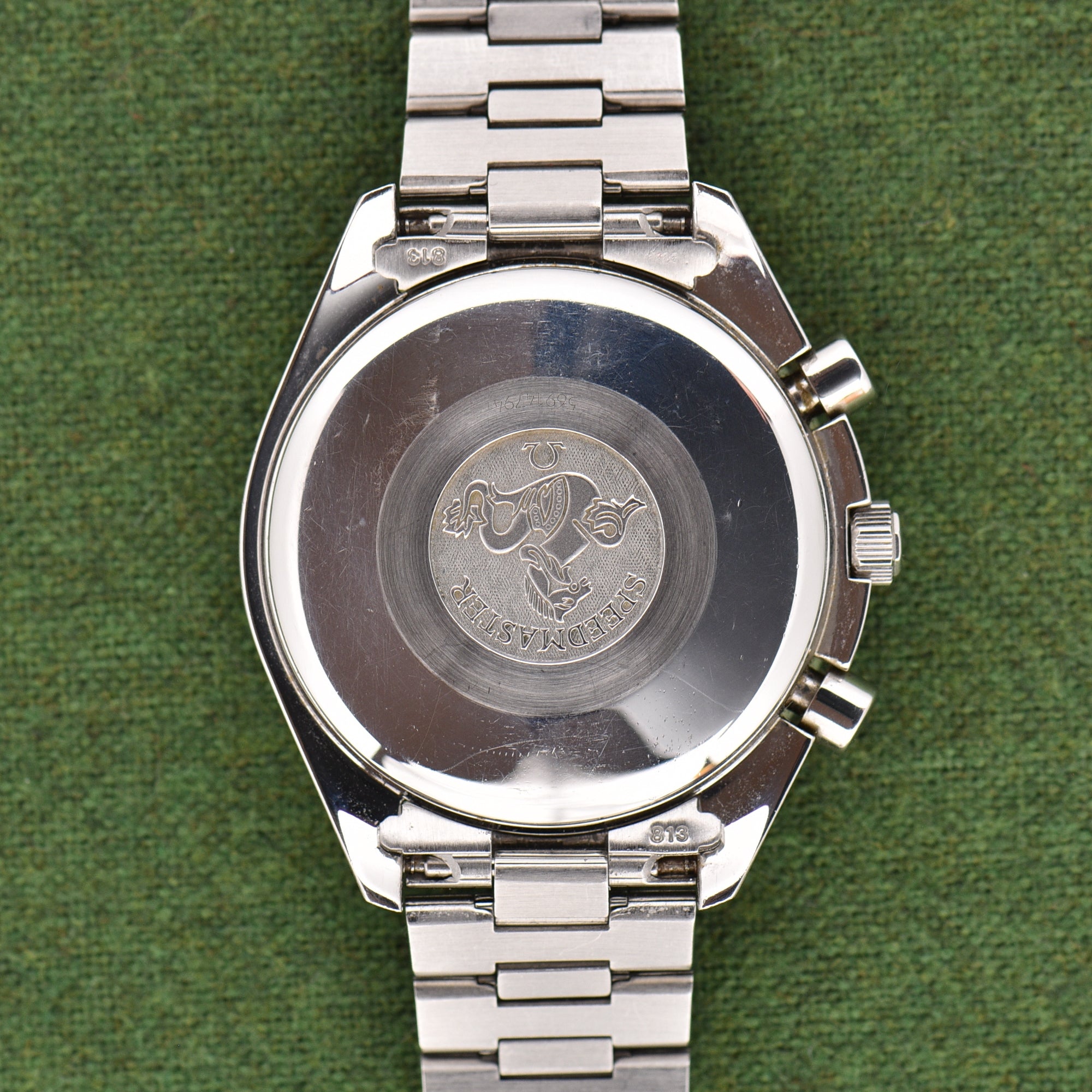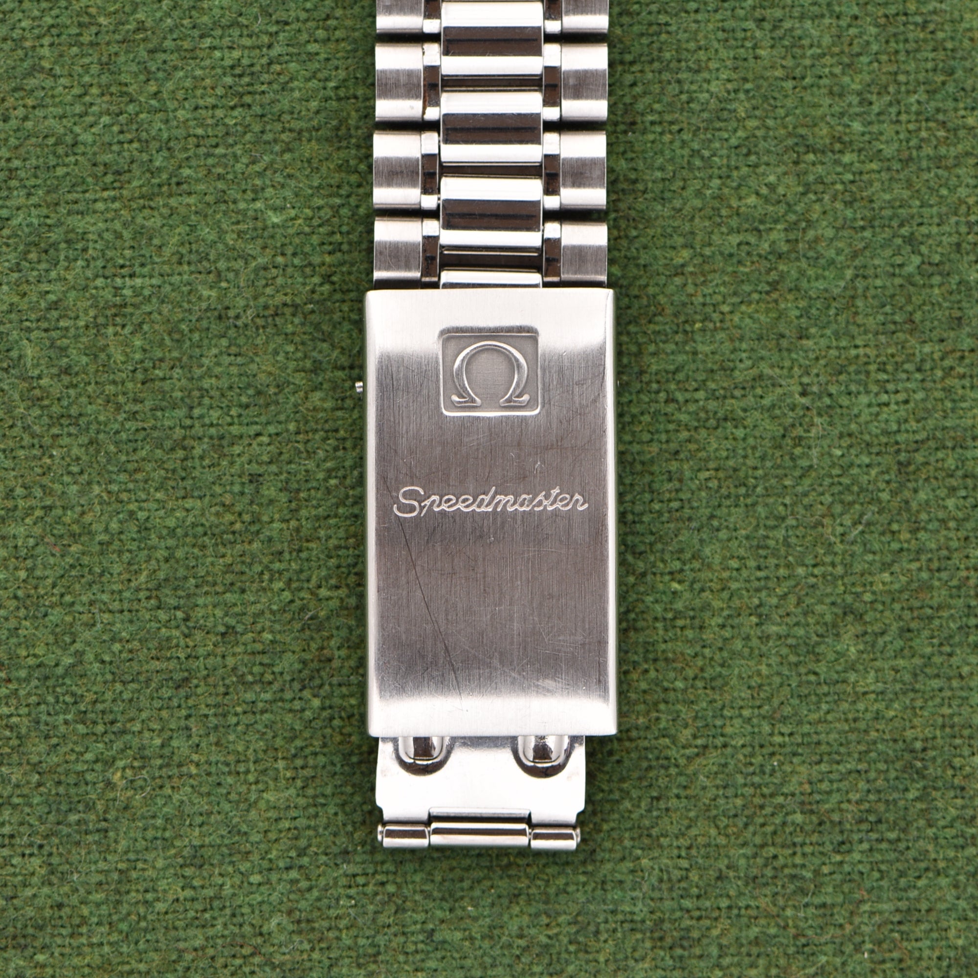 The case and bracelet are very clean with normal wear. The blue dial has faded, showing the bare dial with its gold tone. This is a truly special, tropical Speedmaster.