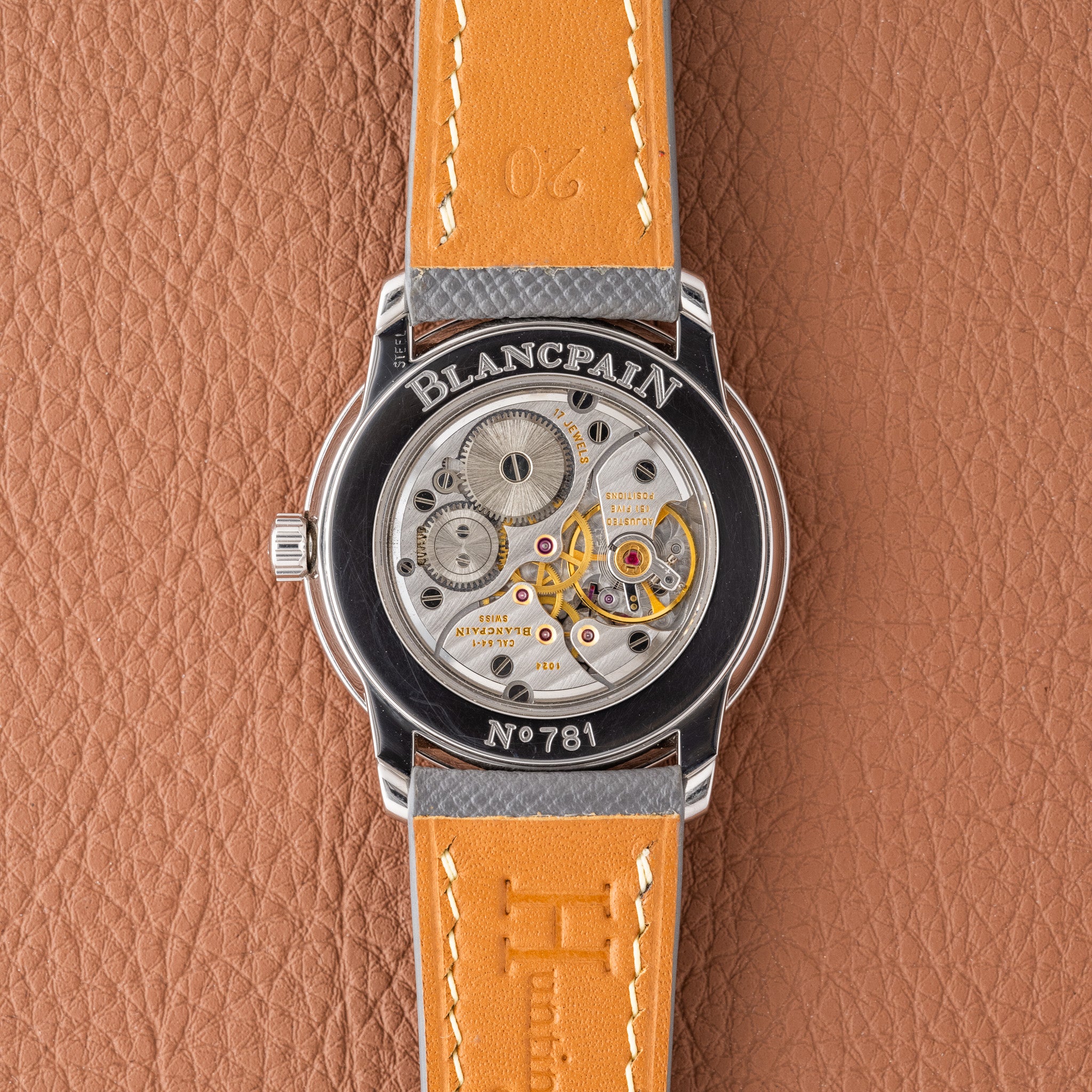 The white dial is one of the defining features of the reference. The applied Breguet-style numerals subtly curve around the circumference of the dial, a design detail unique to this model that adds depth and character without disrupting its symmetry. Paired with the small seconds display, the layout feels classical but not derivative, placing the ref. 7002 firmly in Blancpain’s own design language rather than echoing other maisons.