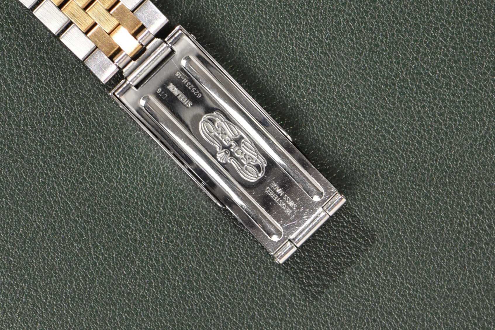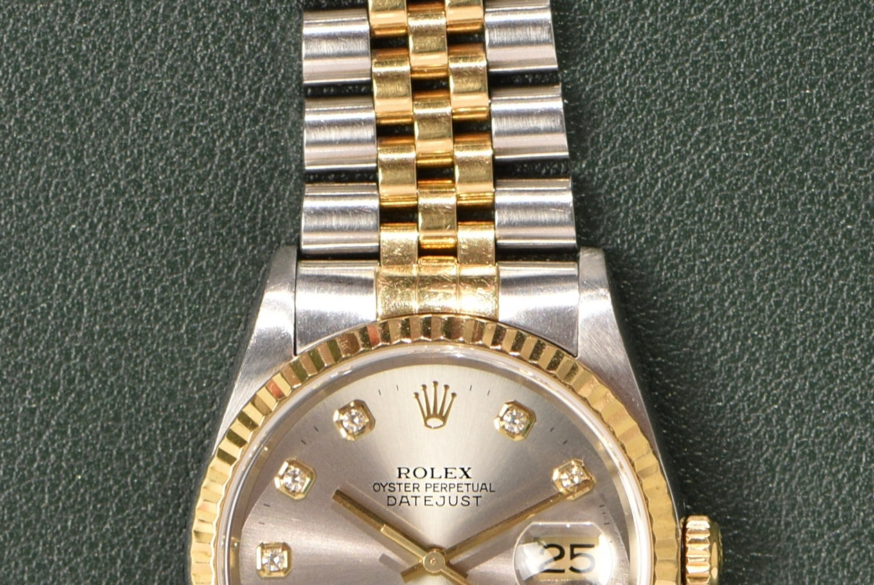 Hands down, the Rolex Datejust has become the most commonly known watch to everyone. The jubilee bracelet and fluted bezel work in harmony with a clean dial and simple date feature. The 16233 is also many people's sweet spot when it comes to Rolex. It is the most affordable Rolex model that can be had today with a sapphire crystal, quickset date, and a two-tone case and bracelet. The tapestry dial on this one gives it an extra bit of pop and class because of the dark black color. The tapestry dial is one of the coolest ones from the era. The way the pattern plays with the light is truly special. This one has a very uncommon dial configuration.
