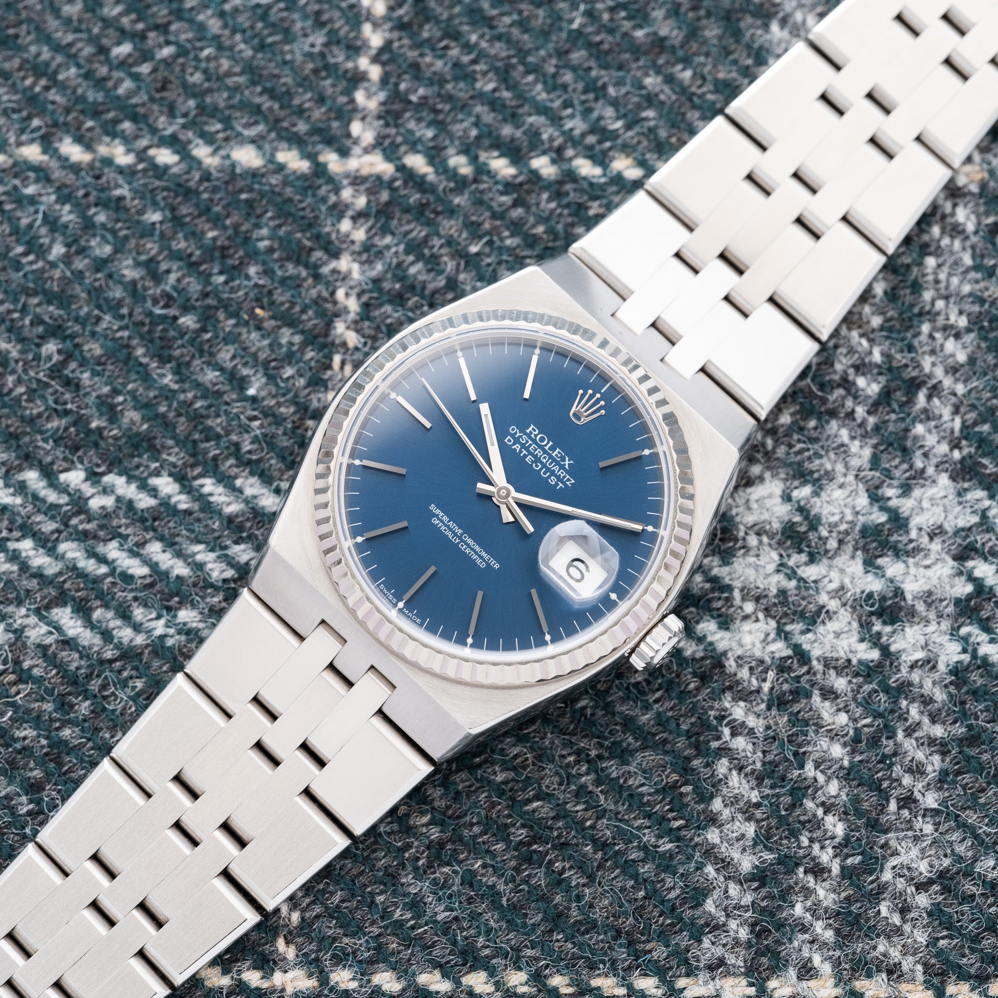 In 1970, Rolex introduced their first quartz watch, the reference 5100, which used the Beta 21 quartz movement, a Swiss quartz movement used by around 20 Swiss watch manufacturers. The reference 5100 was unique in its 39mm thick, angular case, featuring a Rolex fluted bezel and a three-link bracelet. It was the first Rolex watch to feature a sapphire crystal and was first produced in yellow gold but some white gold models were also released.