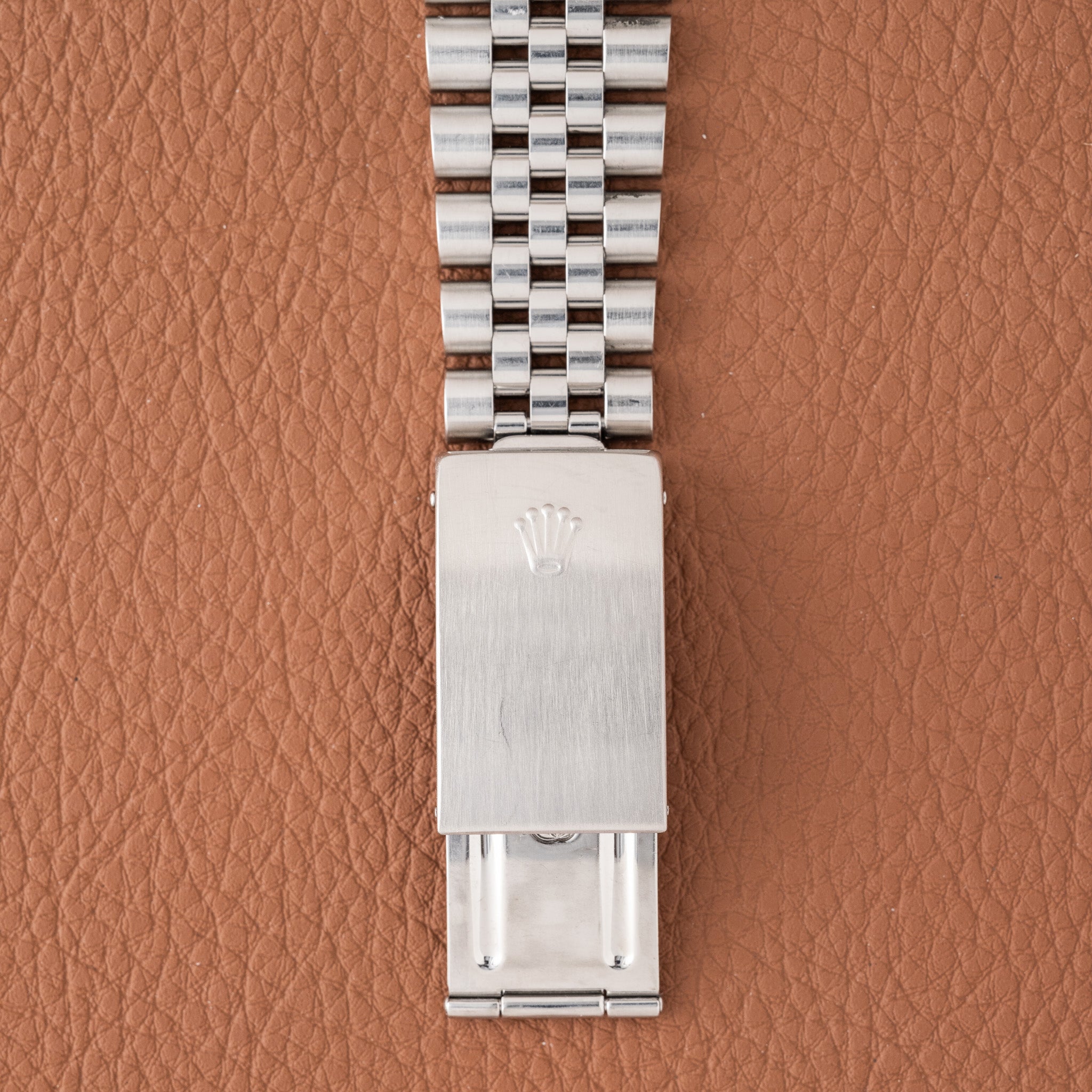 The blue stick dial on this example is an especially appealing configuration, known for its clarity and sharp contrast under different lighting conditions. The dial is all original and in perfect condition. This watch retains its original sapphire crystal with the Rolex laser-etched coronet at six o’clock, a detail introduced around this period. The Jubilee bracelet and white gold fluted bezel complete the design that many consider the definitive Datejust look.