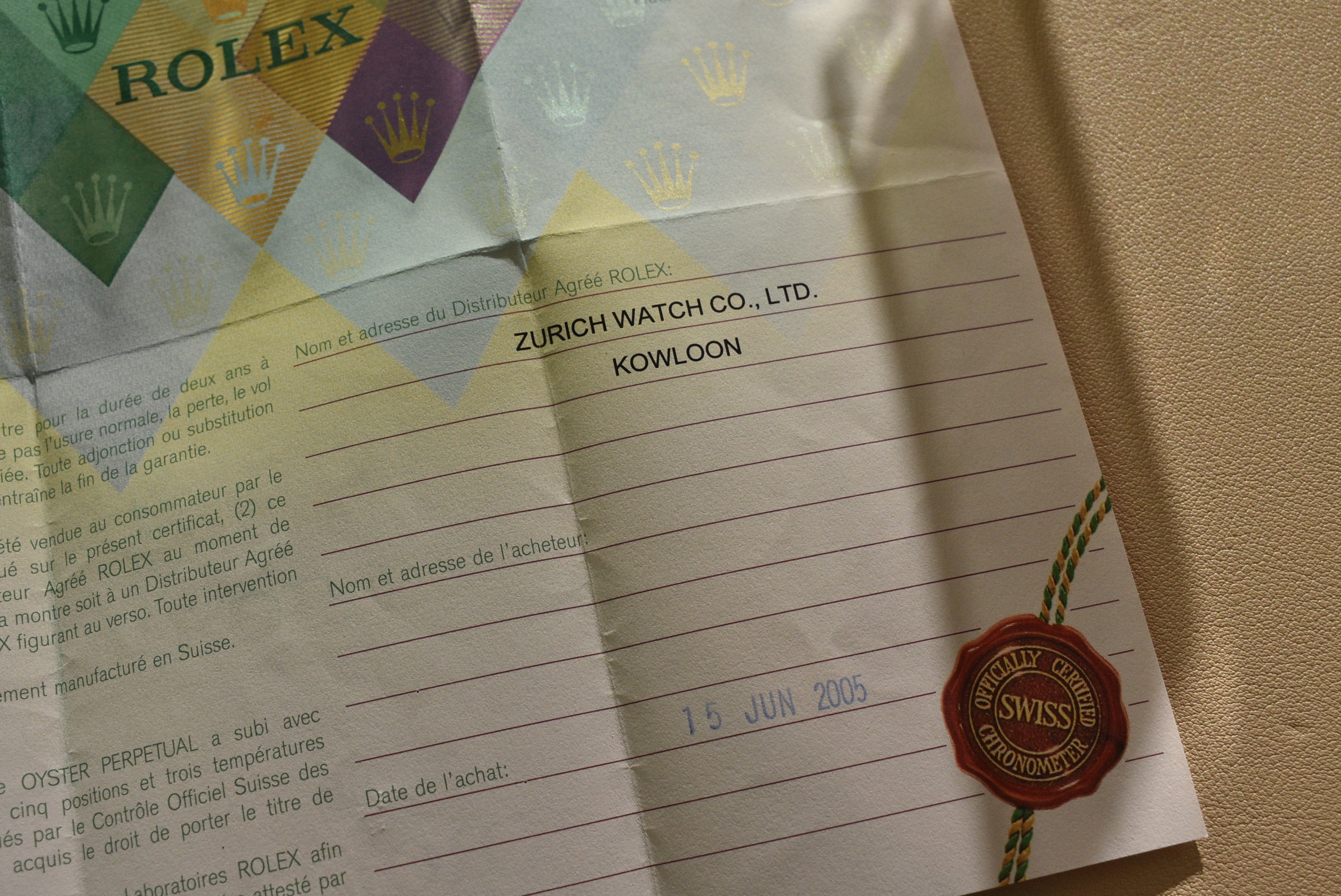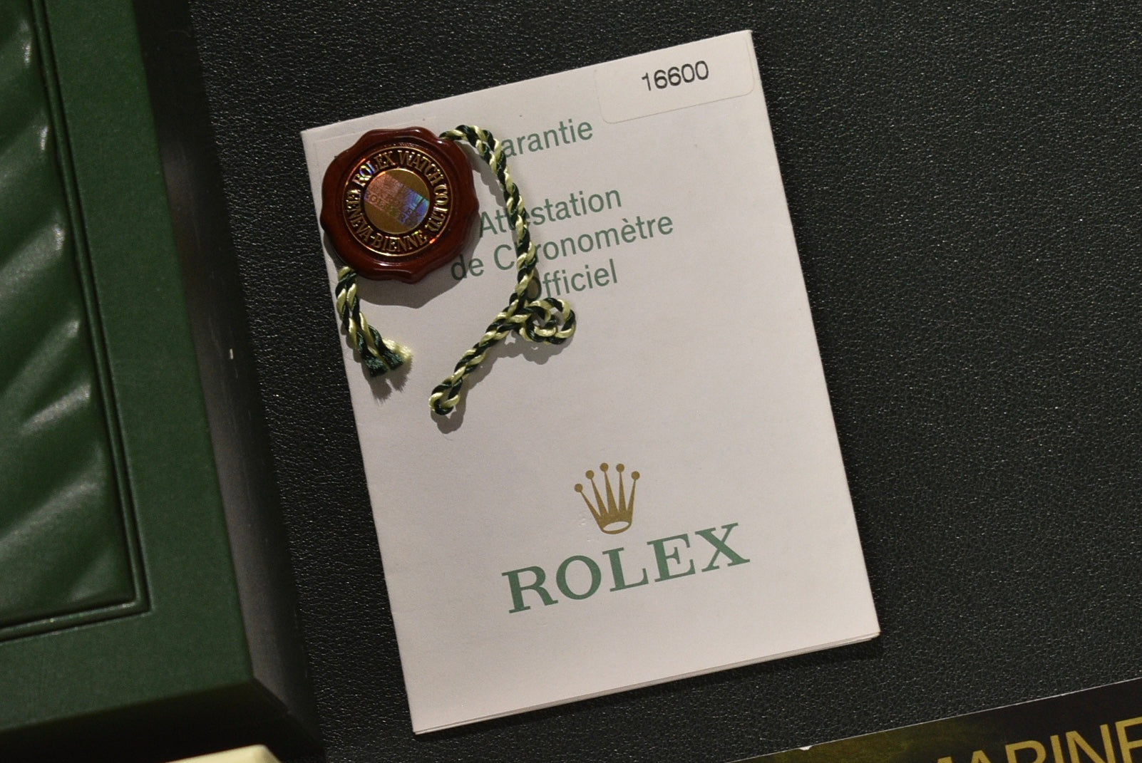 The case is unpolished with thick lugs. The bezel has some faint marks that are hard to see. The bracelet is in nice condition with solid end links and a diver extension. The dial and hands are in perfect condition. The watch has a small mark on the bottom right lug and left side of the case; both are the same size. The watch comes with its original box, papers, and hangtag. The warranty papers are also open papers from 2005.