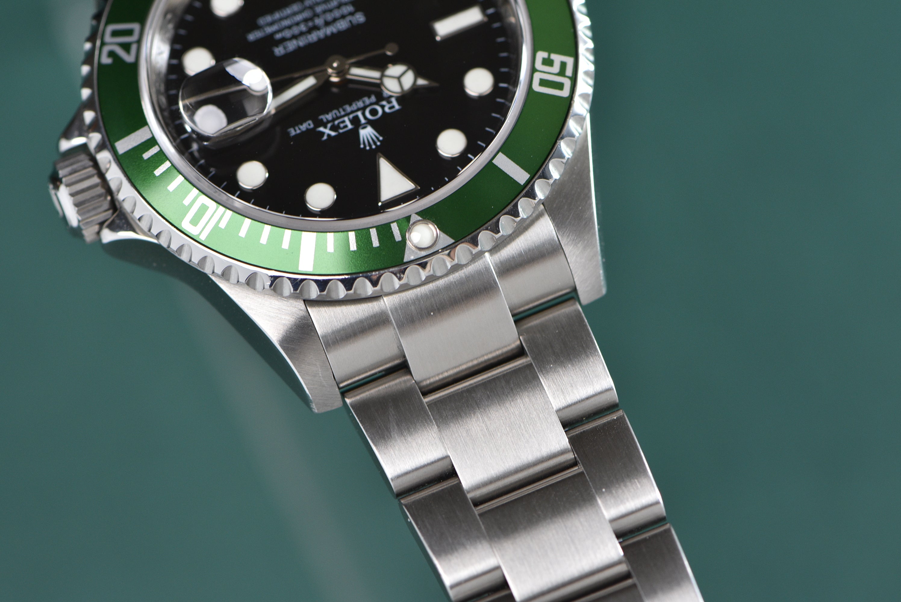 This 16610LV dates to 2008 with an engraved rehaut and maxi dial. The watch has been previously polished (before it reached us). The bracelet is nice and tight and the watch is in good condition. The original Kermit bezel is in great condition with no dents. The watch also comes with an open Warranty Card.