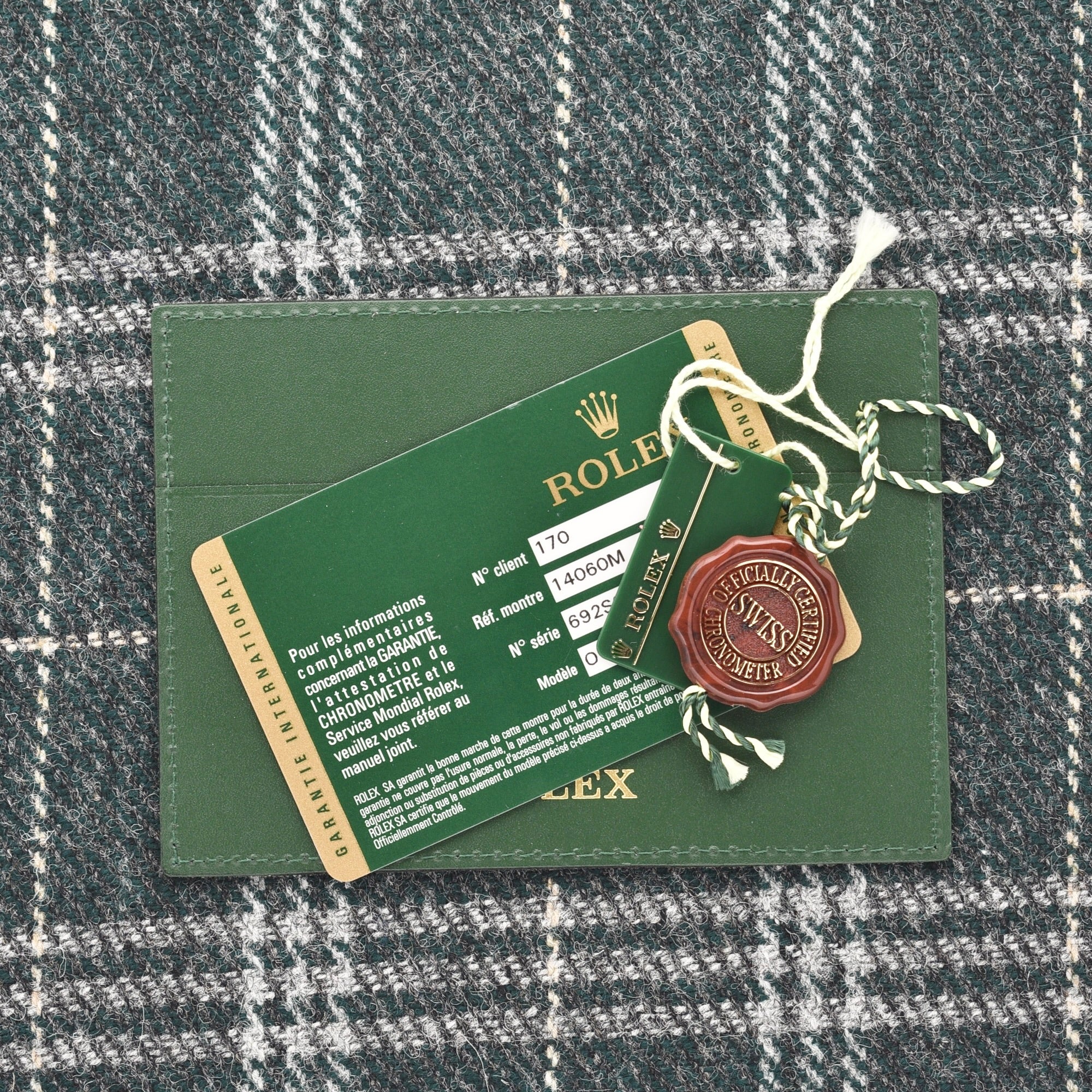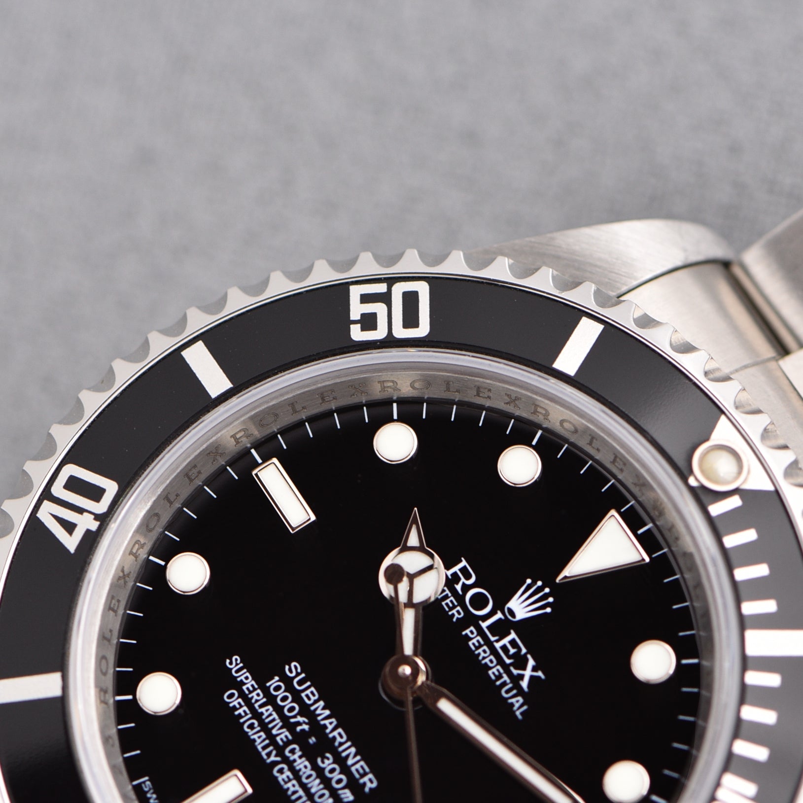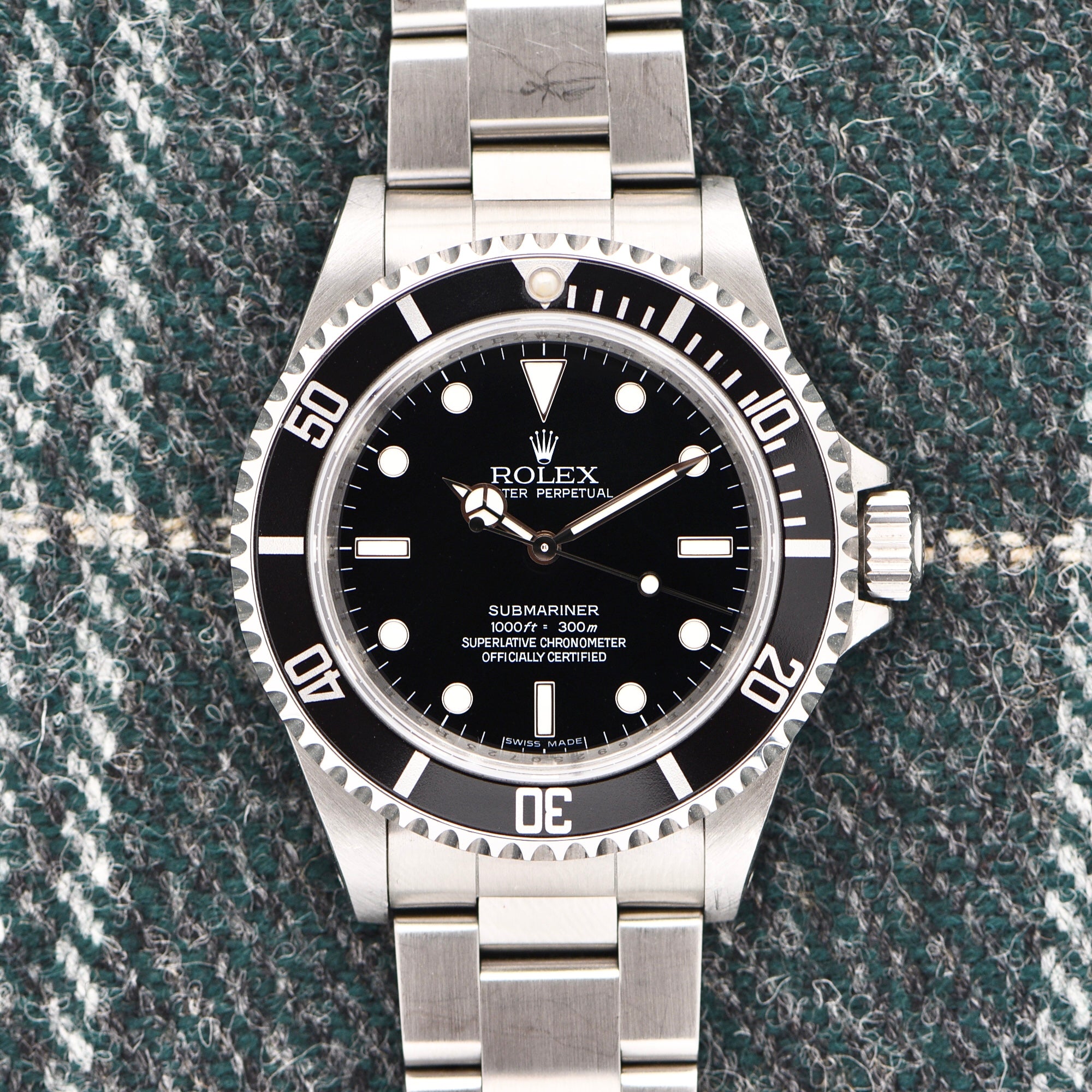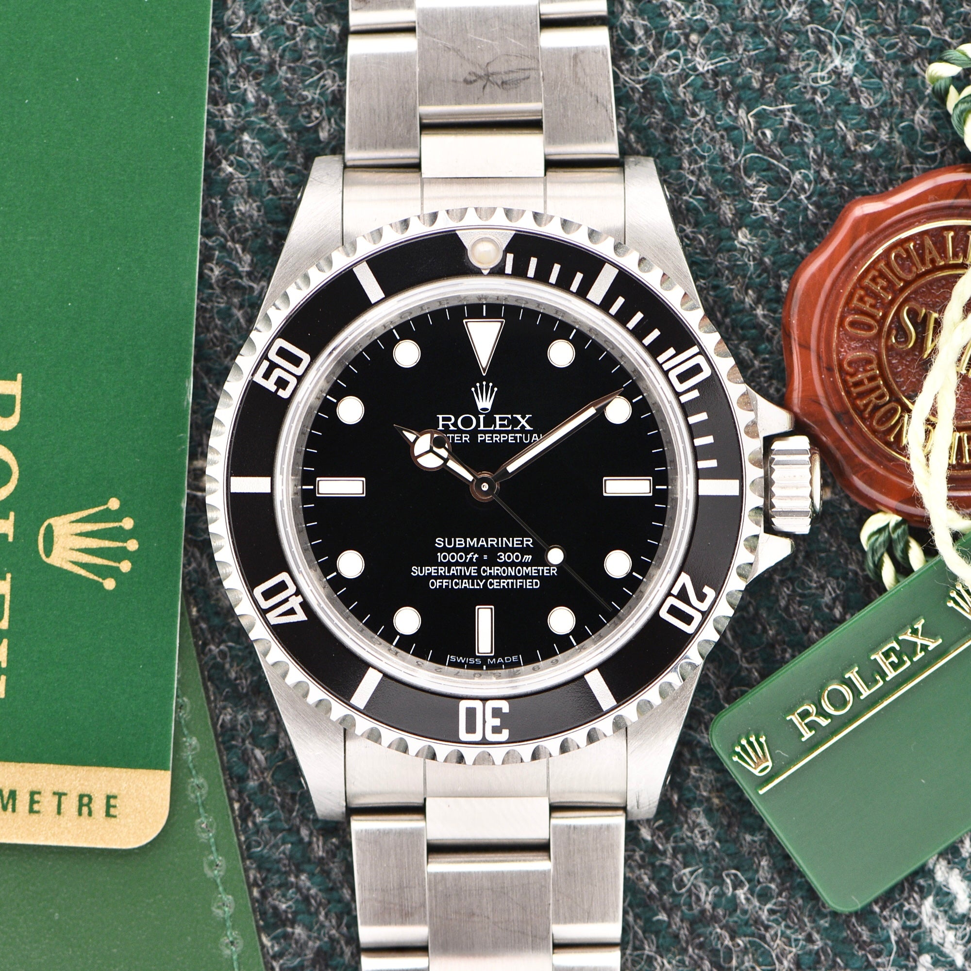 The reference 14060 started right around 1990 with an updated sapphire crystal and a few other changes brought to the no-date Submariner. The end of the production line was right around 2010. That means that is right at the tail-end of the reference and we can confirm that because of the rare scrambled serial number. Scrambled serials are normal for modern Rolex but when it comes to preceramic Submariners, there are very few with it, making this a pretty serious and rare collectors set.